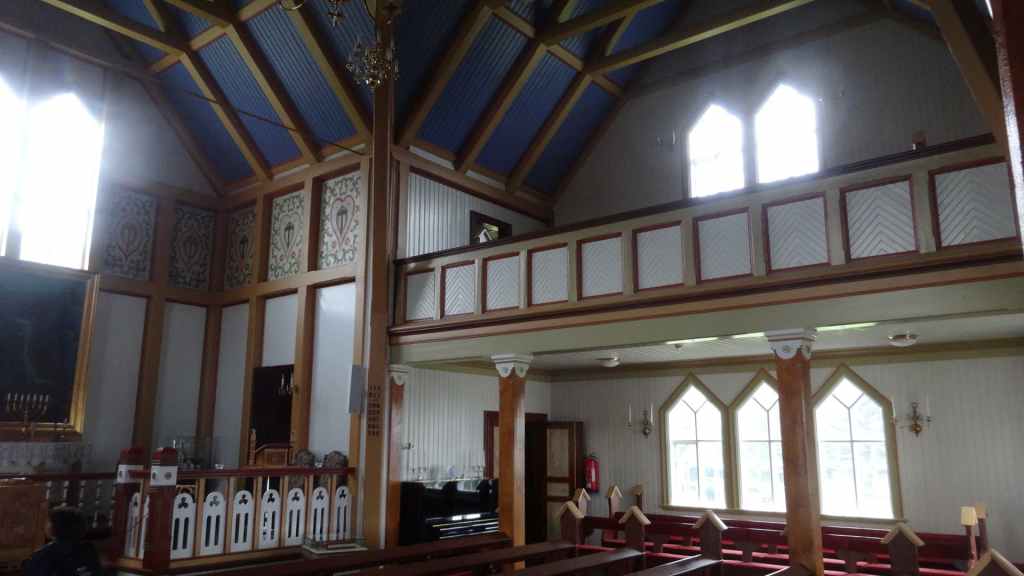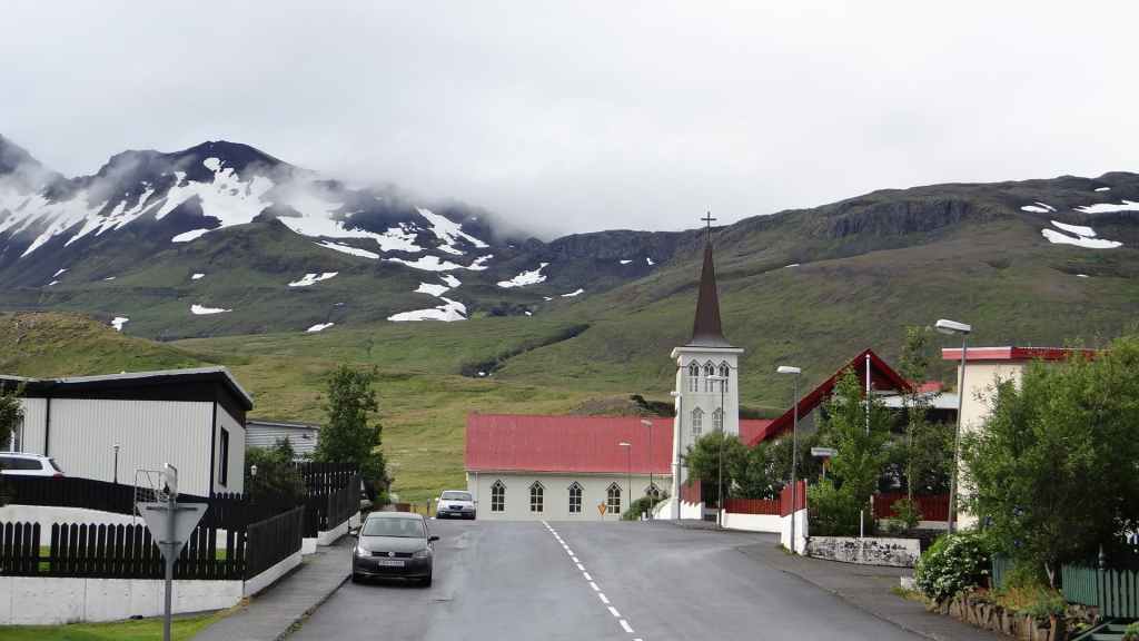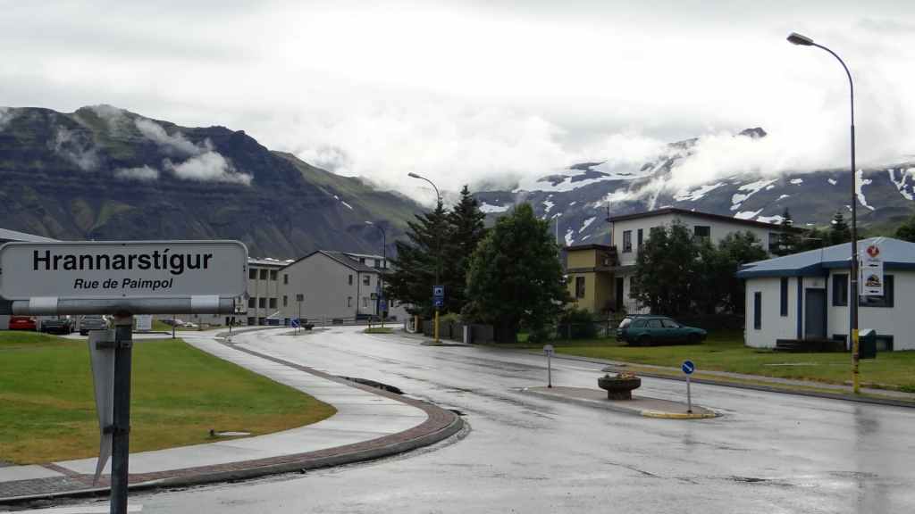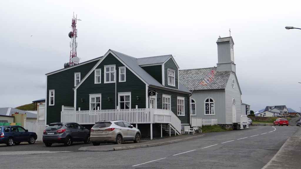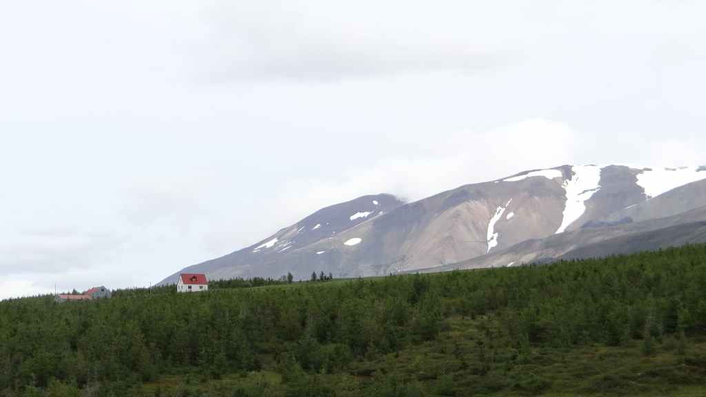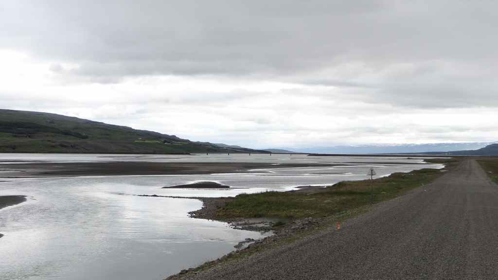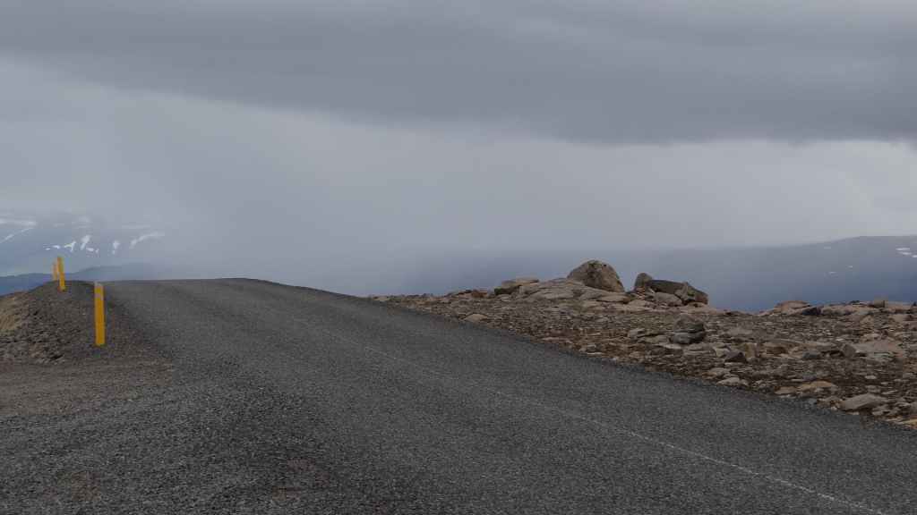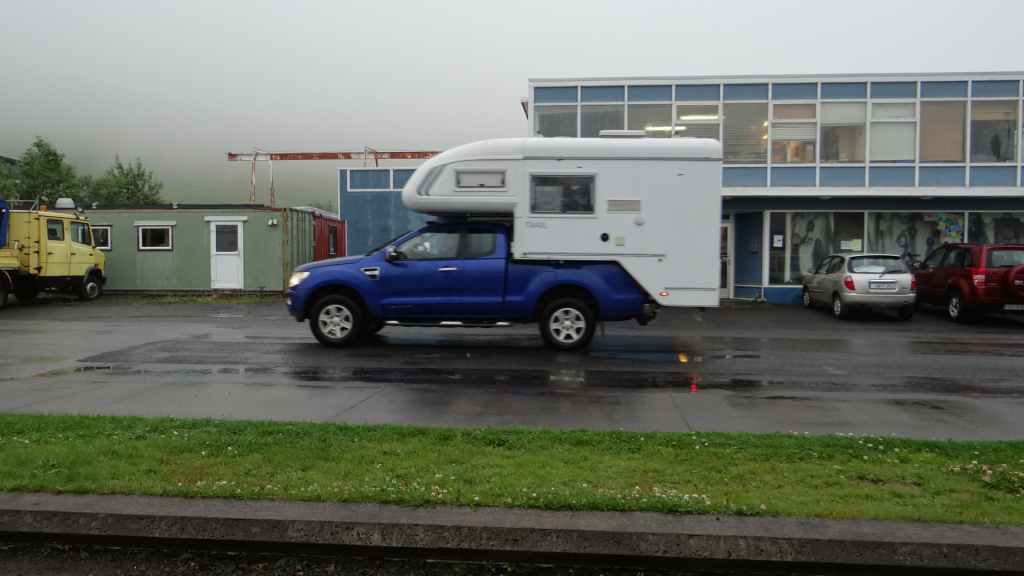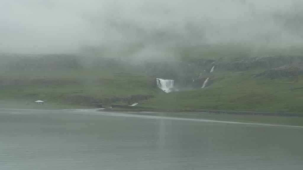 Malheureusement, le brouillard est toujours aussi épais et une pluie battante l’accompagne, pluie qui nous accompagnera toute la journée et la soirée… Nous reprenons donc la piste qui descend bien moins qu’elle a monté. Nous franchissons, pas trois mais tout de même un dernier gué, large mais peu profond. Puis nous rejoignons la route 910 que nous avions emprunté le premier jour. Nous remettons un peu de gas-oil à Hallormsstadur, le long du lac Lagarfljot, avant quelques courses à Egilsstadir. Nous franchissons le col qui nous ramène à Seydisfjordur toujours dans le brouillard et la pluie. Nous n’aurons finalement jamais vu, ni à l’aller ni au retour, ces paysages qui paraissent magnifiques. Nous avons décidé de débarrasser nos couronnes islandaises en achetant une bouteille de vin à la boutique Vinbudin, la seule chaîne autorisée par le gouvernement, à vendre de l’alcool très taxé. Puis nous errons dans le village pour trouver un parking où passer la nuit pour éviter le camping. Nous jetons notre dévolu sur le parking de l’office de tourisme sur lequel il n’est apparemment pas interdit de dormir. Mais nous sommes aussi à côté des entrepôts de Smyril Line, notre transporteur, et des bruits de moteur suffisamment forts nous poussent à déménager sur un autre parking vers 22h00 alors que nous sommes déjà au lit ! Et la nuit sera finalement calme…