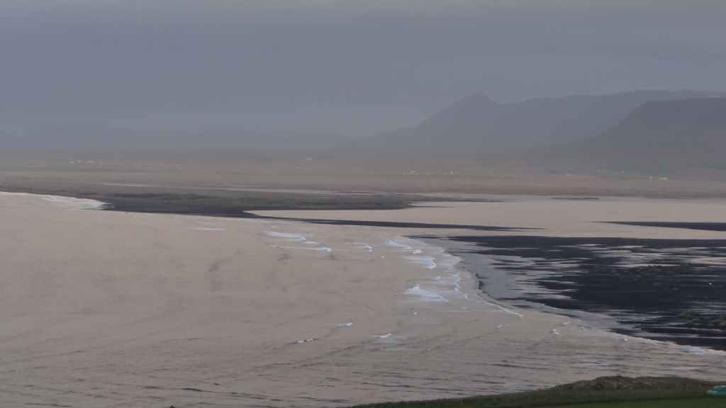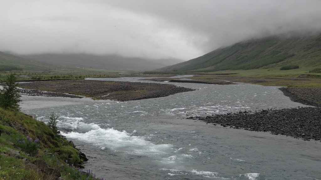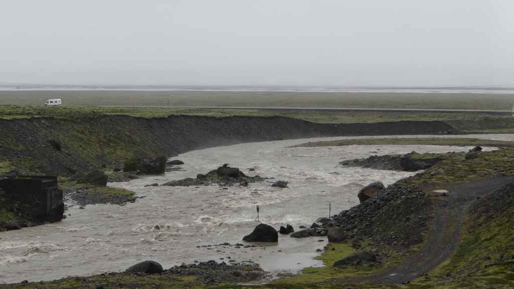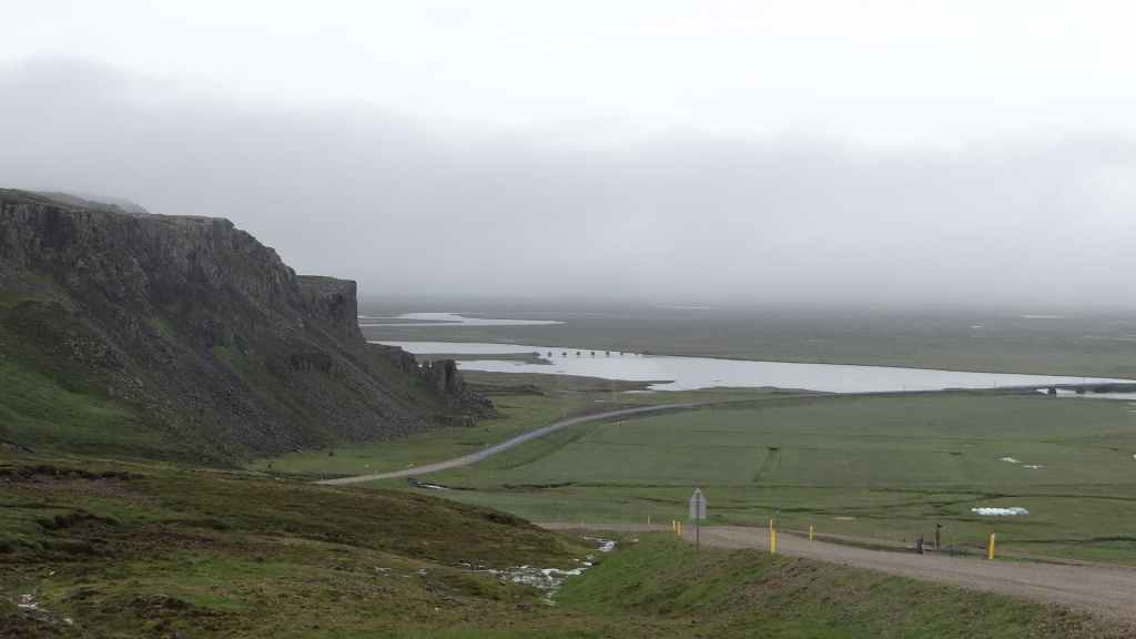 Nous nous rapprochons de l’exutoire du lac qui s’évacue vers la mer : nous avons la surprise de deviner, dans le brouillard qui s’est épaissi, un phoque qui s’ébat dans les eaux glaciales du lac. Mais il y a un temps pour tout et nous reprenons la route en faisant un petit arrêt « ravitaillement » à Höfn. Nous stoppons pour la nuit sur une piste près de Stafafell, sur un promontoire avec vue sur une rivière en crue (N 64°25.461 / W 14°53.121). Et il pleut toujours !