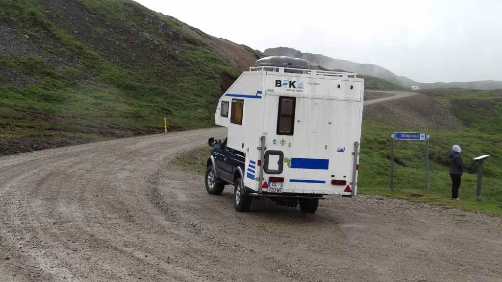 Nous passons la nuit sur un des parkings du site (N 64°18.492 / W 20°17.485). La pluie continue à tomber par intermittence. Plus de fuite dans les WC, mais ça coule toujours par le lanterneau…