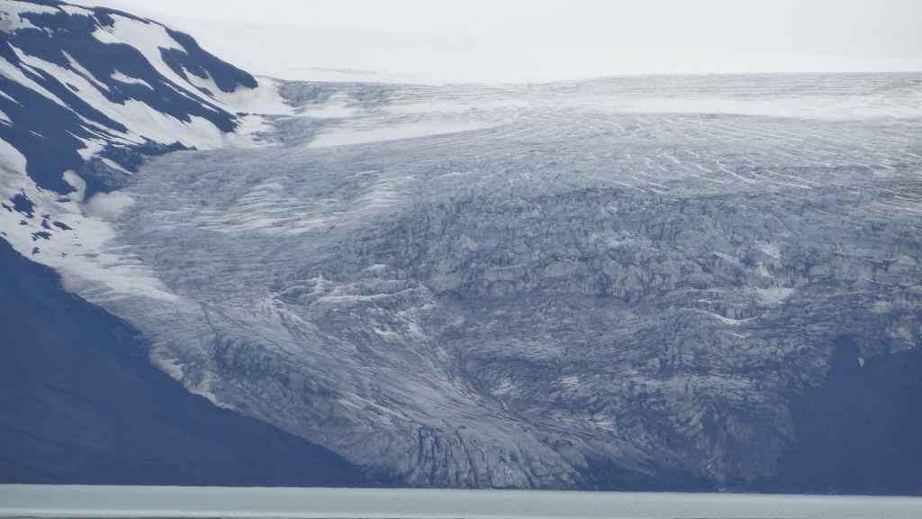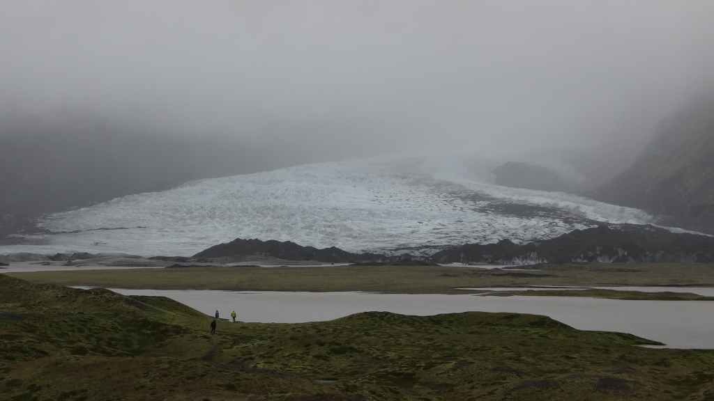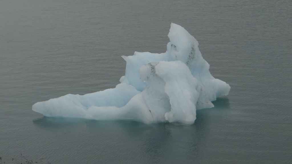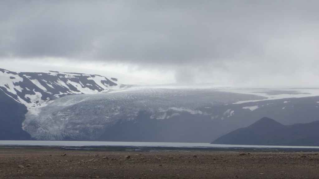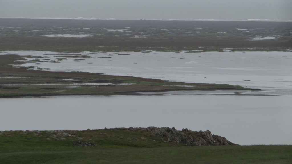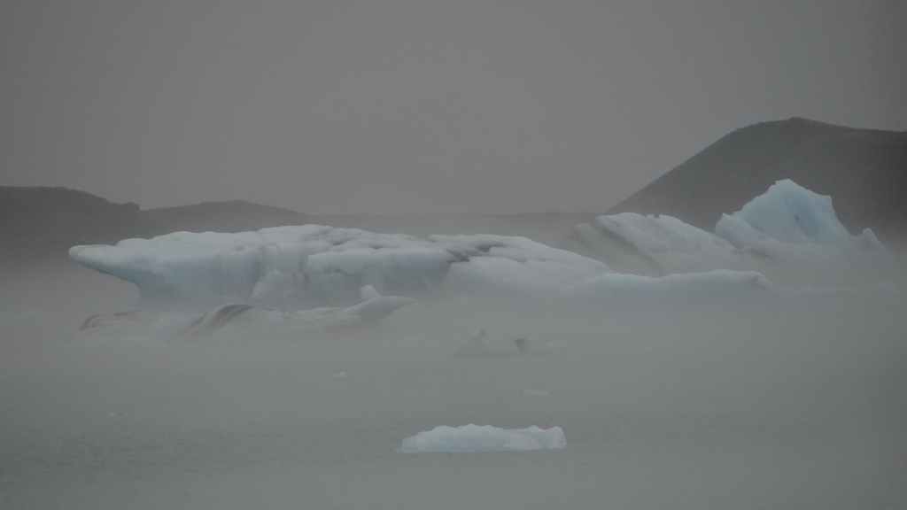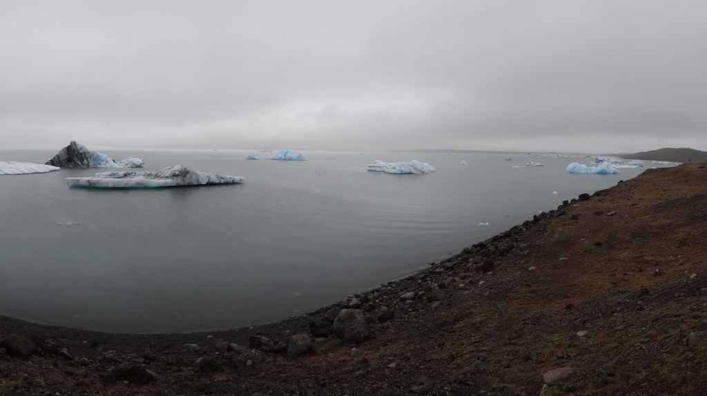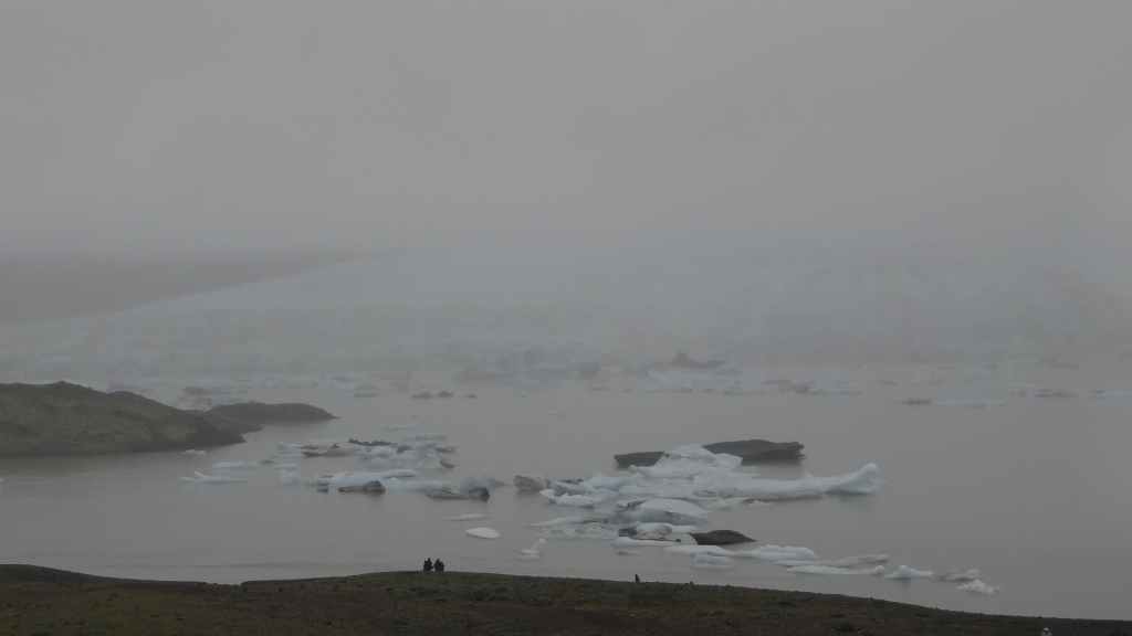 Nous abandonnons, avec amertume, l’idée d’aller au Laki : trop dangereux et aucune vue… Nous reprenons donc la route circulaire en direction du sud-est. Dans un village, nous prenons la météo qui confirme un temps pourri au sud et bien meilleur au nord-est. La pluie et le brouillard nous poursuivent toute la journée. Nous prenons tout de même le temps de nous arrêter auprès de 2 lacs glaciaires où nous avons l’impression de changer de continent et de nous aventurer dans l’Arctique !