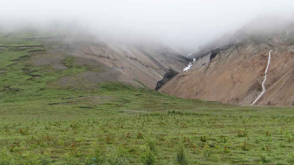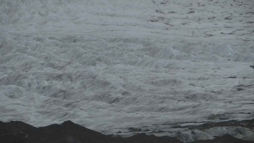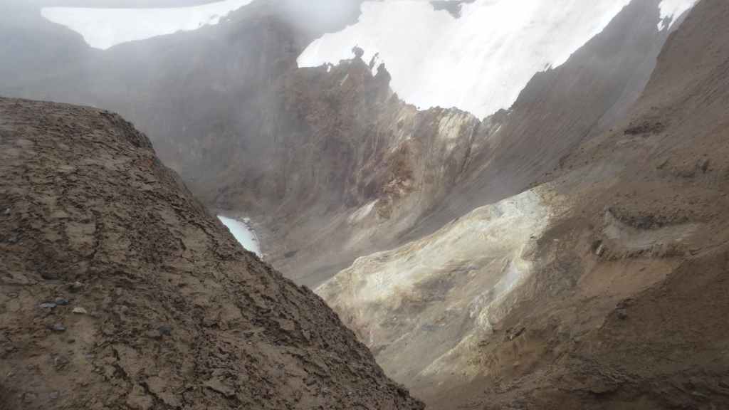Il a plu toute la nuit et il pleut encore au réveil. De plus, nous sommes toujours dans un épais brouillard. Heureusement, nous n’avons plus de gués à passer car les torrents glaciaires sont désormais très hauts et marrons.