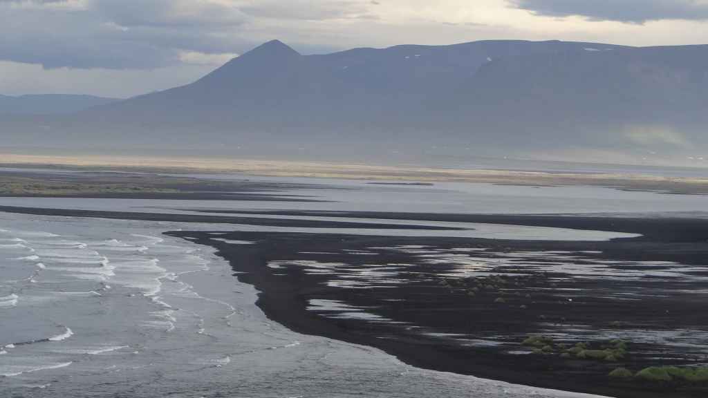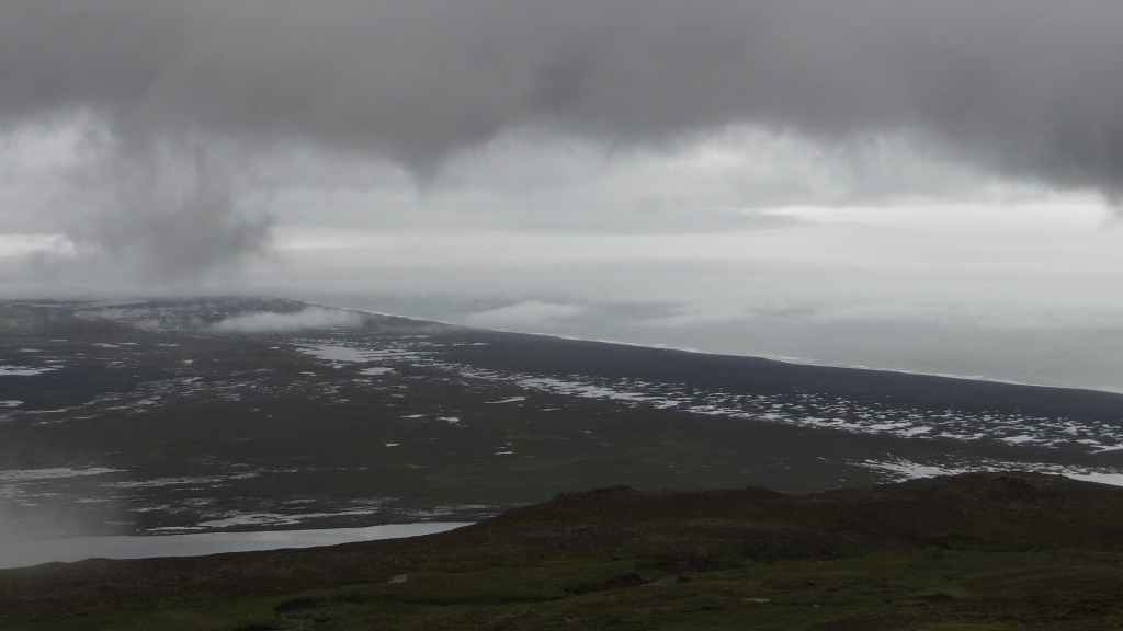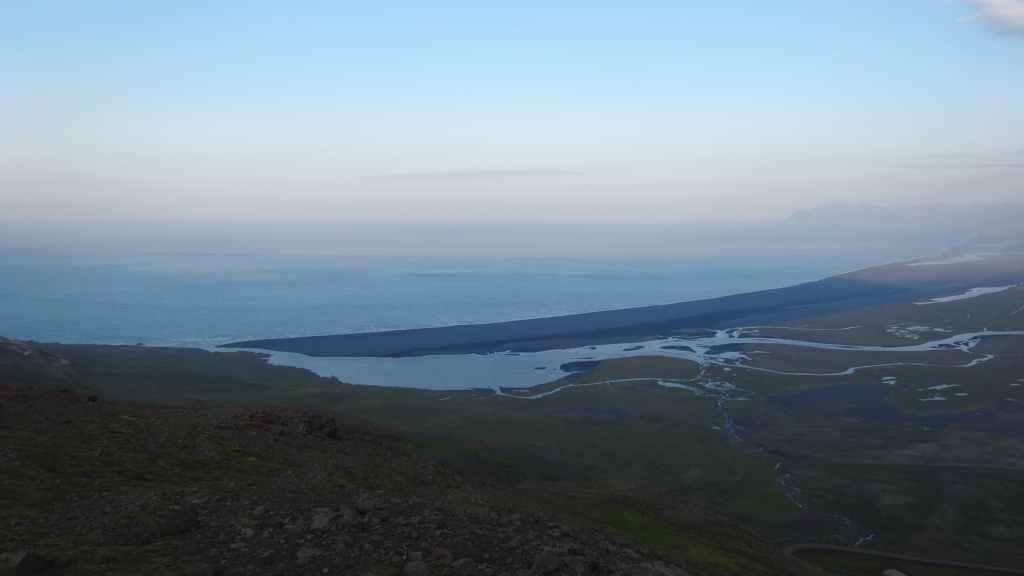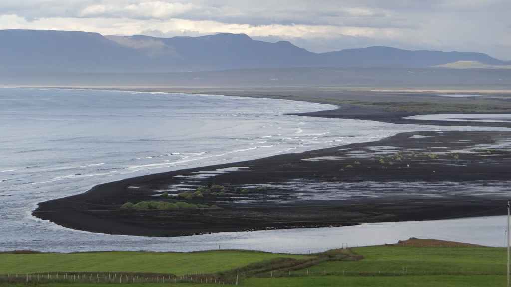 En attendant, on traverse des paysages de montagne entre 2 baies de la mer du Groenland. En fin de parcours, on retrouve une bonne piste et on se pose sur un magnifique point de vue, sur la mer et sur une plage de sable noir avec en fond d’écran des montagnes un peu enneigées et partiellement éclairées par le soleil rasant, peu après le lieu-dit Osar.