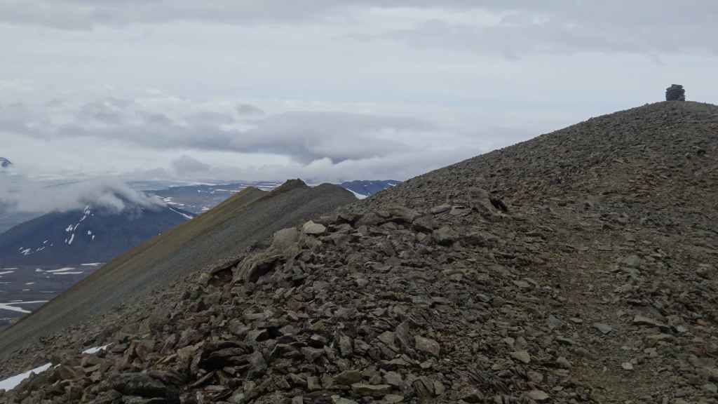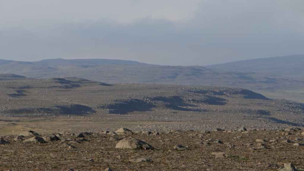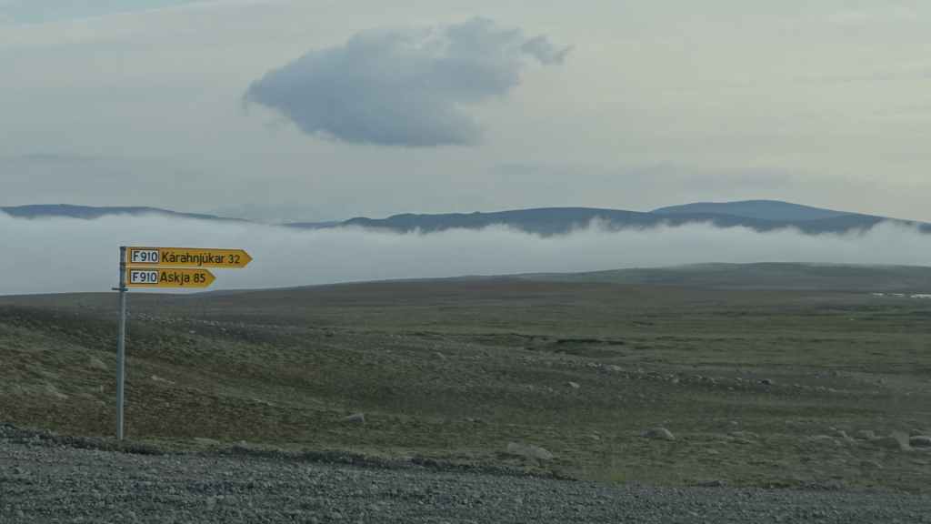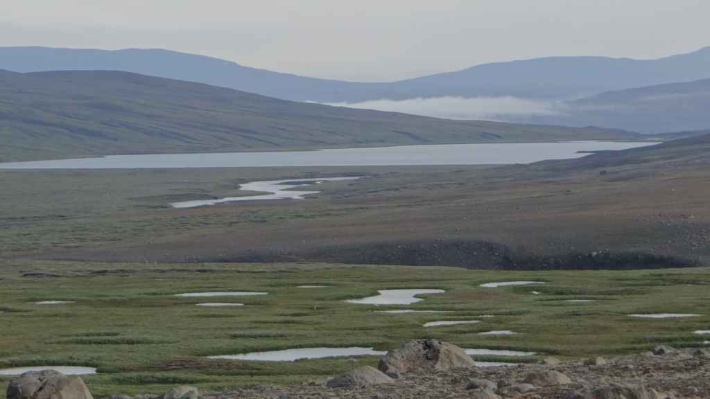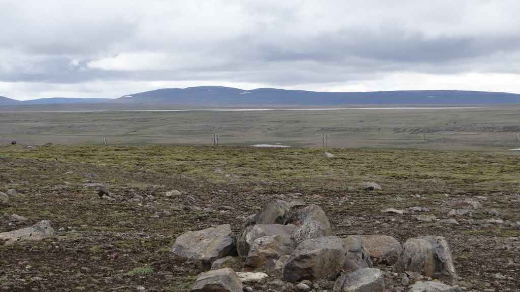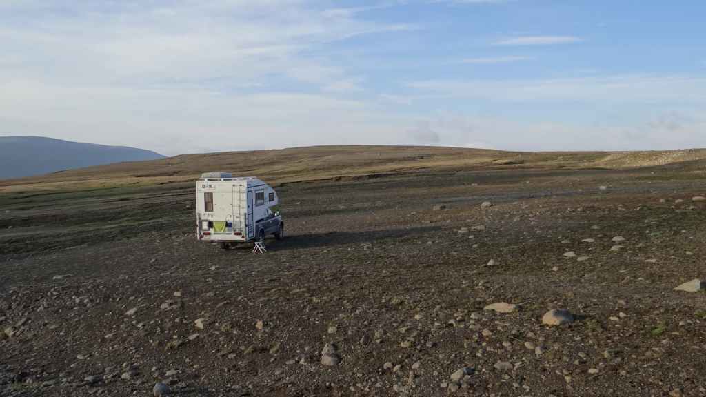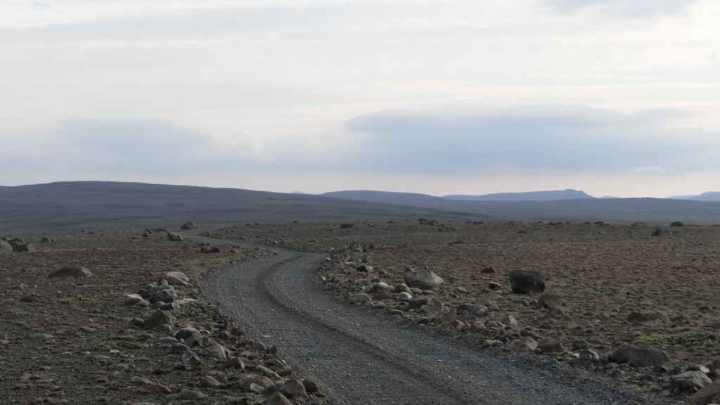 Ensuite, la piste, chaotique et bien pentue, s’élève au sommet d’une petite montagne : c’est ici que nous posons notre bivouac, sur une plate-forme un peu à l’écart de la piste (N 64°58.593 / W 15°33.585). Le soleil est encore présent peut-être une heure après notre arrivée, avant qu’un épais brouillard ne vienne nous ensevelir… Nous avons encore une grosse descente et trois gués à passer, alors nous espérons que cette mélasse disparaisse demain matin…