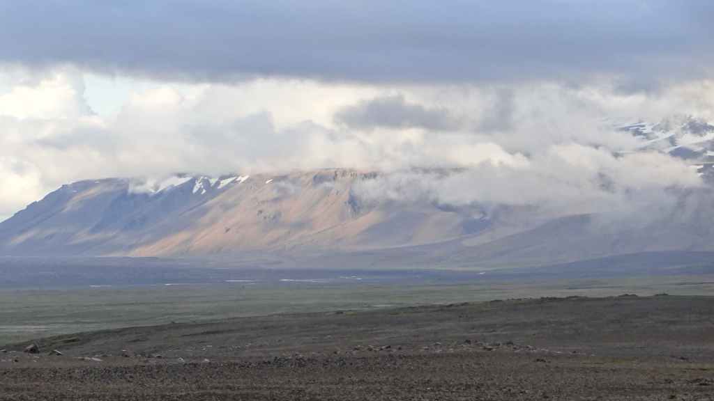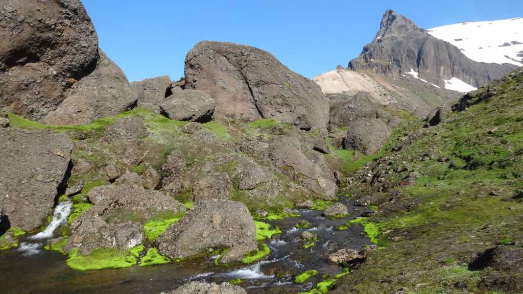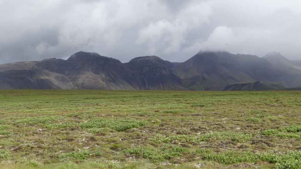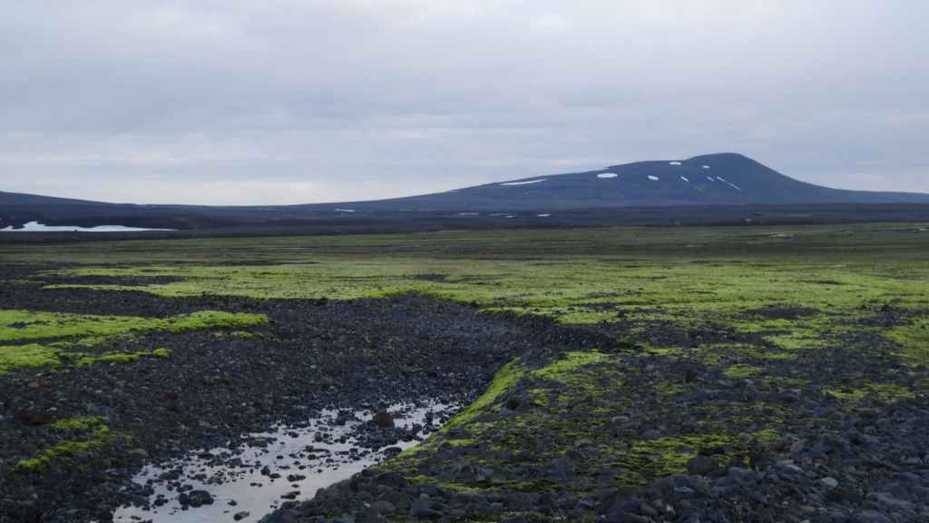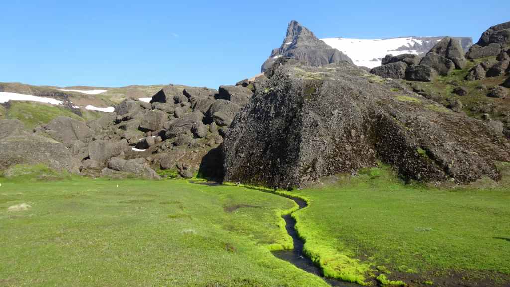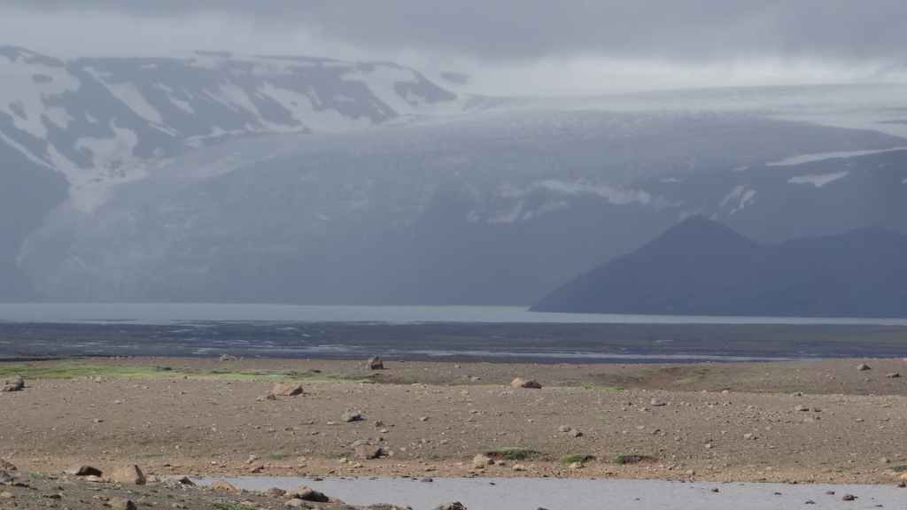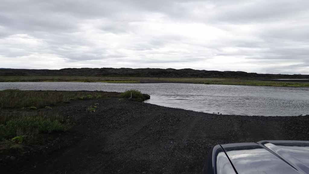 Nous repartons en direction du Snaefell, sommet que nous souhaitons grimper le lendemain. La route est d’abord goudronnée et traverse un plateau herbeux démesuré où paissent quelques moutons et où l’on peut apercevoir des rennes sauvages mais aujourd’hui sans succès. Puis arrive enfin la première vraie piste avec deux gués à franchir sur une douzaine de kilomètres. Nous voilà partis dans des paysages gris foncé égayés légèrement par de nombreuses plaques de neige, et parfois les fameuses mousses « fluos ». Les 2 gués sont assez faciles à passer, et nous arrivons sur le camping « Snaefell » du Parc National de Vatnajökull vers 17h. L’accueil du gardien est sympathique.