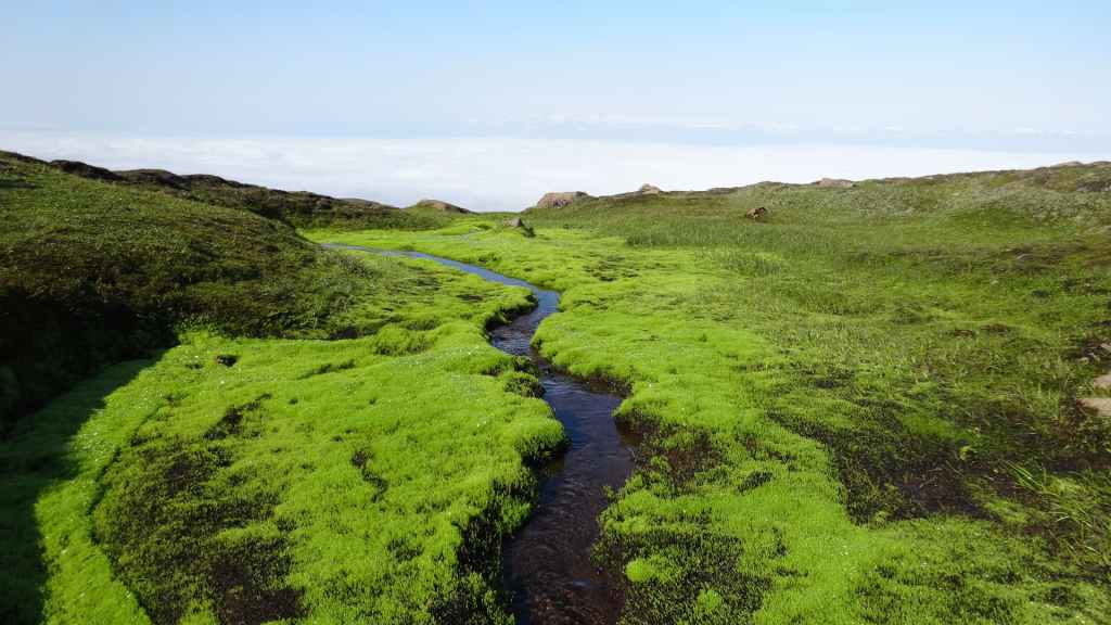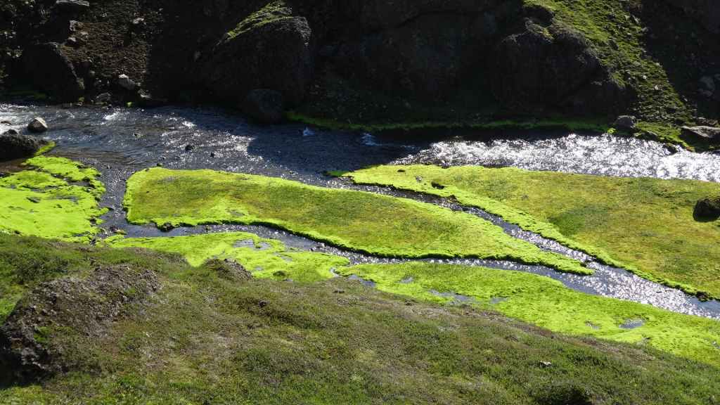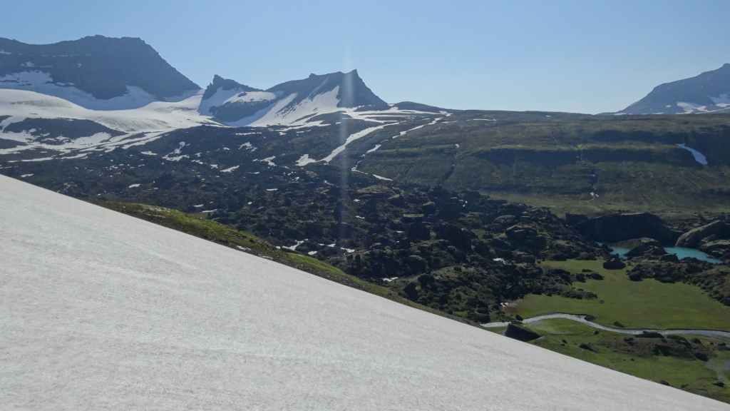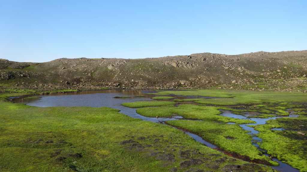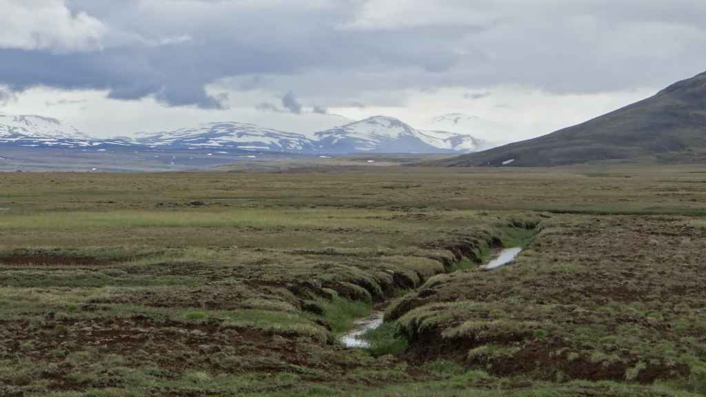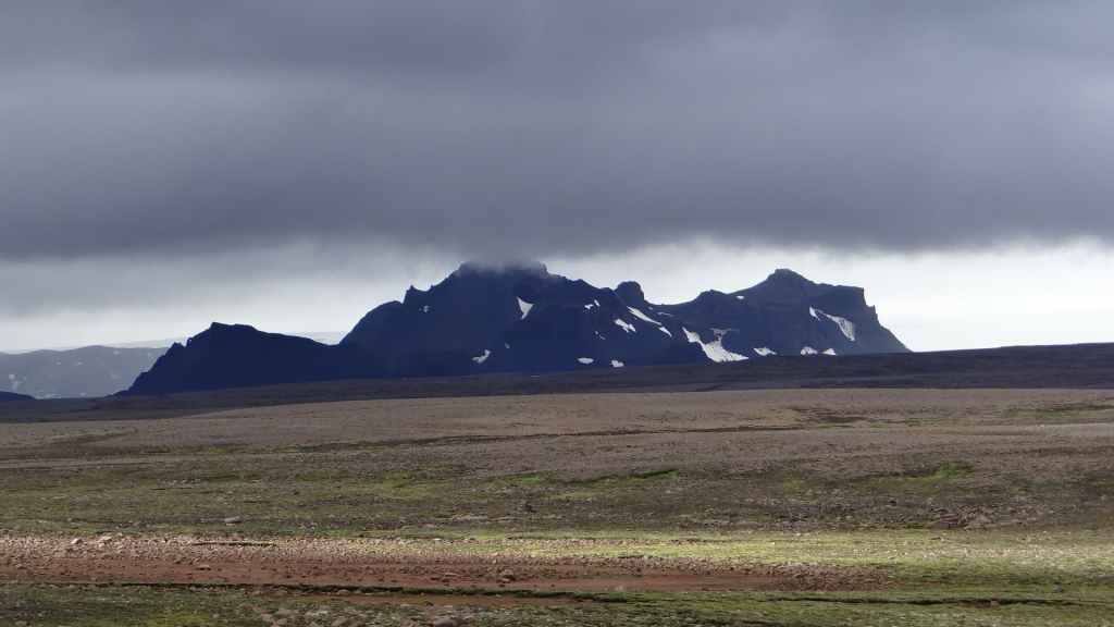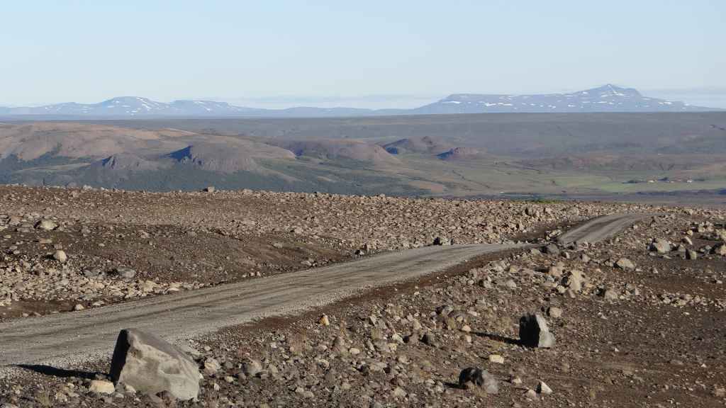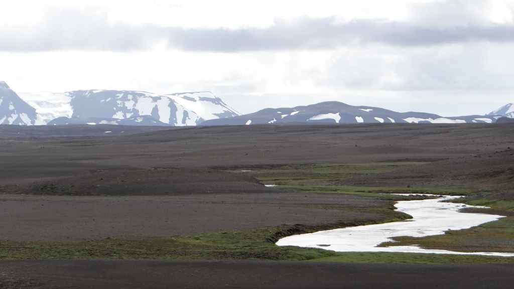 Nous repartons en direction du Snaefell, sommet que nous souhaitons grimper le lendemain. La route est d’abord goudronnée et traverse un plateau herbeux démesuré où paissent quelques moutons et où l’on peut apercevoir des rennes sauvages mais aujourd’hui sans succès. Puis arrive enfin la première vraie piste avec deux gués à franchir sur une douzaine de kilomètres. Nous voilà partis dans des paysages gris foncé égayés légèrement par de nombreuses plaques de neige, et parfois les fameuses mousses « fluos ». Les 2 gués sont assez faciles à passer, et nous arrivons sur le camping « Snaefell » du Parc National de Vatnajökull vers 17h. L’accueil du gardien est sympathique.