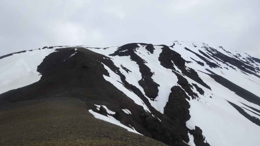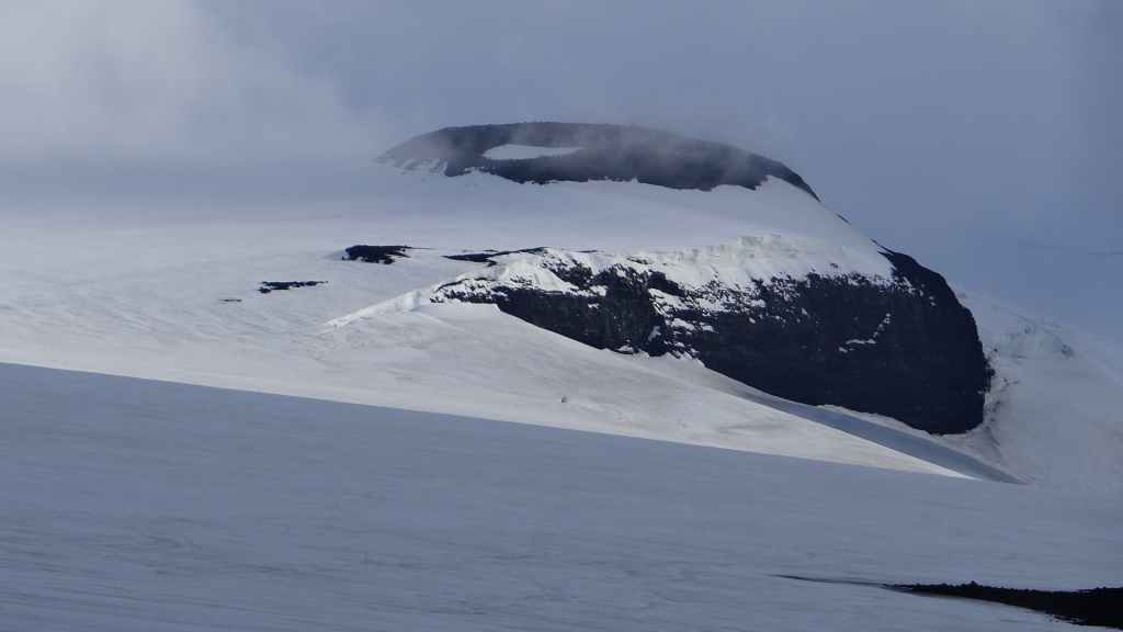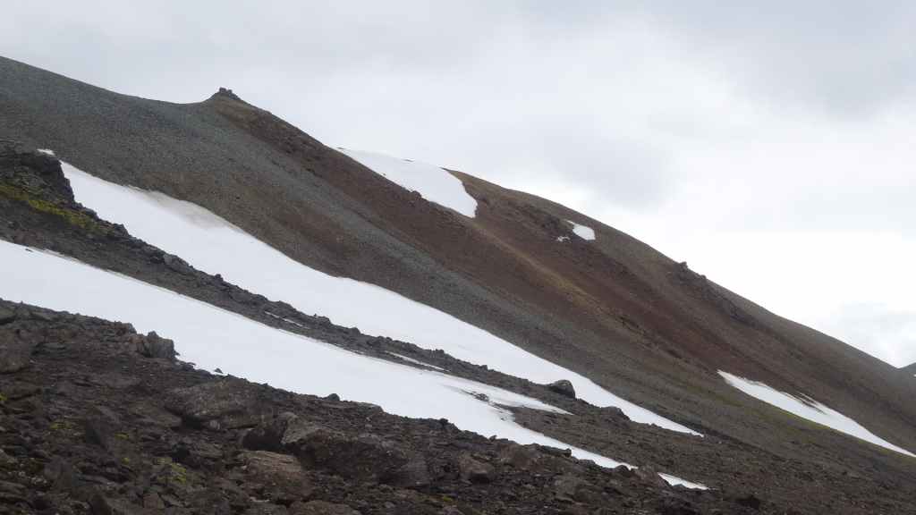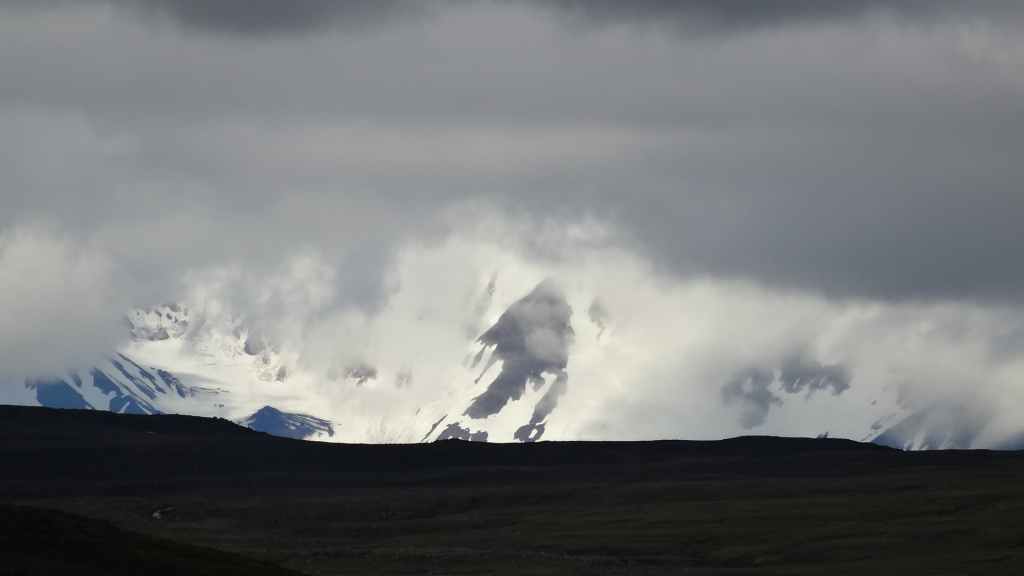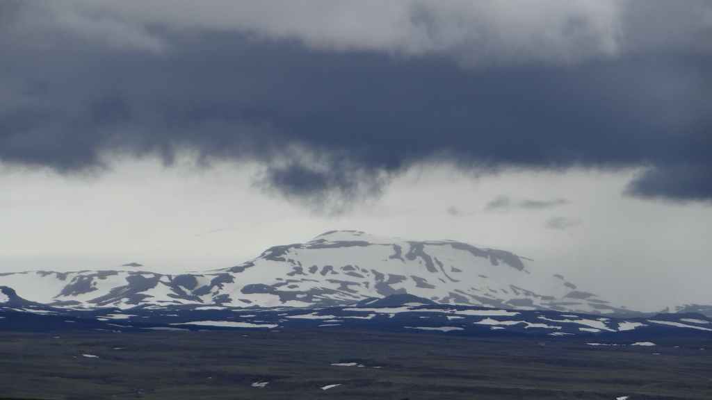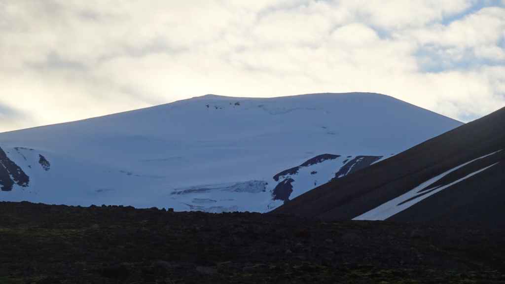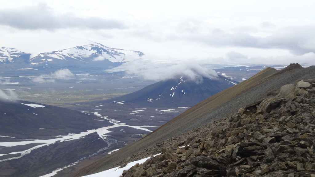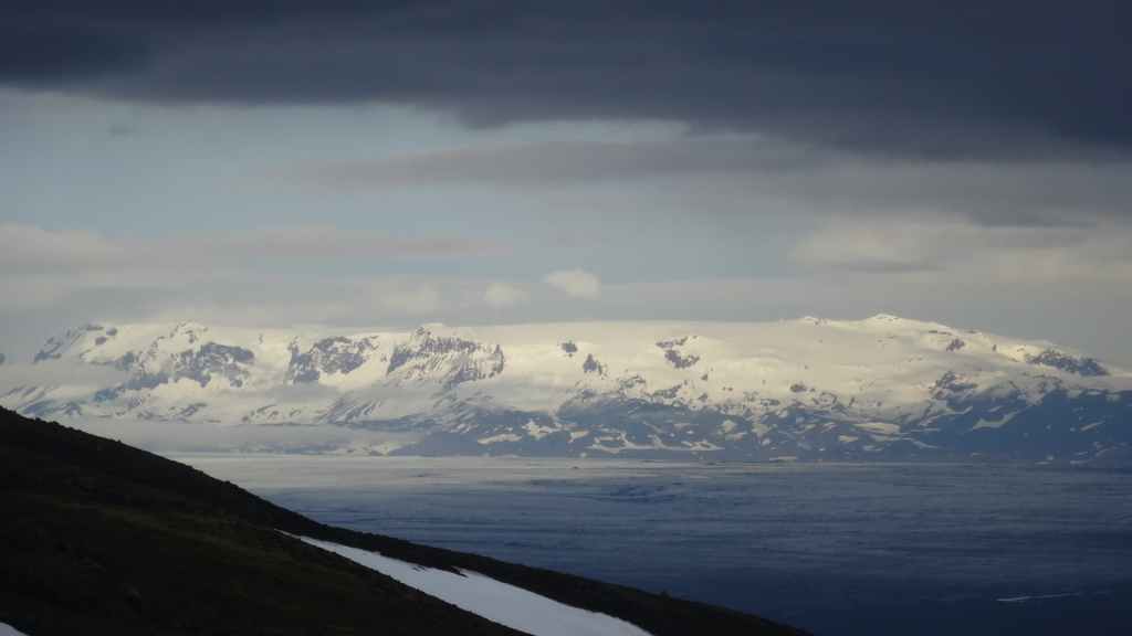Lever à 4h du matin pour commencer notre randonnée à 5h. Nous avons un peu plus de 1000 m à gravir. Il fait grand jour et le plafond nuageux est assez élevé ; il y a même quelques éclaircies ! Les crampons sont dans le sac car les 300 derniers mètres du Snaefell sont en glace et neige. Le début de l’ascension est long mais tranquille mais la pente s’accentue progressivement. Les premiers névés apparaissent et nous atteignons un col à 1300 m. La vue sur les sommets environnants ainsi que sur le glacier géant du Vatnajökull est très belle, malgré les nuages qui arrivent de l’est. Nous grimpons une pente très raide qui nous mène à 1500 m au pied du glacier, mais les nuages ont pris de l’ampleur et nous plongent dans un brouillard épais. La sagesse nous pousse à renoncer avec toutefois quelques regrets.