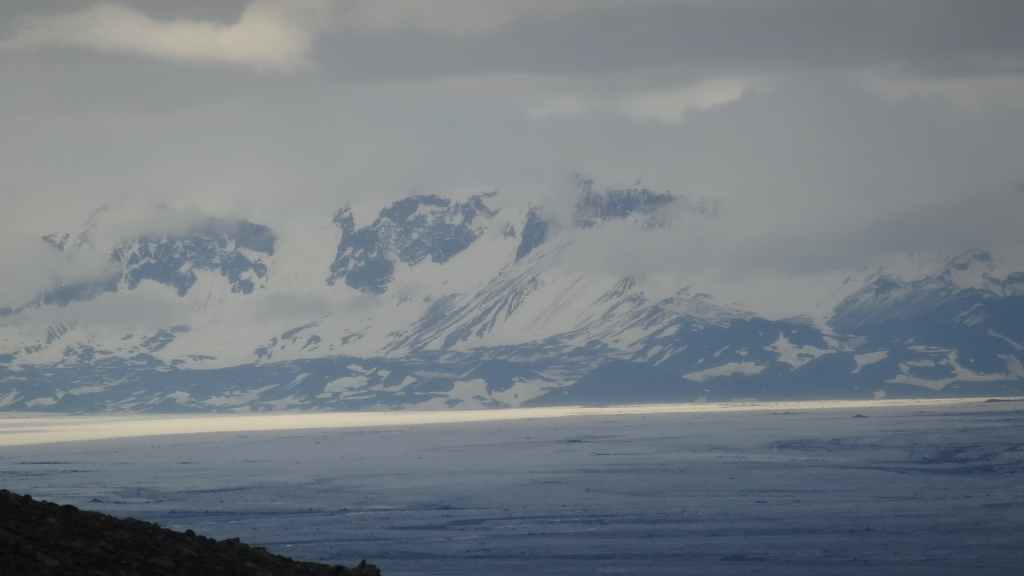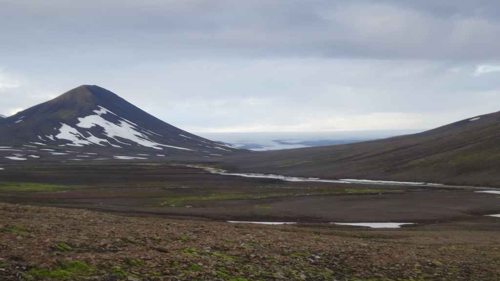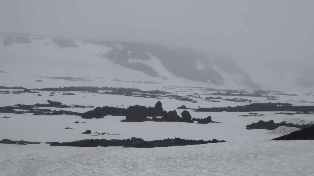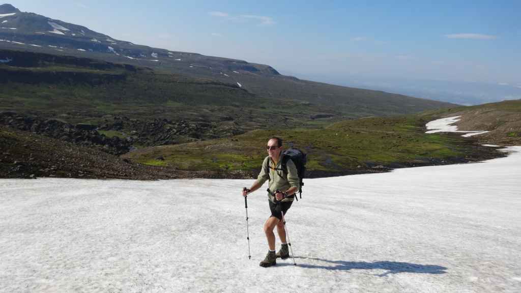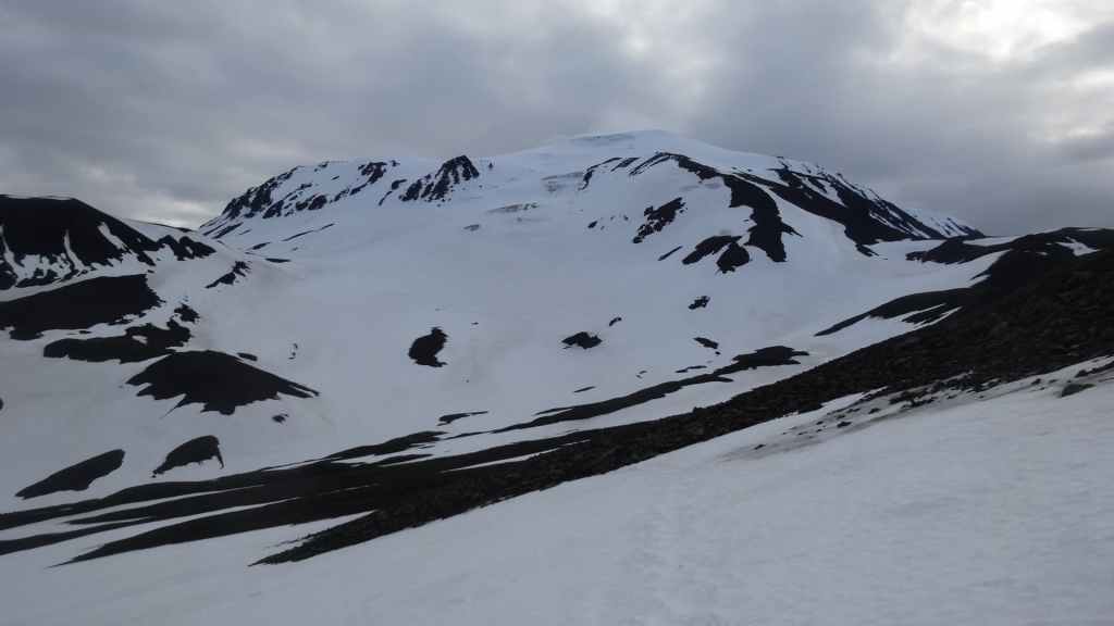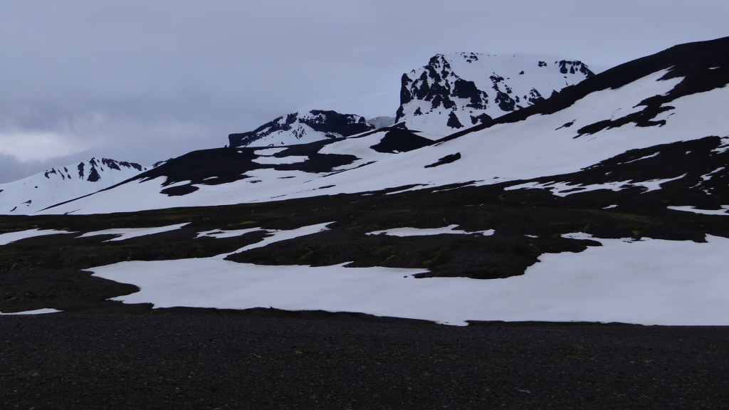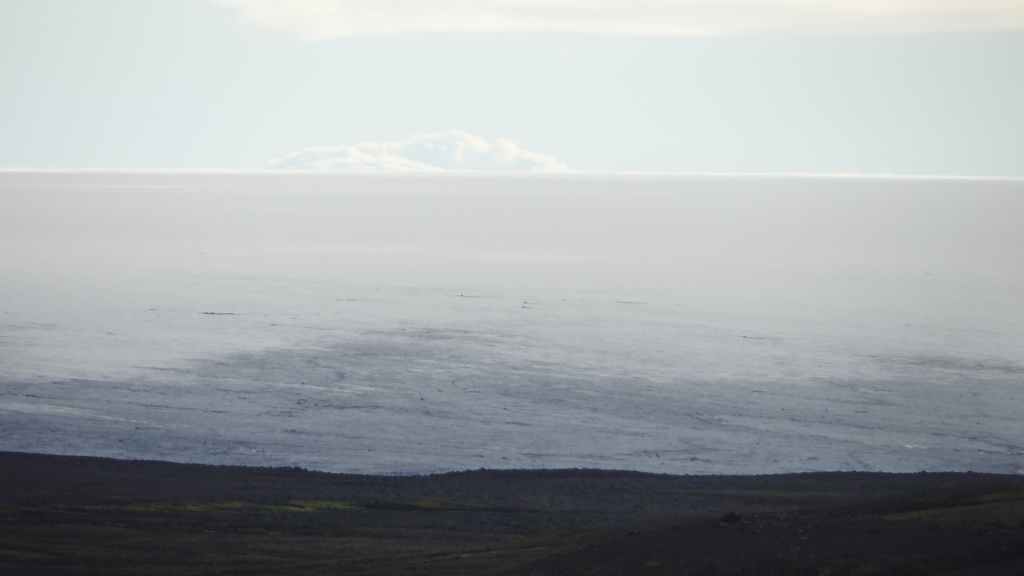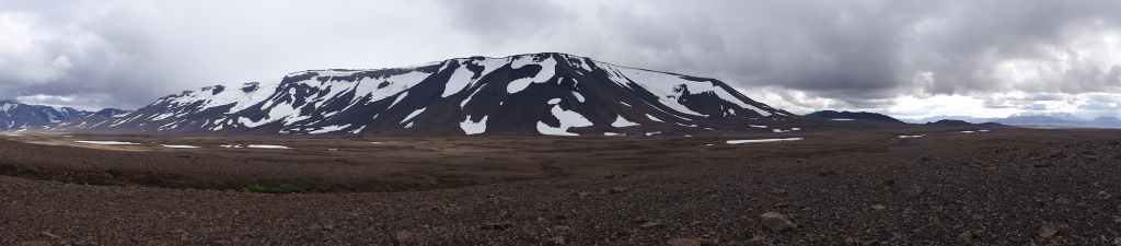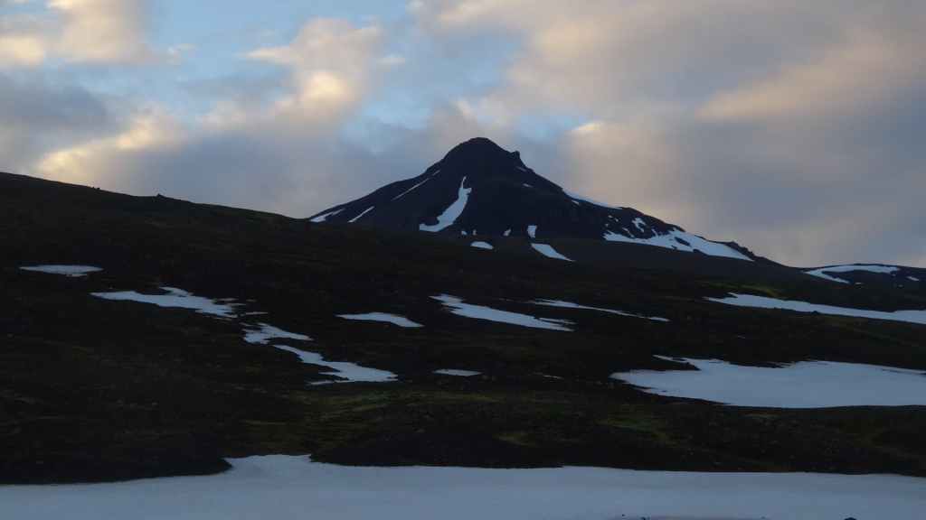 Lever à 4h du matin pour commencer notre randonnée à 5h. Nous avons un peu plus de 1000 m à gravir. Il fait grand jour et le plafond nuageux est assez élevé ; il y a même quelques éclaircies ! Les crampons sont dans le sac car les 300 derniers mètres du Snaefell sont en glace et neige. Le début de l’ascension est long mais tranquille mais la pente s’accentue progressivement. Les premiers névés apparaissent et nous atteignons un col à 1300 m. La vue sur les sommets environnants ainsi que sur le glacier géant du Vatnajökull est très belle, malgré les nuages qui arrivent de l’est. Nous grimpons une pente très raide qui nous mène à 1500 m au pied du glacier, mais les nuages ont pris de l’ampleur et nous plongent dans un brouillard épais. La sagesse nous pousse à renoncer avec toutefois quelques regrets.