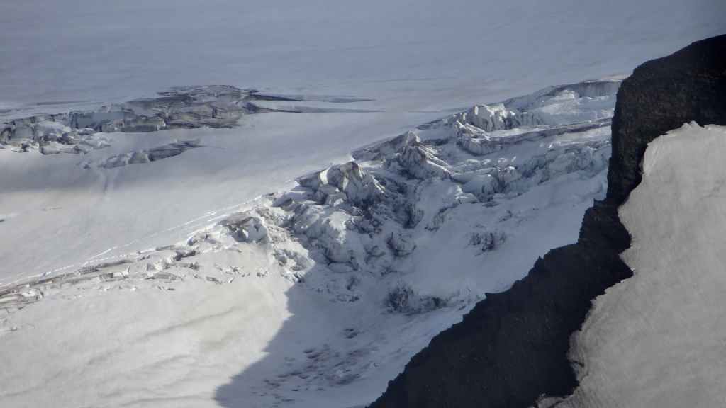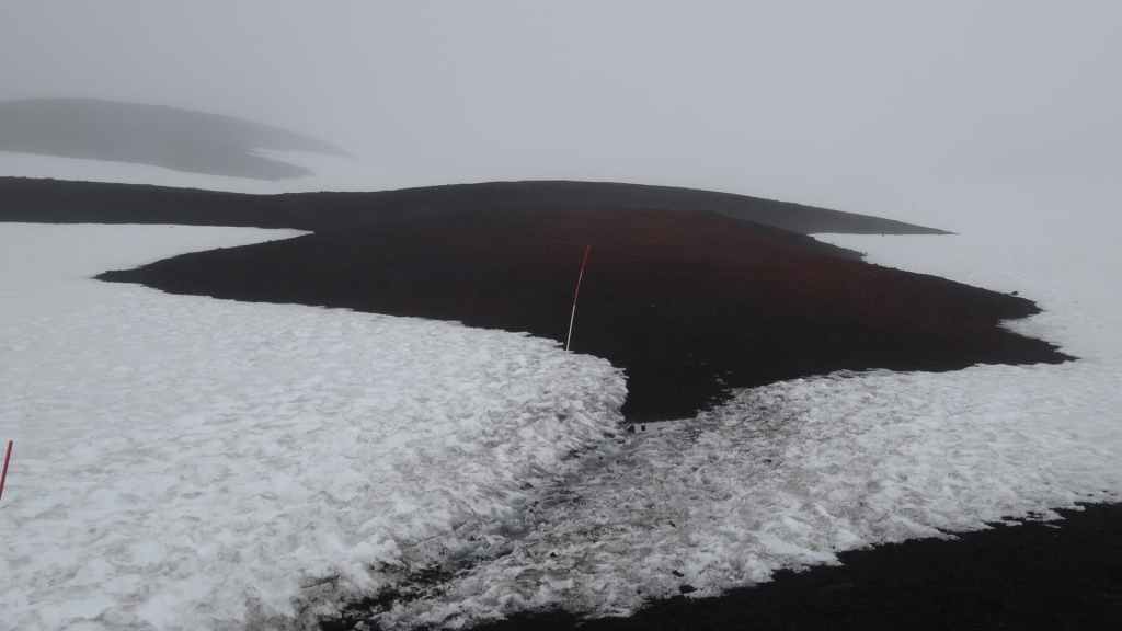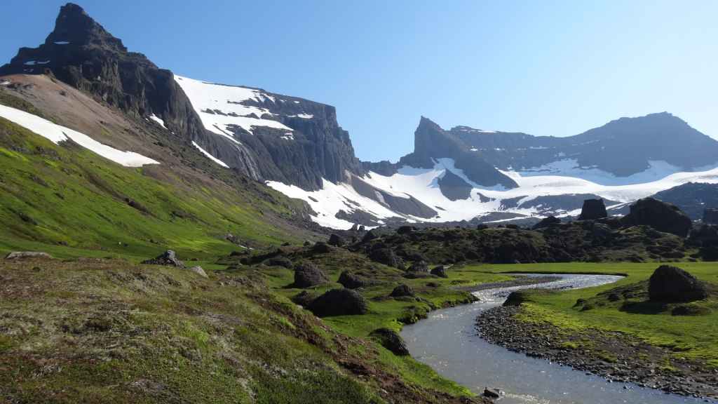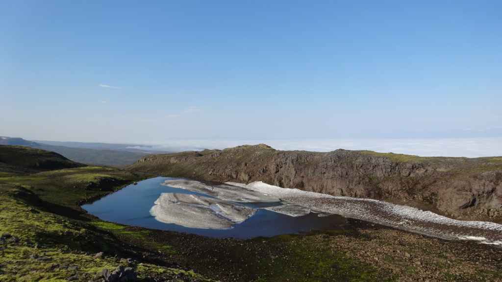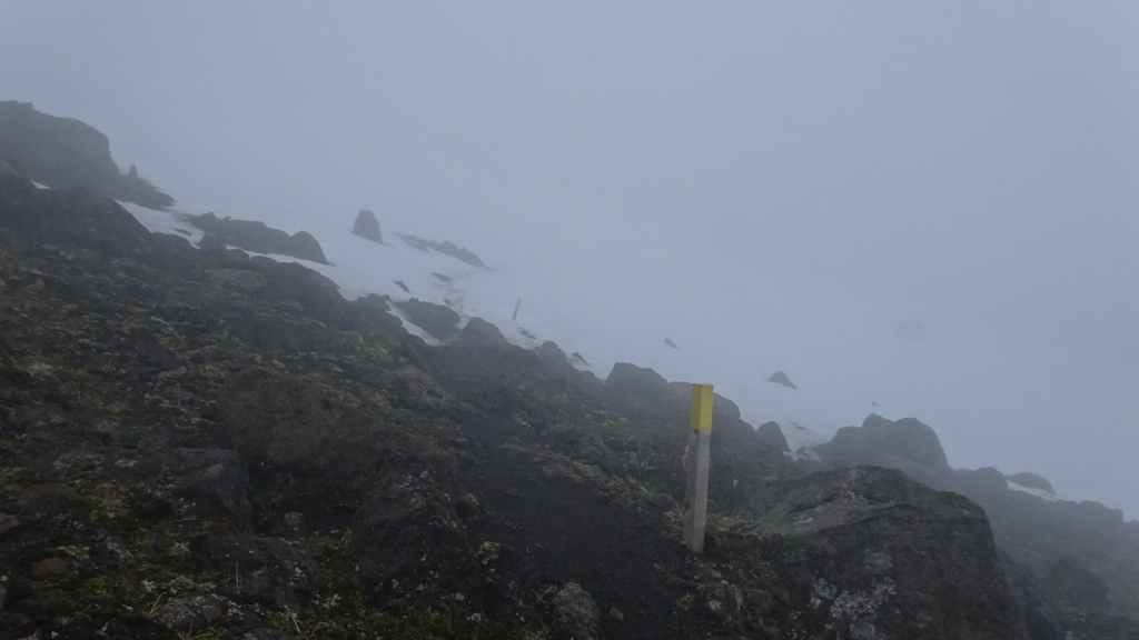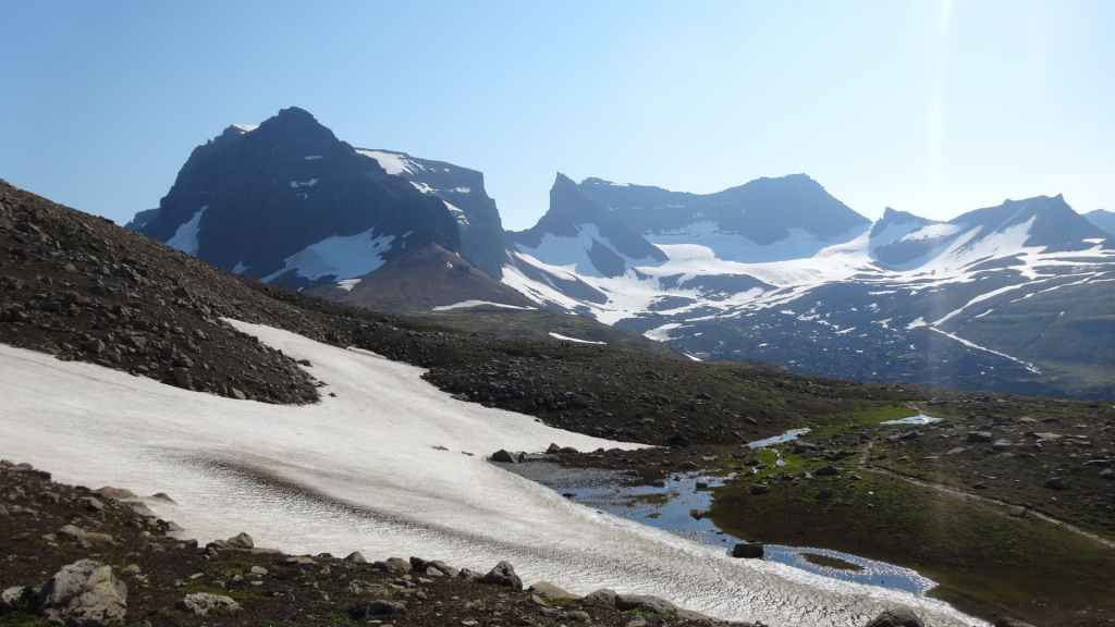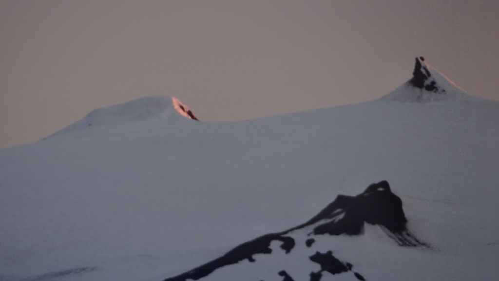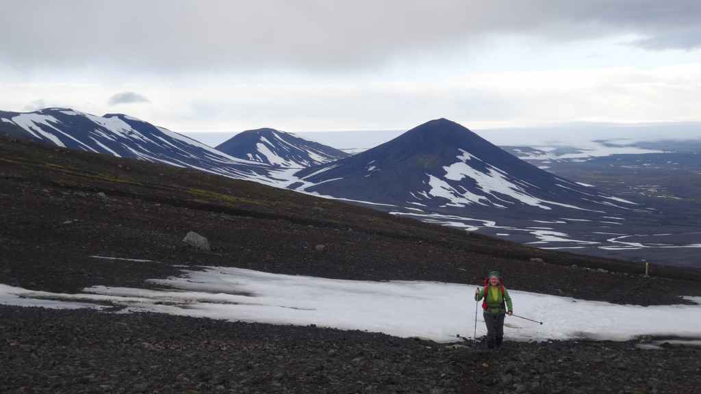Lever à 4h du matin pour commencer notre randonnée à 5h. Nous avons un peu plus de 1000 m à gravir. Il fait grand jour et le plafond nuageux est assez élevé ; il y a même quelques éclaircies ! Les crampons sont dans le sac car les 300 derniers mètres du Snaefell sont en glace et neige. Le début de l’ascension est long mais tranquille mais la pente s’accentue progressivement. Les premiers névés apparaissent et nous atteignons un col à 1300 m. La vue sur les sommets environnants ainsi que sur le glacier géant du Vatnajökull est très belle, malgré les nuages qui arrivent de l’est. Nous grimpons une pente très raide qui nous mène à 1500 m au pied du glacier, mais les nuages ont pris de l’ampleur et nous plongent dans un brouillard épais. La sagesse nous pousse à renoncer avec toutefois quelques regrets.