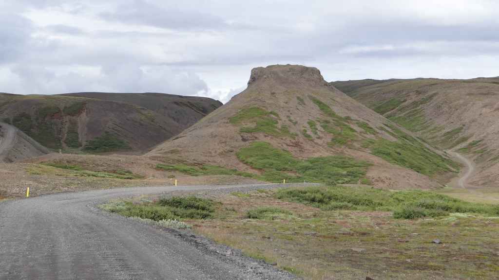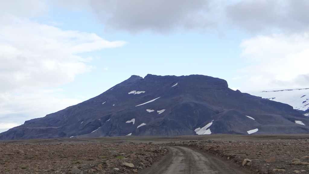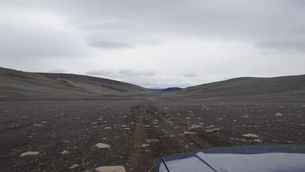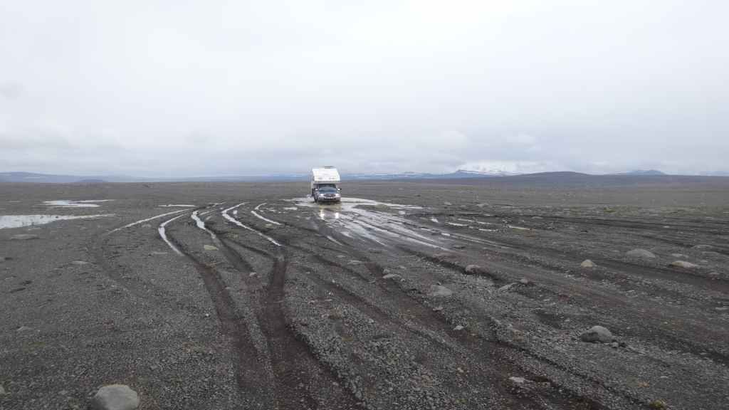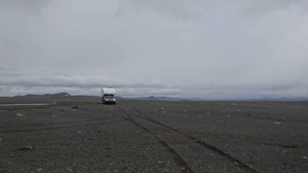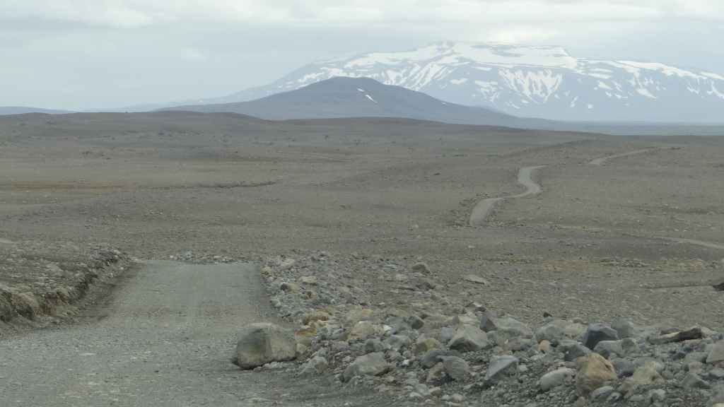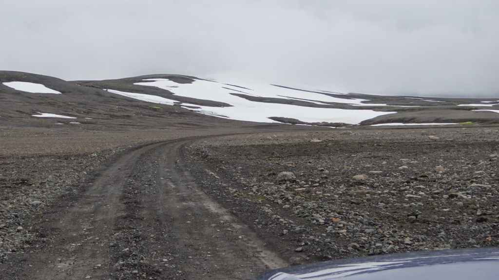 Réveil à 5h00 ! Les prévisions sont légèrement meilleures alors, nous décidons finalement de partir pour le Mannalaugar et nous verrons bien sur place… Après la route 26 goudronnée en grande partie, nous prenons la piste F208 qui redescend vers le sud. D’abord très mauvaise, cette piste s’améliore en deuxième partie, mais la moyenne horaire est très lente avec notre tortue.