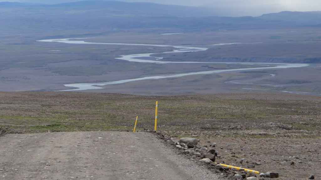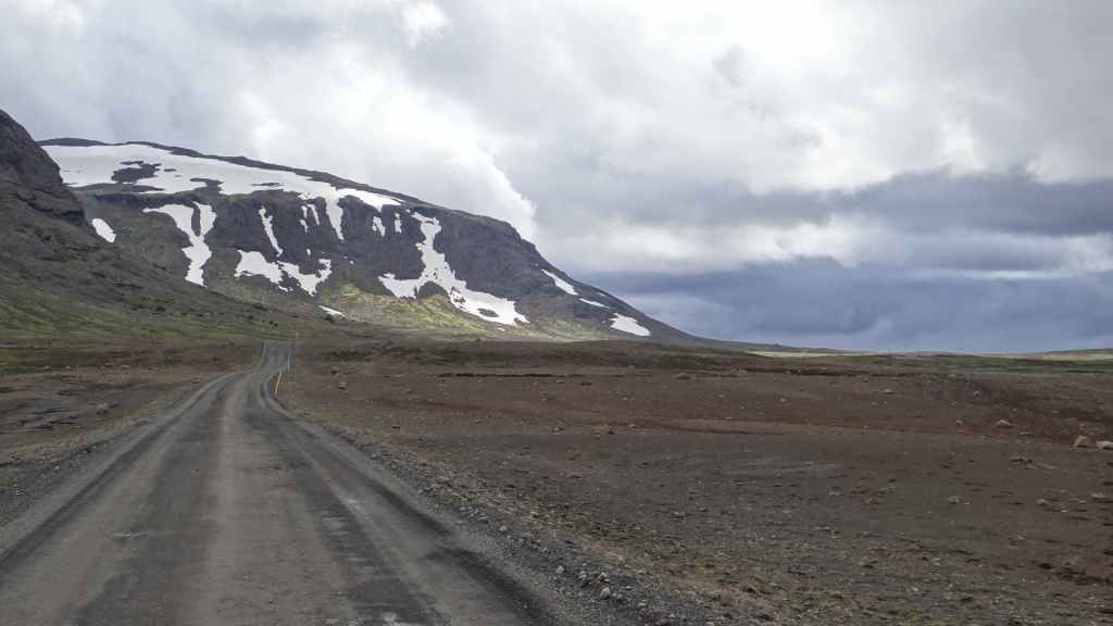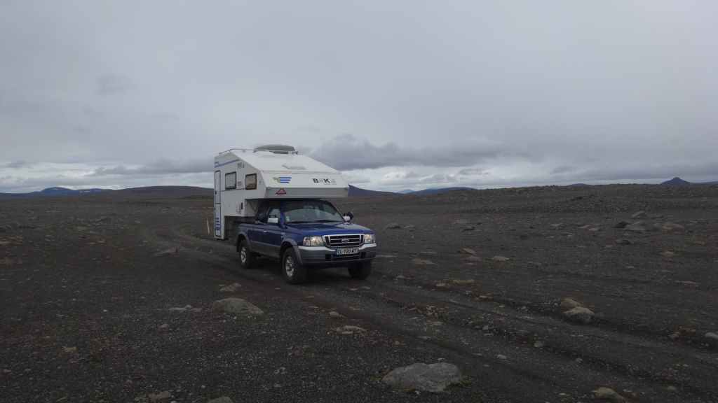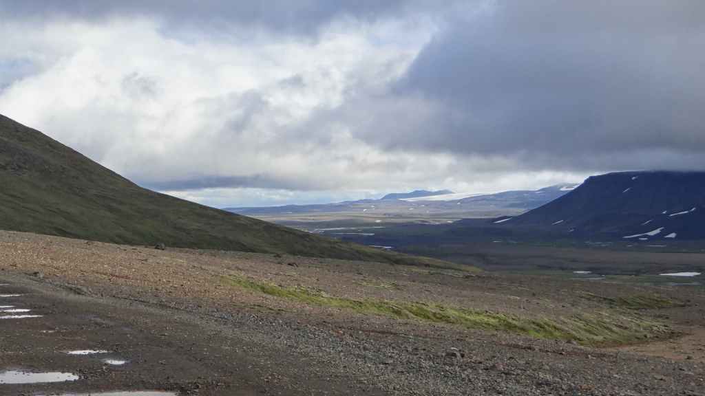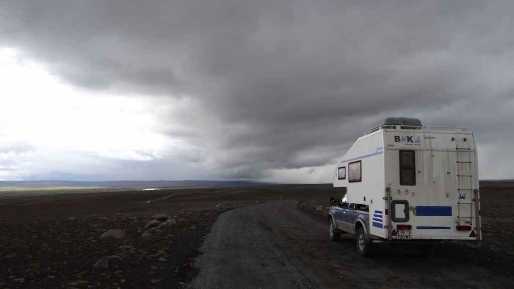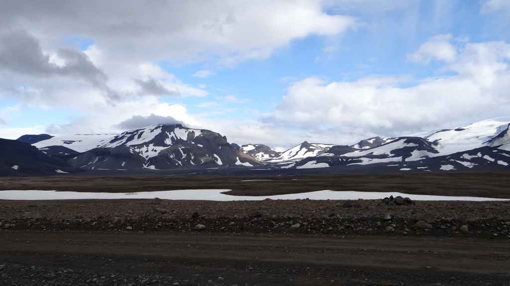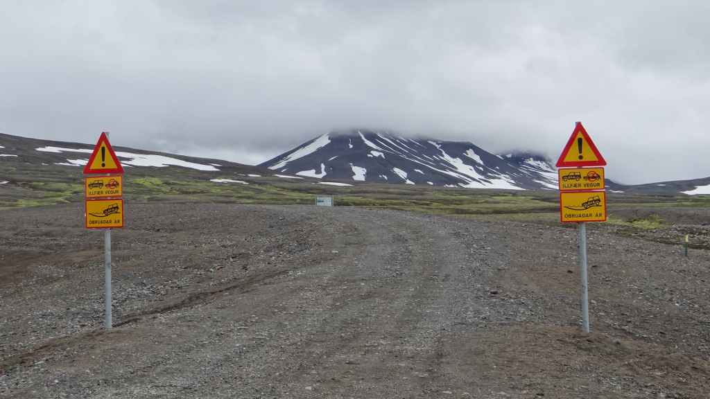Réveil à 5h00 ! Les prévisions sont légèrement meilleures alors, nous décidons finalement de partir pour le Mannalaugar et nous verrons bien sur place… Après la route 26 goudronnée en grande partie, nous prenons la piste F208 qui redescend vers le sud. D’abord très mauvaise, cette piste s’améliore en deuxième partie, mais la moyenne horaire est très lente avec notre tortue.