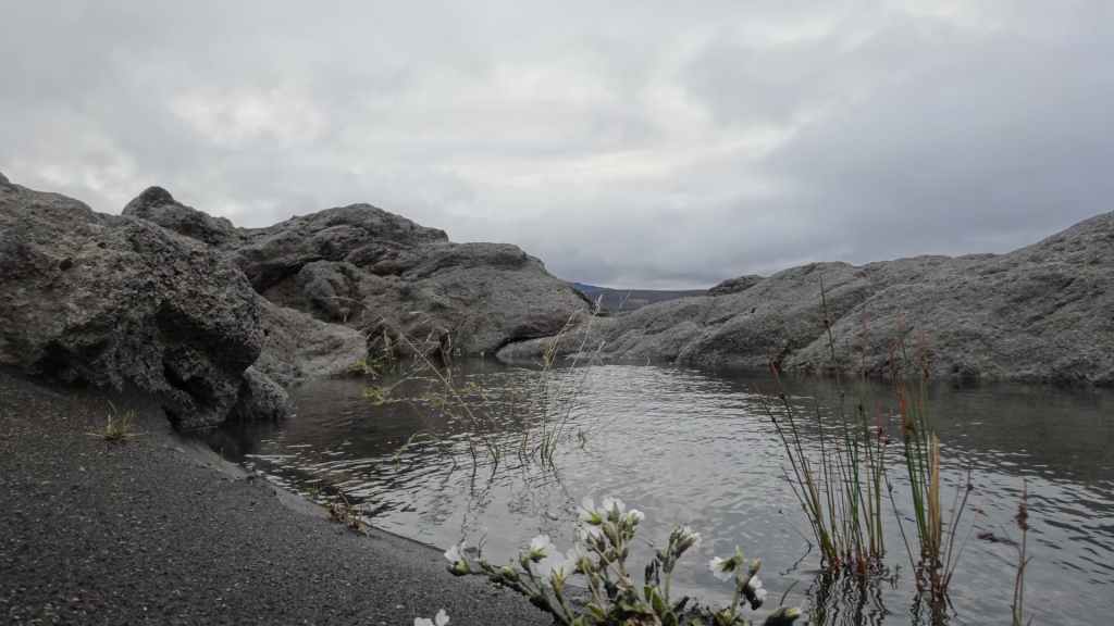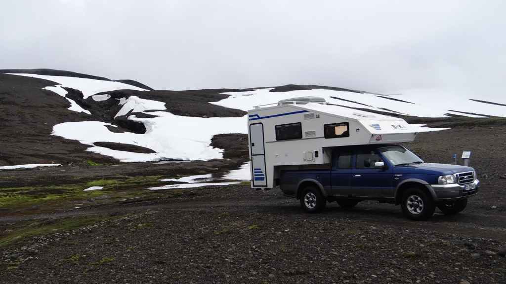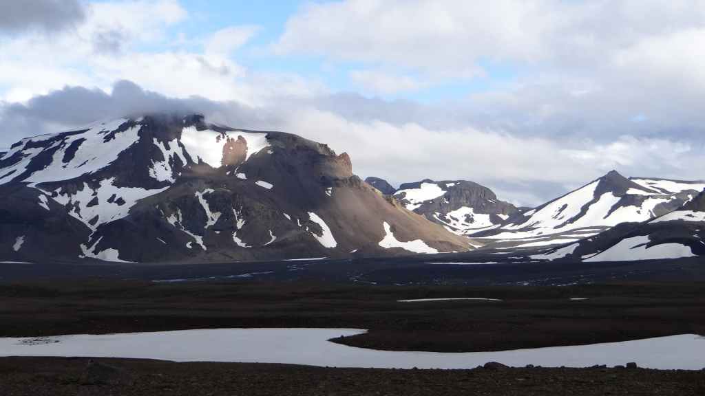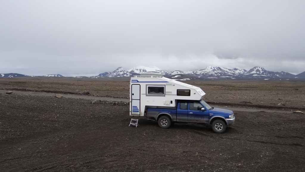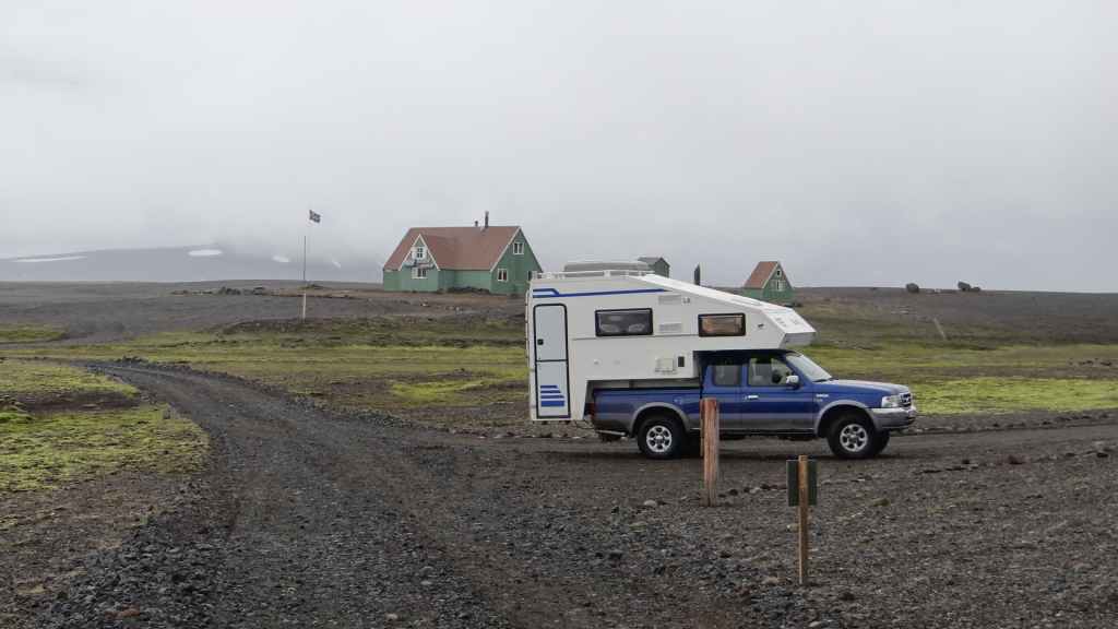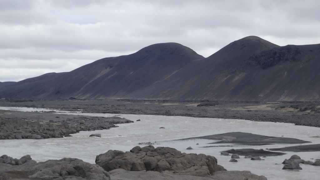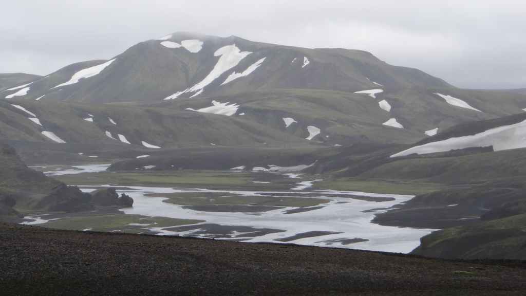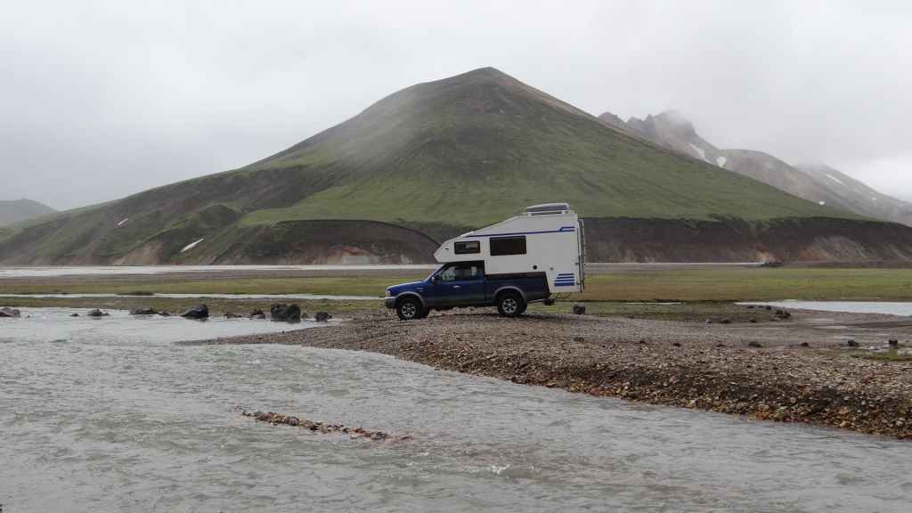 Il y a de nombreux randonneurs itinérants sur les sentiers, mais aussi de très nombreux touristes déversés par les bus et minibus 4×4. Après 2h1/2 de marche et de nombreuses averses, nous revenons déjeuner à l’abri et au chaud dans notre cellule. Nous pensons à tous ceux qui mangent sous la pluie et le vent ! D’autant plus que la pluie s’est remise à tomber régulièrement et, en 2 heures à peine, a fait gonfler un peu les cours d’eau… Au vu des conditions météo, nous décidons de quitter le Mannalaugar par la F208 pour redescendre vers le sud. Nous devons repasser les 2 gués qui ont pris une vingtaine de centimètres : notre Ranger passe sans problème.