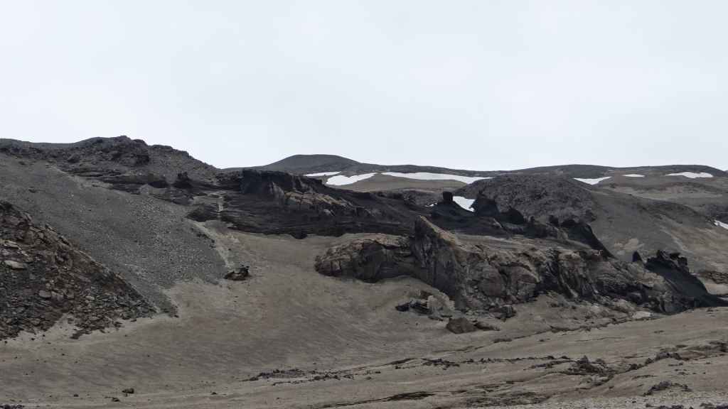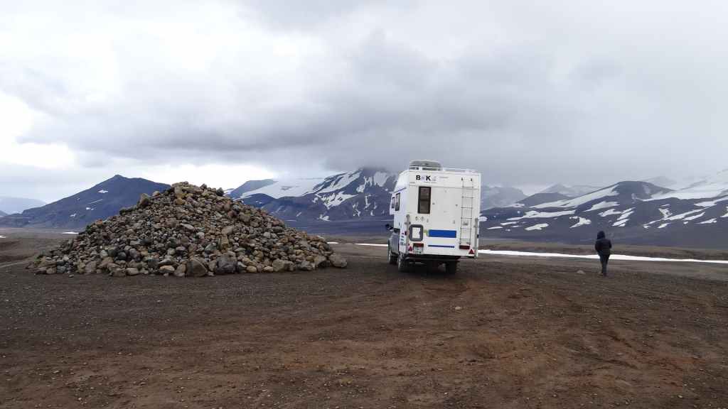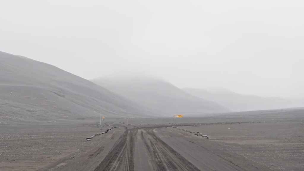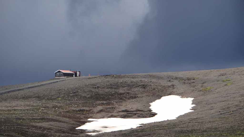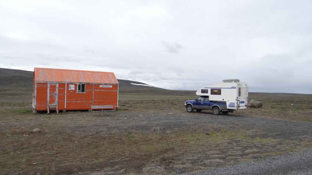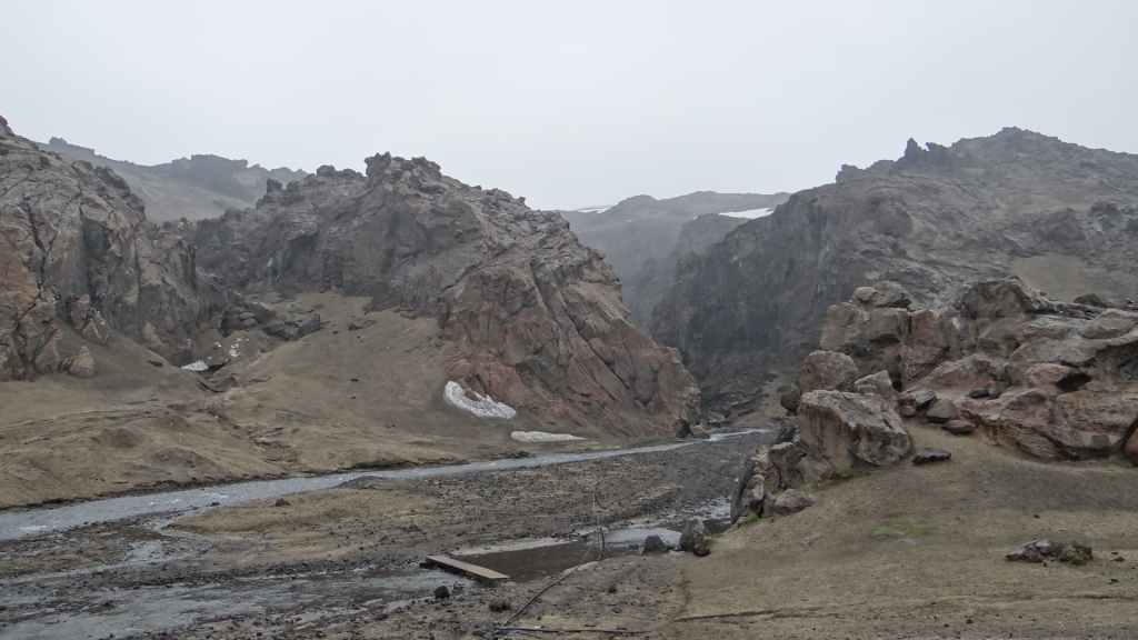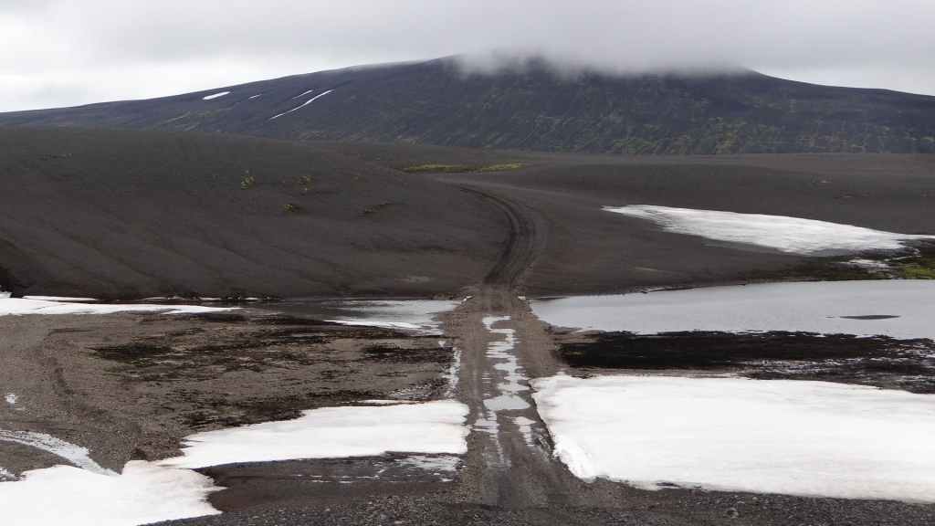 Au réveil, les monts Kerlingarfjöll sont très ennuagés et compromettent sérieusement toute randonnée. Après une hésitation, nous prenons tout de même cette direction. La piste monte vers le centre d’accueil. Nous y prenons la météo qui annonce une mauvaise journée ainsi que les jours suivants. Nous poursuivons la piste qui s’élève dans les montagnes et qui doit nous conduire vers une zone géothermique. Après 3 km, la piste est trop défoncée pour continuer alors nous poursuivons à pied.