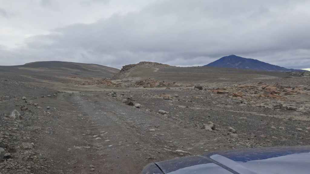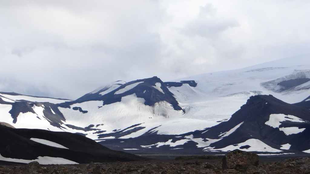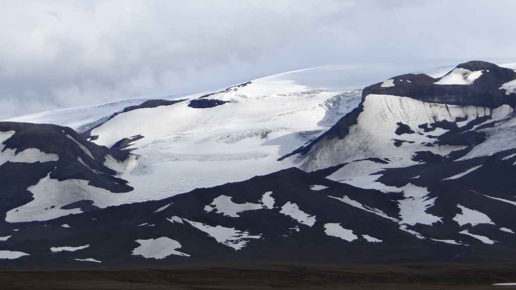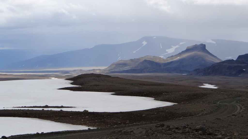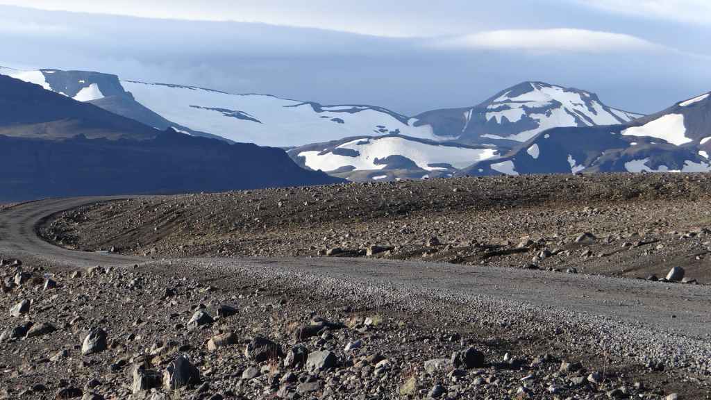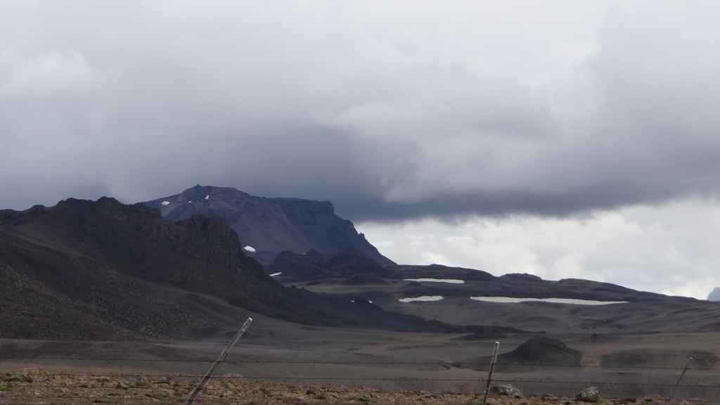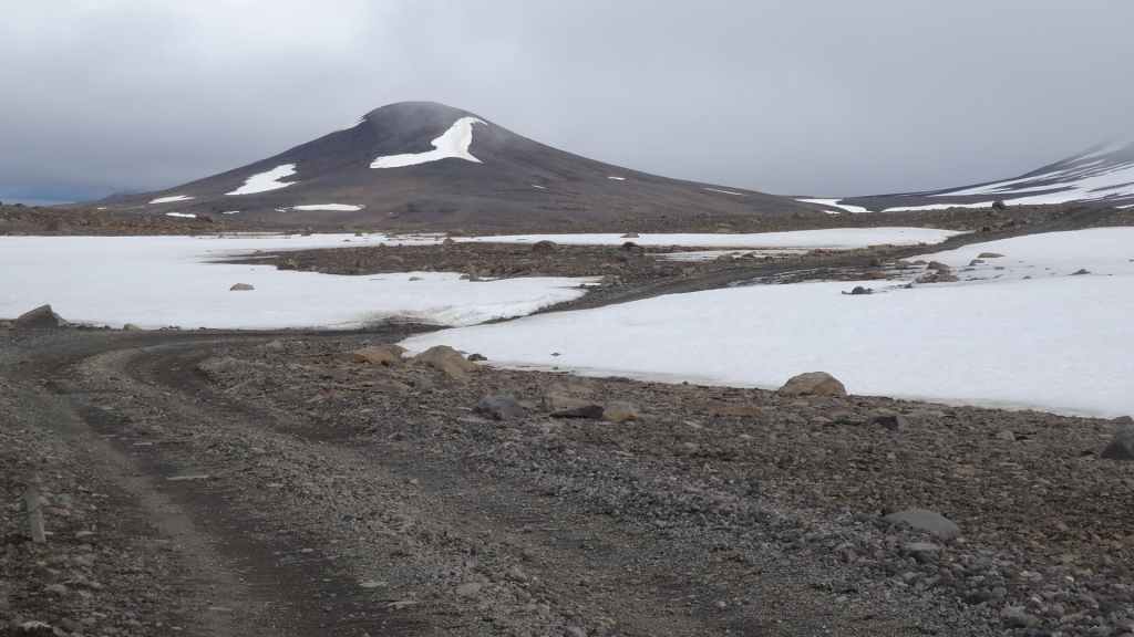 D’abord clément, le ciel lâche ses premières gouttes vers la fin de la promenade. Après le repas, nous repartons vers le nord sur la piste 550. Cette piste magnifique monte d’abord sur la lèvre d’un ancien cratère avant de plonger à l’intérieur recouvert en partie d’un lac. Puis elle part, au travers de champs de lave, le long de plusieurs glaciers. Au plus haut de la piste, on se croirait carrément dans l’Himalaya, enfin de ce qu’on a pu voir à la télé ! Entre ciel bleu et nuages de pluie, les sommets glaciaires illuminent la piste taillée dans un plateau de lave marron. Une magnifique vallée s’enfonce au milieu des sommets…