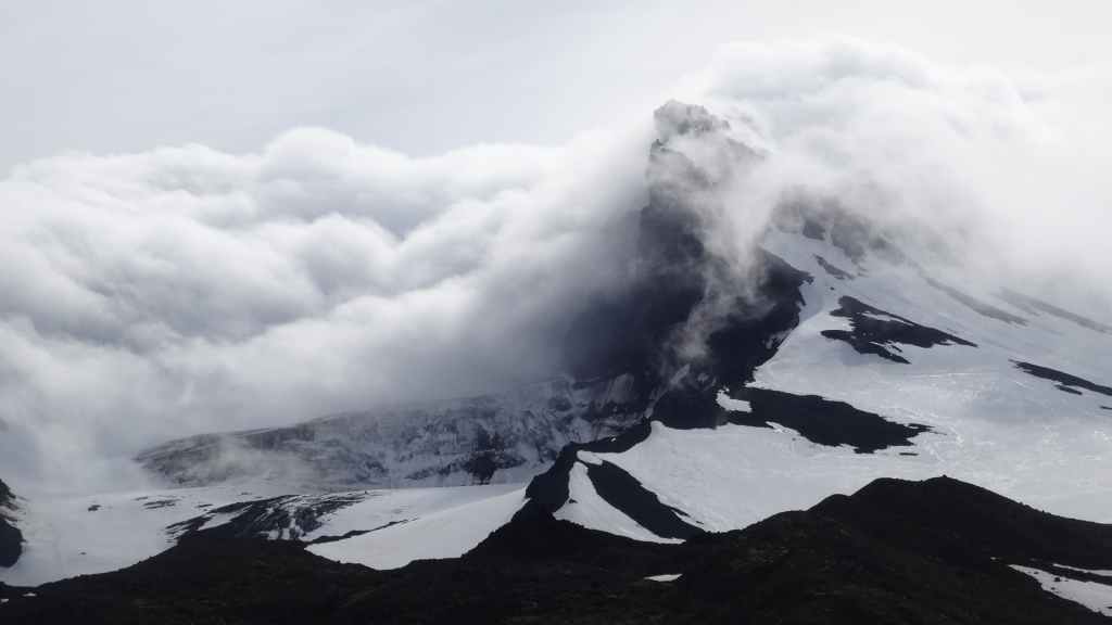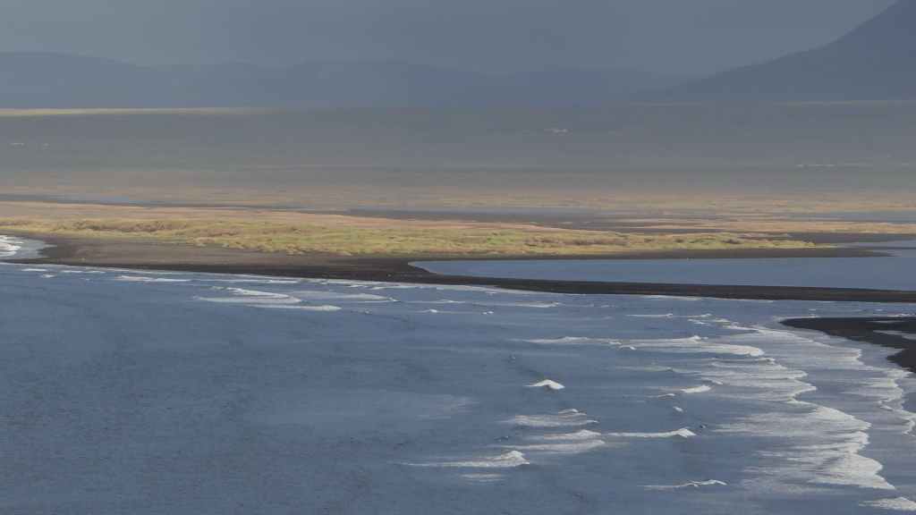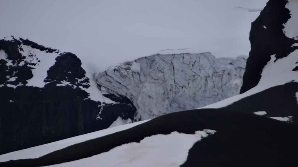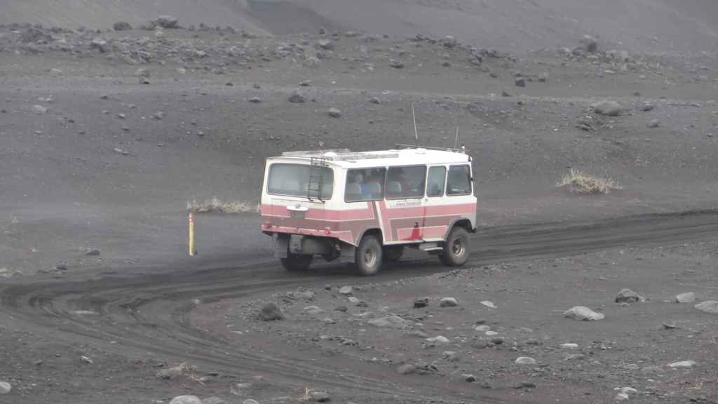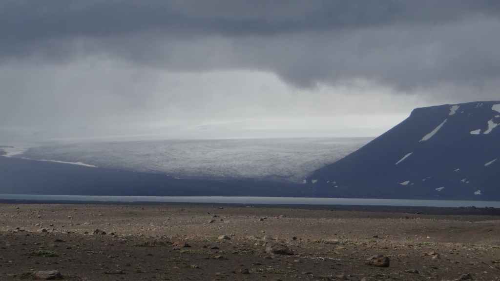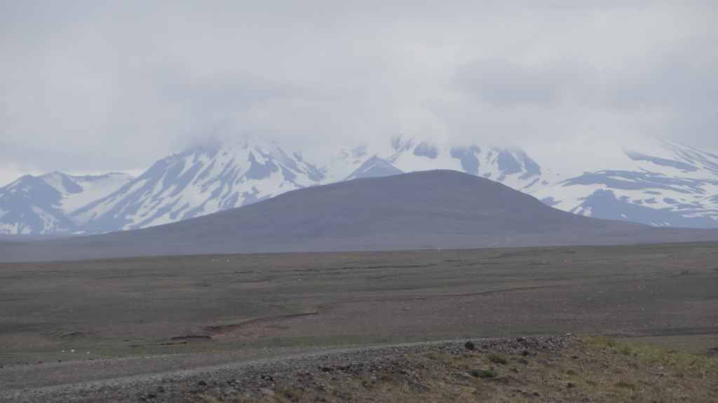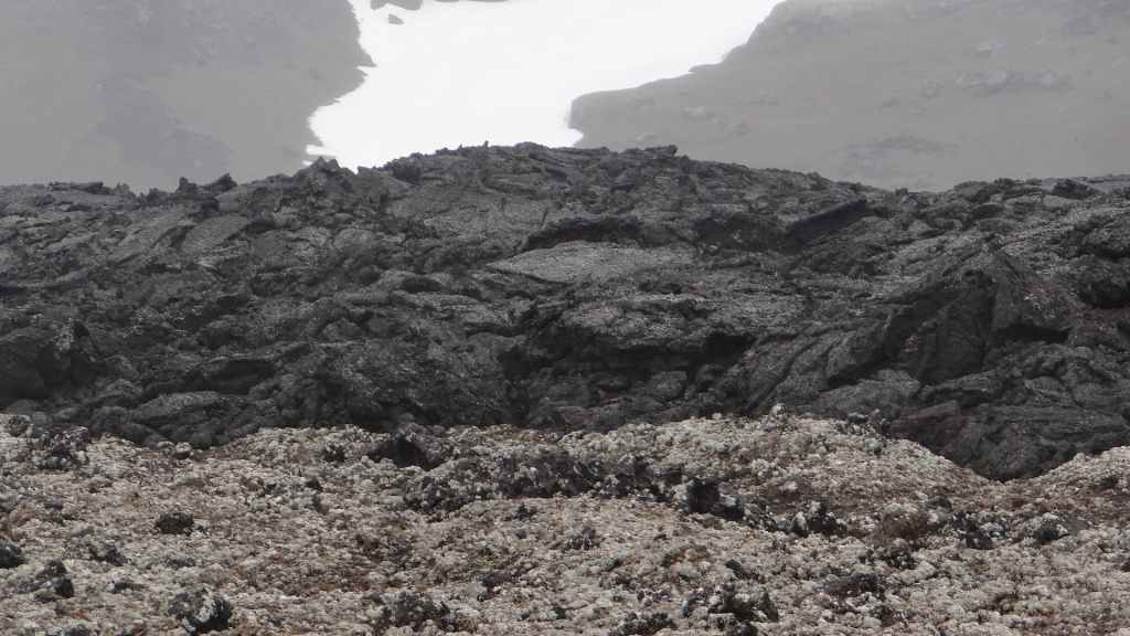 D’abord clément, le ciel lâche ses premières gouttes vers la fin de la promenade. Après le repas, nous repartons vers le nord sur la piste 550. Cette piste magnifique monte d’abord sur la lèvre d’un ancien cratère avant de plonger à l’intérieur recouvert en partie d’un lac. Puis elle part, au travers de champs de lave, le long de plusieurs glaciers. Au plus haut de la piste, on se croirait carrément dans l’Himalaya, enfin de ce qu’on a pu voir à la télé ! Entre ciel bleu et nuages de pluie, les sommets glaciaires illuminent la piste taillée dans un plateau de lave marron. Une magnifique vallée s’enfonce au milieu des sommets…