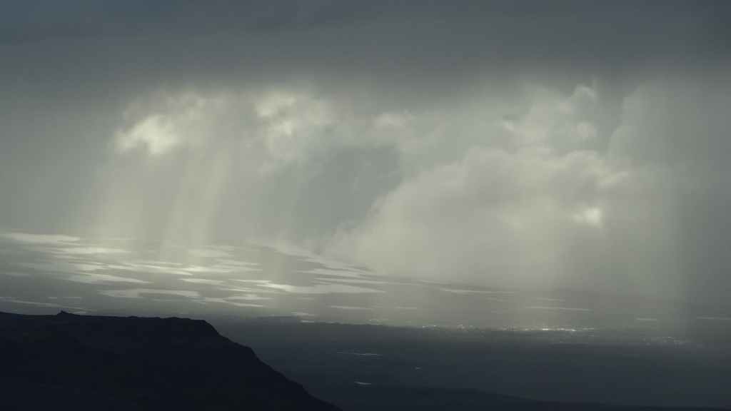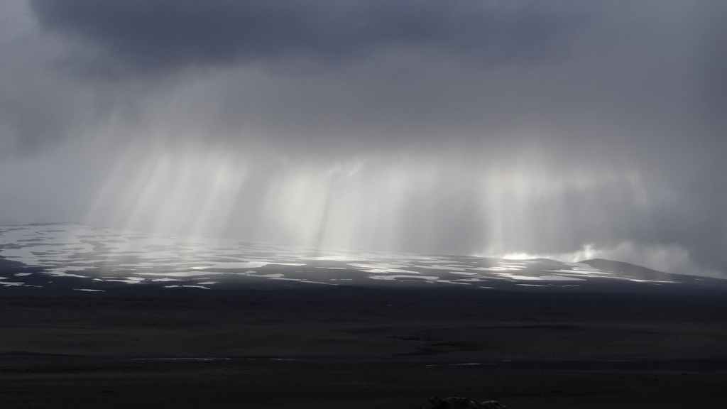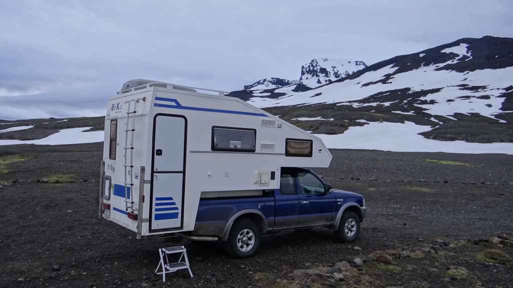 Alors, nous redescendons sur la 550 et trouvons un emplacement au bord d’un torrent et en vue du glacier (N 64°40.447 / W 20°366). Alors que le soleil éclaire encore ce dernier, la pluie refait son apparition sur le toit de la tortue…