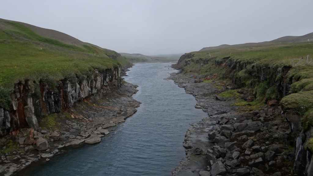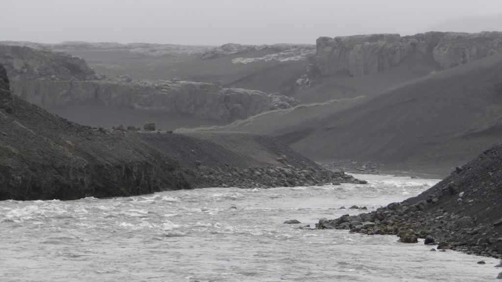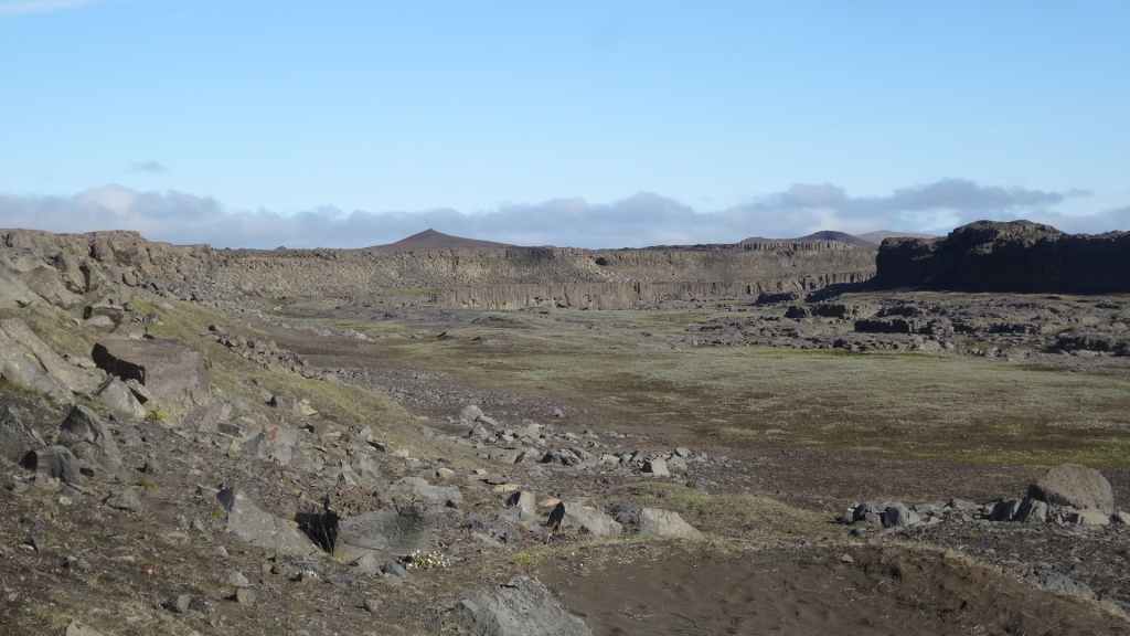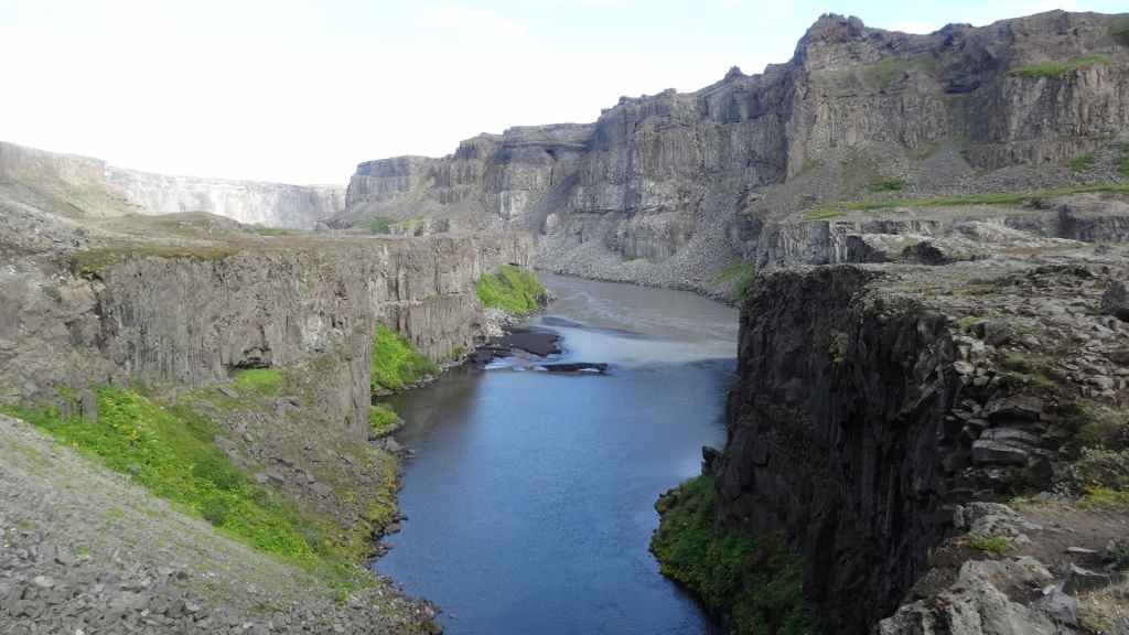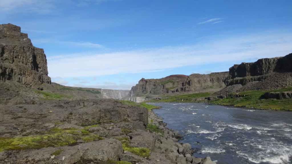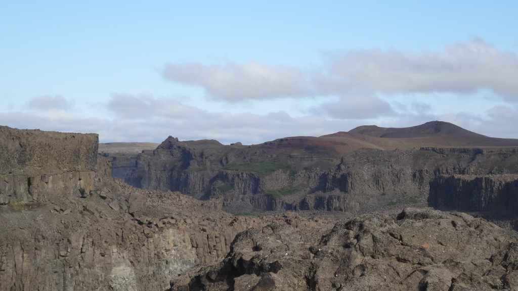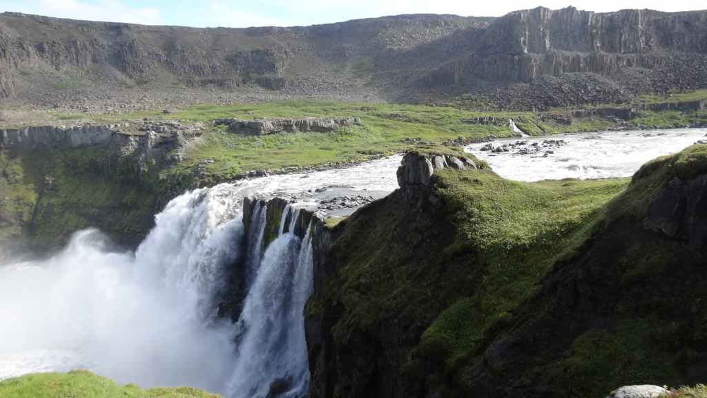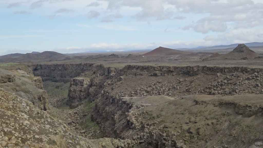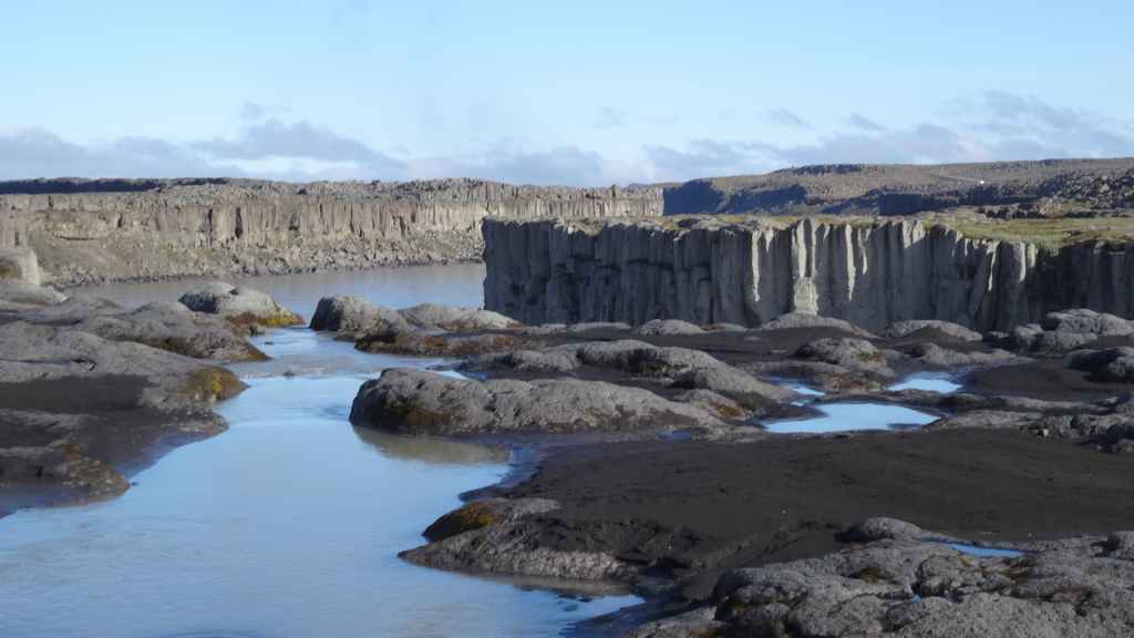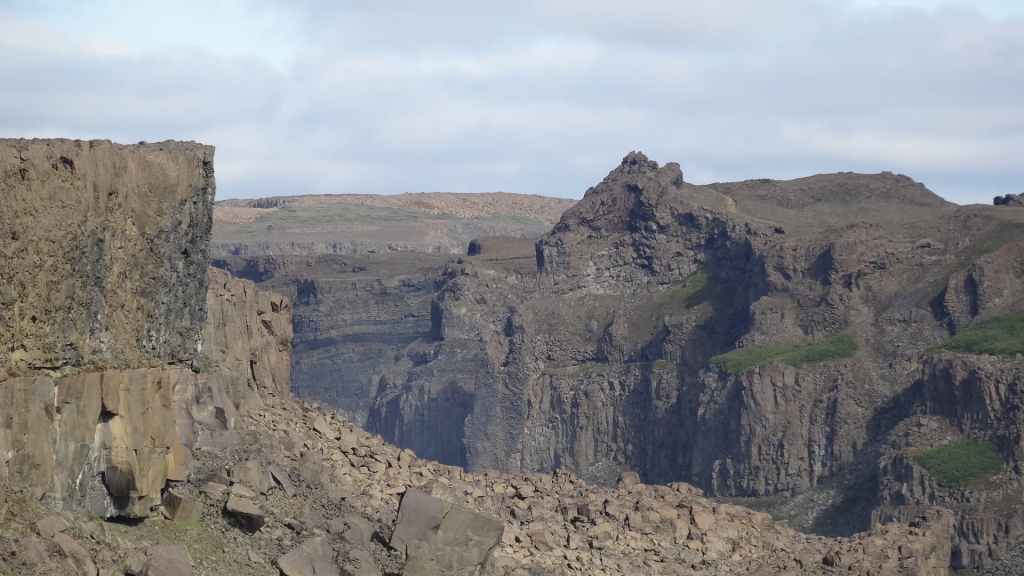 Il fait très beau et la marche commence à la première cascade : Selfoss. C’est la moins spectaculaire et on la voit d’un peu trop loin. On revient sur Detifoss où le torrent gris, puissant et large, tombe dans un canyon assez profond. Mieux vaut commencer tôt le matin avant que les hordes de touristes arrivent ! Ensuite, la randonnée devient plus engagée quand on part sur la cascade d’Hafragilfoss, peut-être la plus belle des trois. En utilisant une corde déjà en place, on descend dans le magnifique canyon rappelant celui du Colorado. On y reste une grosse demi-heure puis on remonte sur un demi-plateau : qui nous permet d’admirer des « baies » d’eau claire crées par des sources adjacentes au torrent. On remonte sur le plateau en longeant un autre canyon sec qui nous ramène à la voiture. Nous aurons mis 3h45 pour faire le tour.