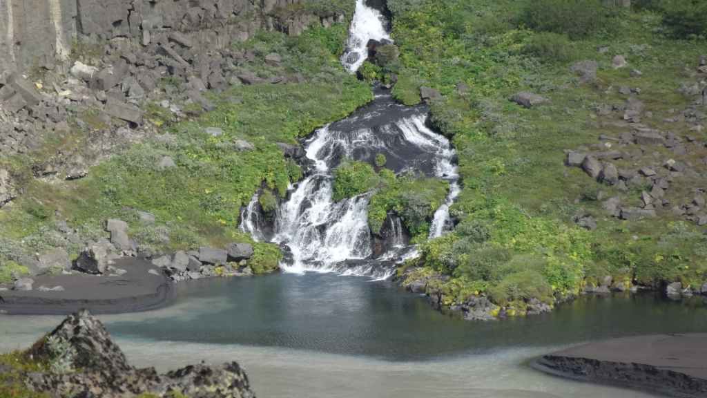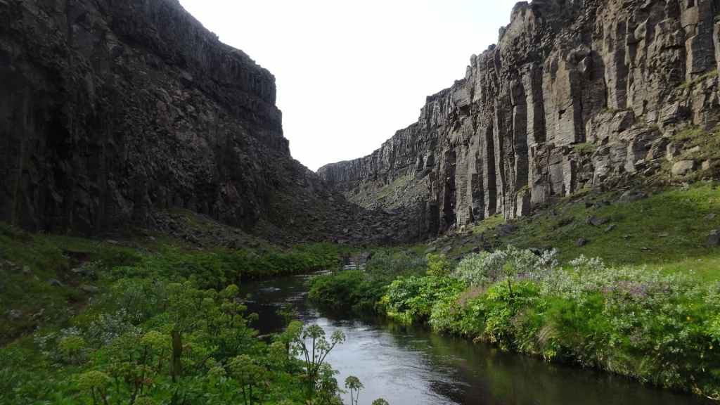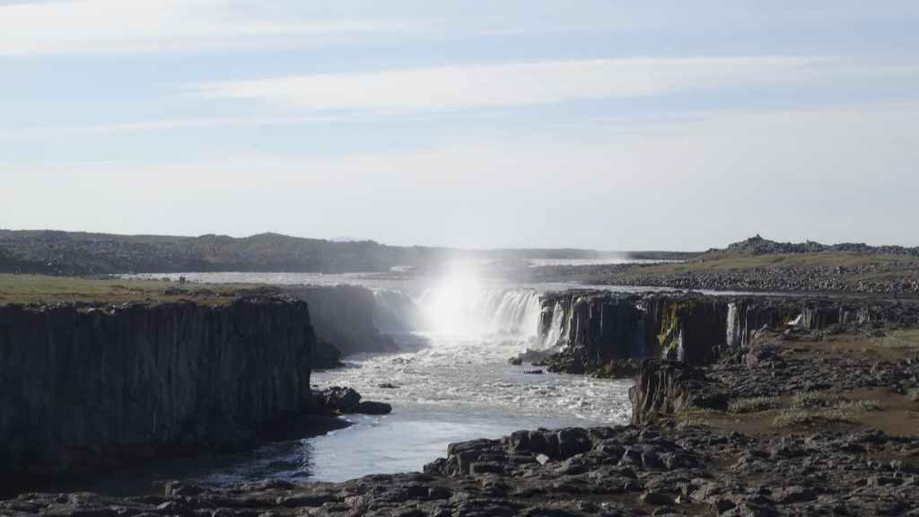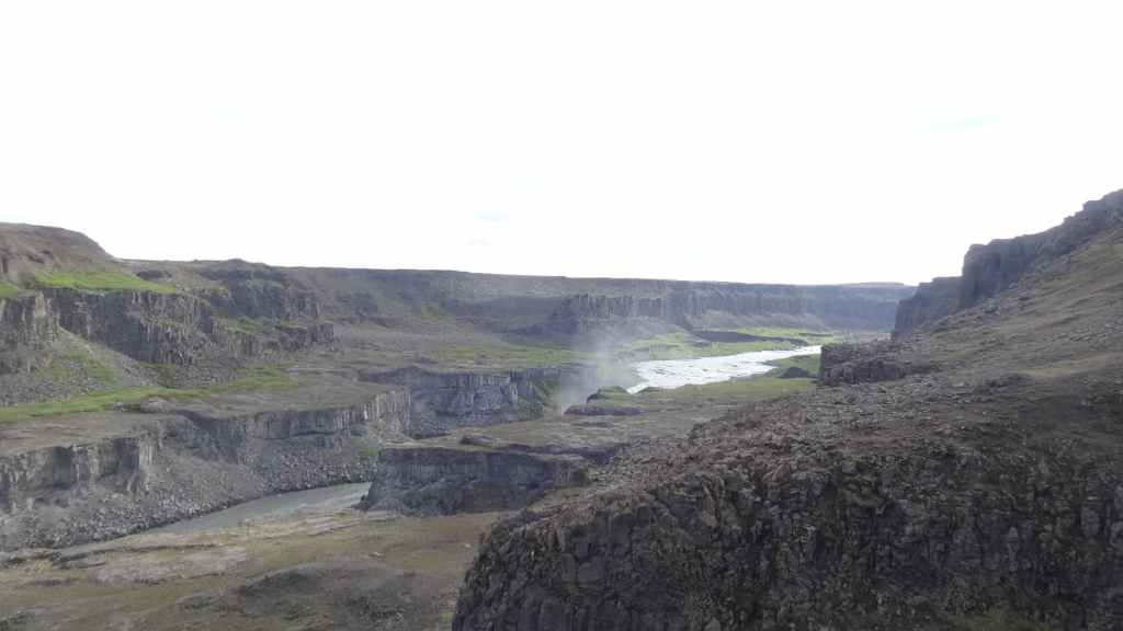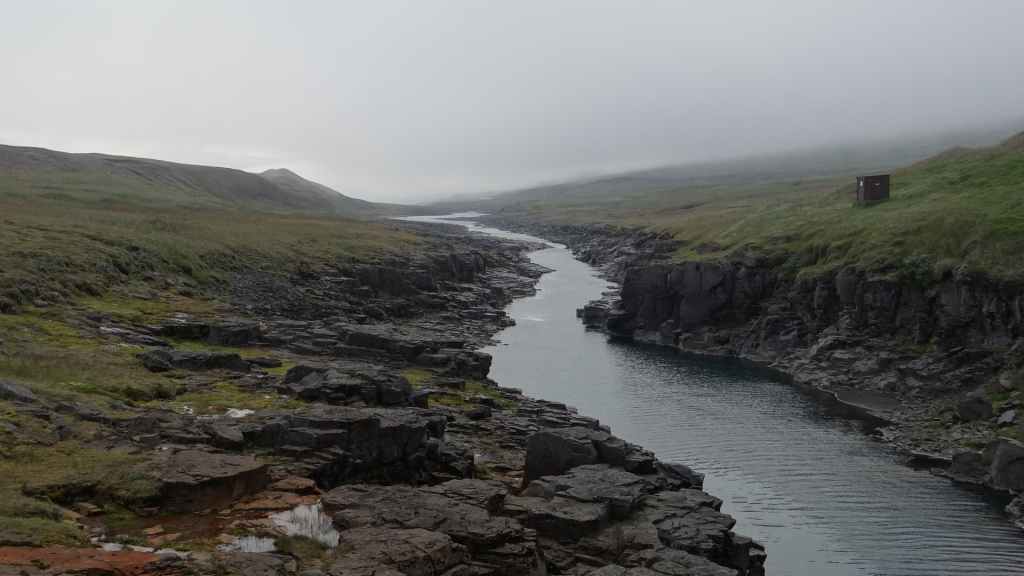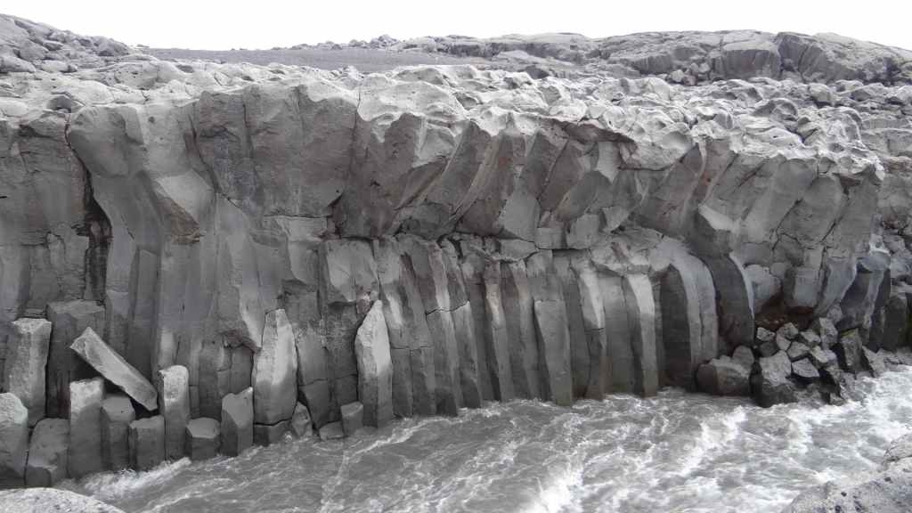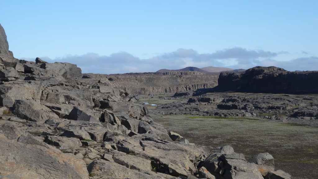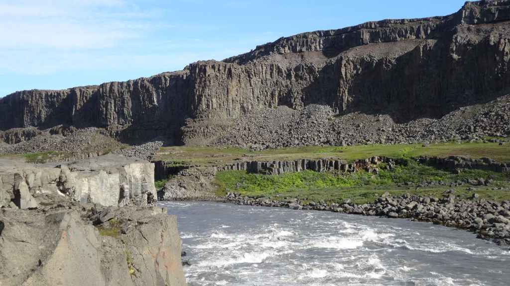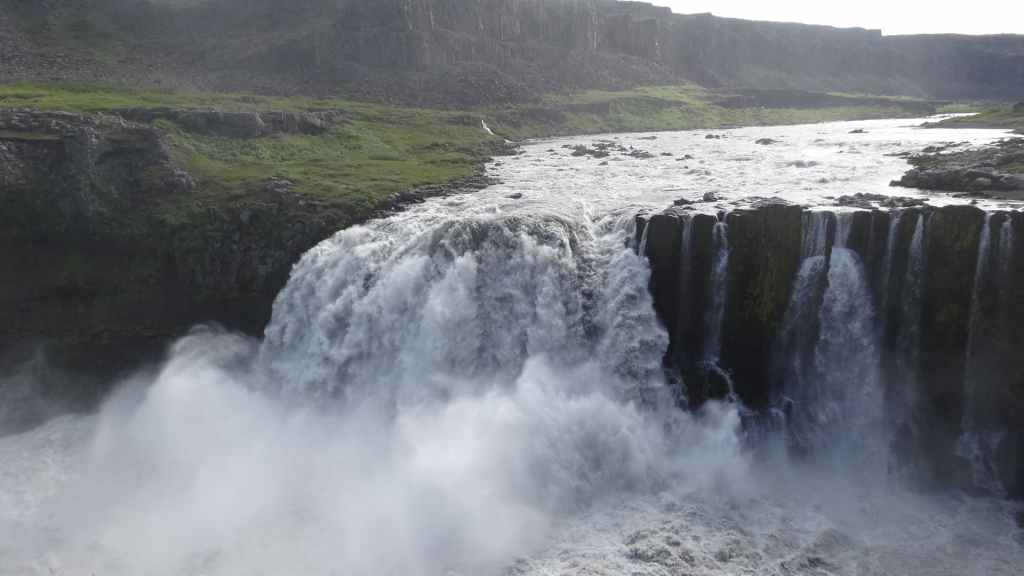 Il fait très beau et la marche commence à la première cascade : Selfoss. C’est la moins spectaculaire et on la voit d’un peu trop loin. On revient sur Detifoss où le torrent gris, puissant et large, tombe dans un canyon assez profond. Mieux vaut commencer tôt le matin avant que les hordes de touristes arrivent ! Ensuite, la randonnée devient plus engagée quand on part sur la cascade d’Hafragilfoss, peut-être la plus belle des trois. En utilisant une corde déjà en place, on descend dans le magnifique canyon rappelant celui du Colorado. On y reste une grosse demi-heure puis on remonte sur un demi-plateau : qui nous permet d’admirer des « baies » d’eau claire crées par des sources adjacentes au torrent. On remonte sur le plateau en longeant un autre canyon sec qui nous ramène à la voiture. Nous aurons mis 3h45 pour faire le tour.