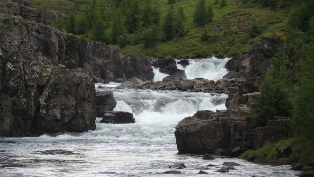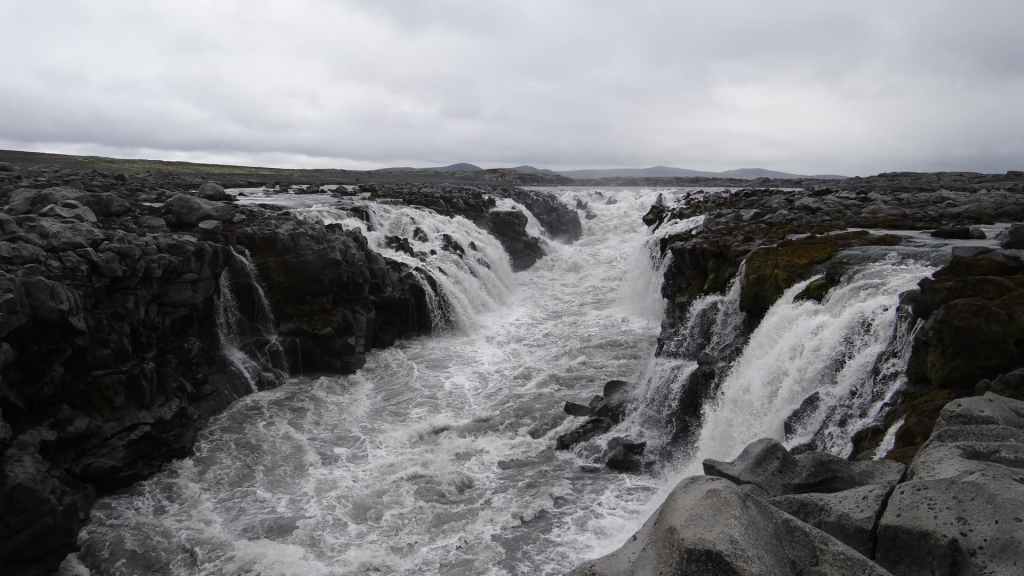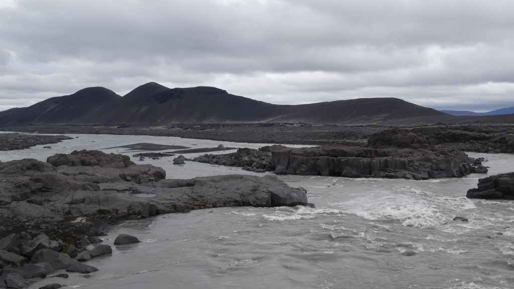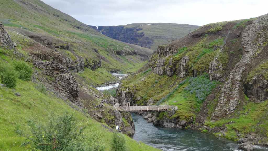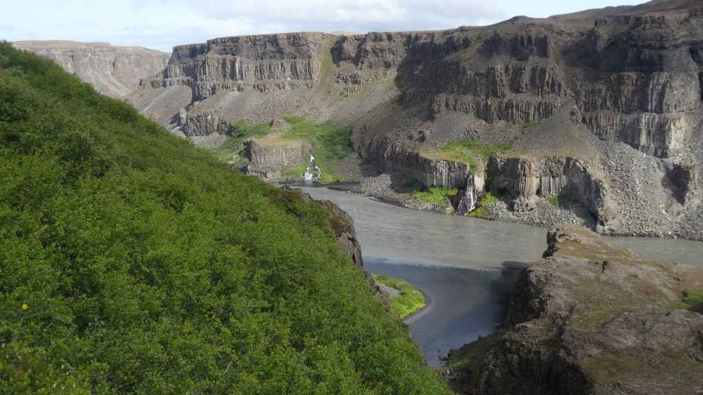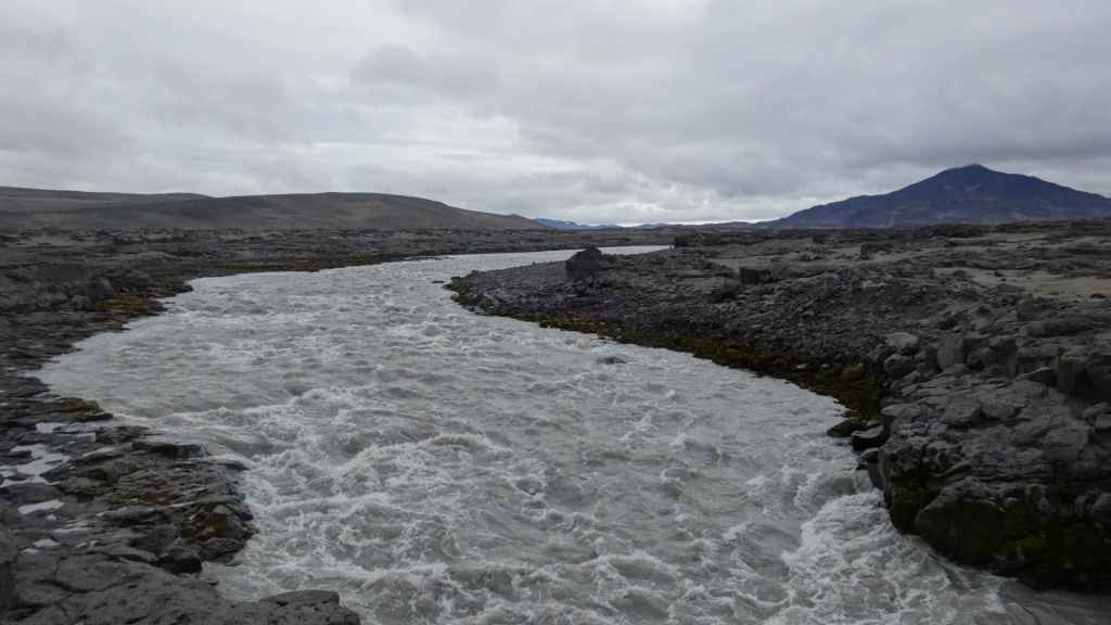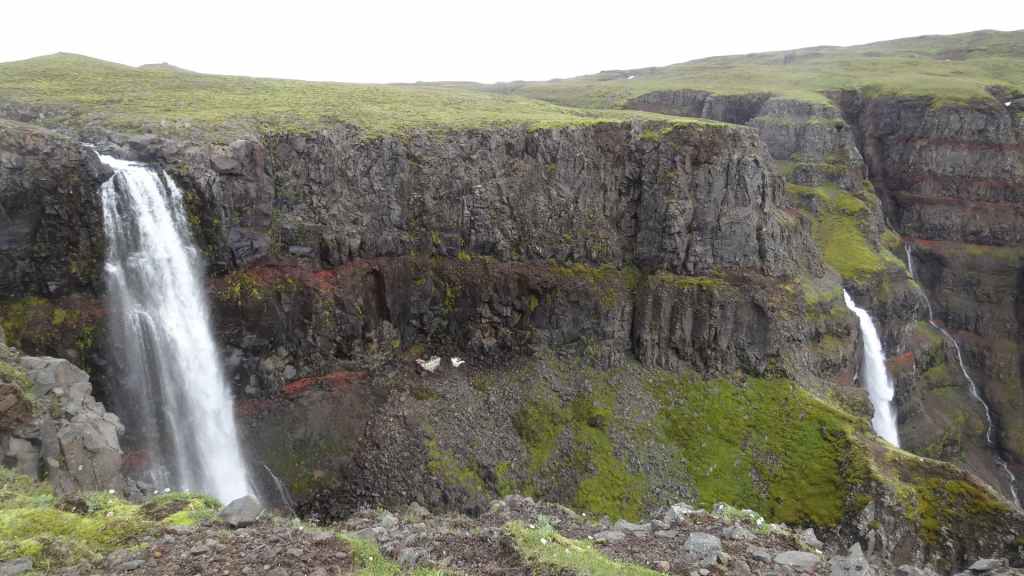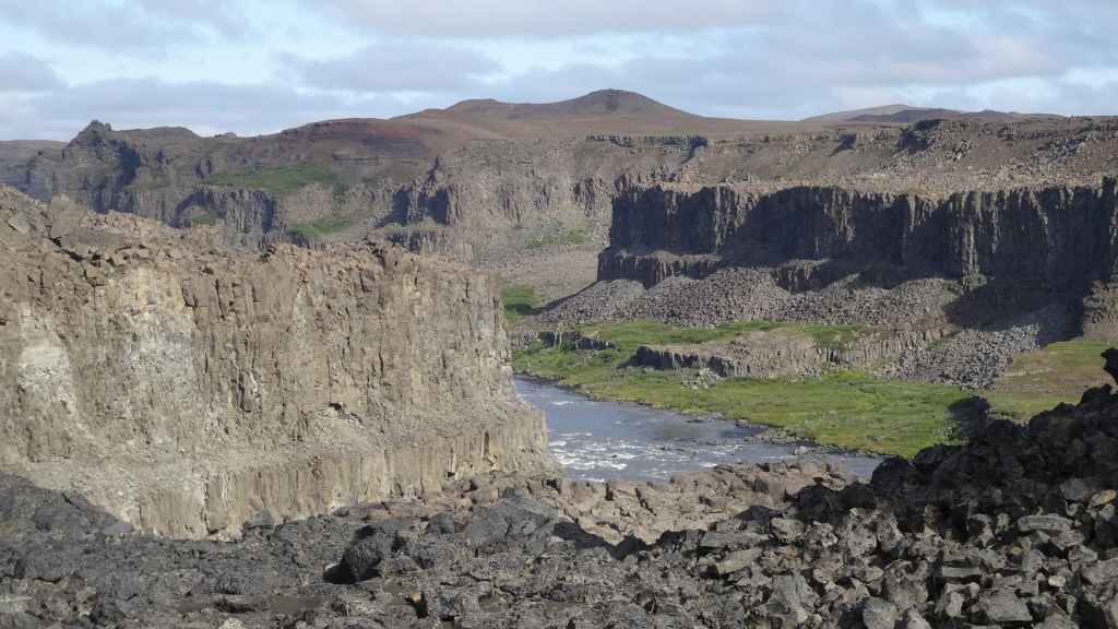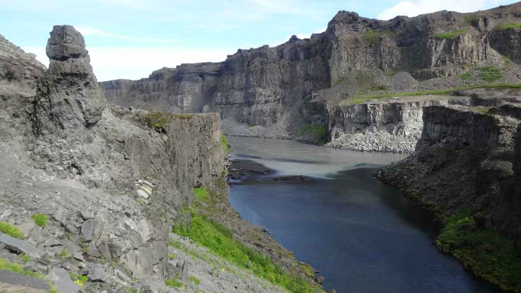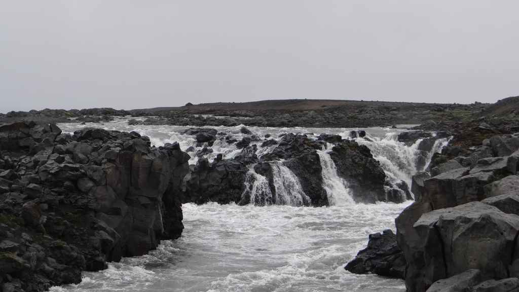 Il fait très beau et la marche commence à la première cascade : Selfoss. C’est la moins spectaculaire et on la voit d’un peu trop loin. On revient sur Detifoss où le torrent gris, puissant et large, tombe dans un canyon assez profond. Mieux vaut commencer tôt le matin avant que les hordes de touristes arrivent ! Ensuite, la randonnée devient plus engagée quand on part sur la cascade d’Hafragilfoss, peut-être la plus belle des trois. En utilisant une corde déjà en place, on descend dans le magnifique canyon rappelant celui du Colorado. On y reste une grosse demi-heure puis on remonte sur un demi-plateau : qui nous permet d’admirer des « baies » d’eau claire crées par des sources adjacentes au torrent. On remonte sur le plateau en longeant un autre canyon sec qui nous ramène à la voiture. Nous aurons mis 3h45 pour faire le tour.
