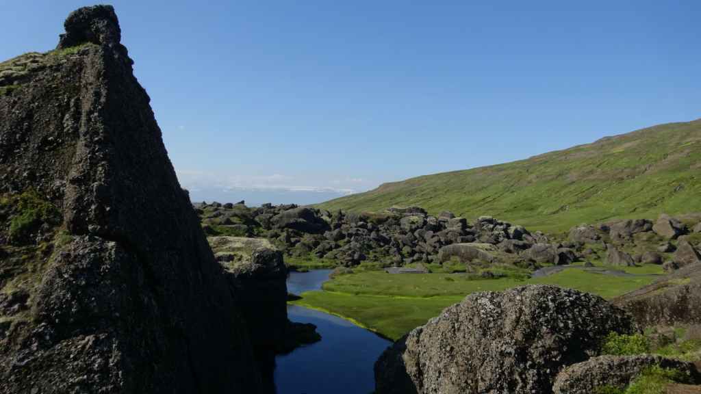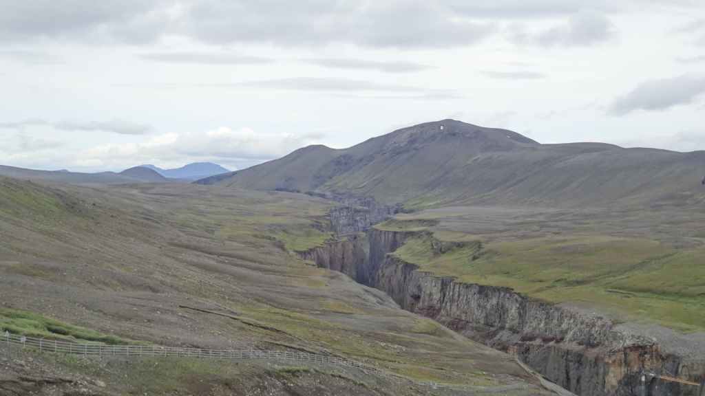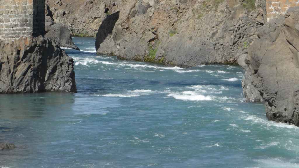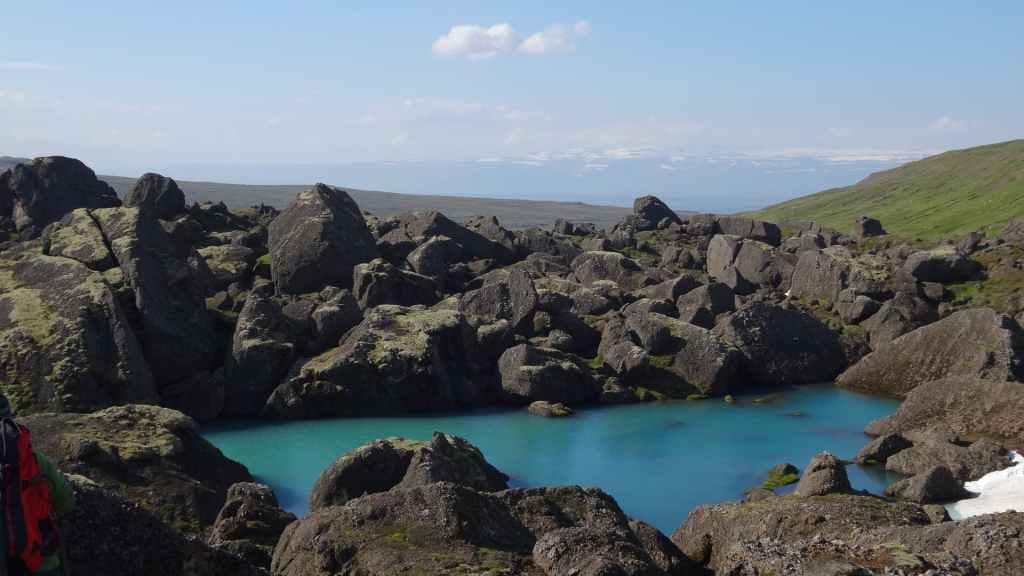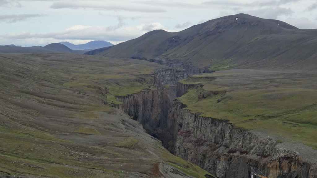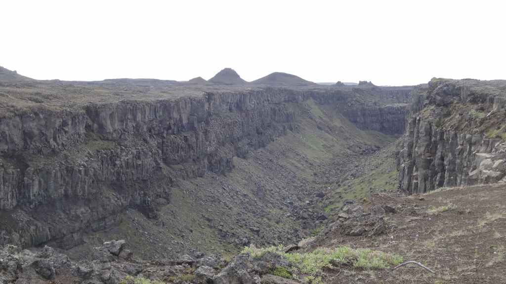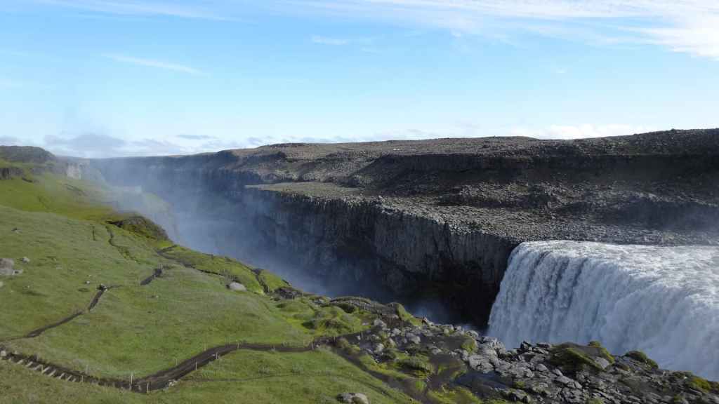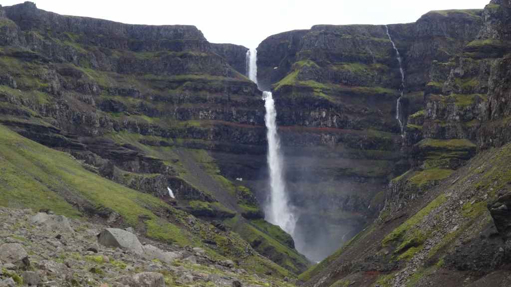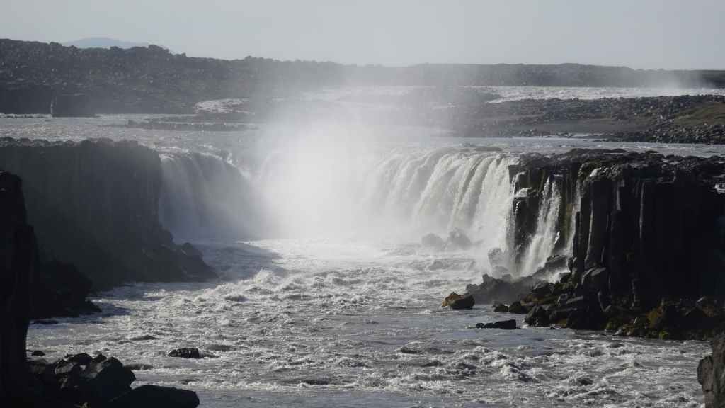 Il fait très beau et la marche commence à la première cascade : Selfoss. C’est la moins spectaculaire et on la voit d’un peu trop loin. On revient sur Detifoss où le torrent gris, puissant et large, tombe dans un canyon assez profond. Mieux vaut commencer tôt le matin avant que les hordes de touristes arrivent ! Ensuite, la randonnée devient plus engagée quand on part sur la cascade d’Hafragilfoss, peut-être la plus belle des trois. En utilisant une corde déjà en place, on descend dans le magnifique canyon rappelant celui du Colorado. On y reste une grosse demi-heure puis on remonte sur un demi-plateau : qui nous permet d’admirer des « baies » d’eau claire crées par des sources adjacentes au torrent. On remonte sur le plateau en longeant un autre canyon sec qui nous ramène à la voiture. Nous aurons mis 3h45 pour faire le tour.