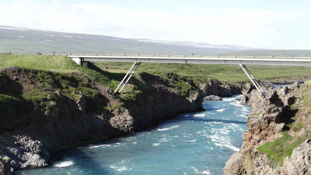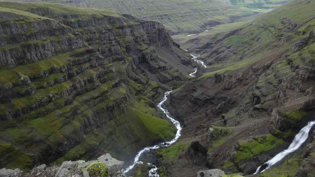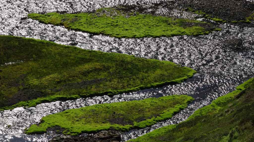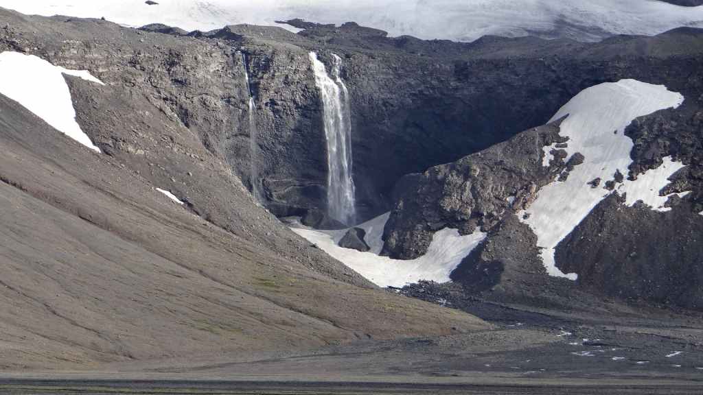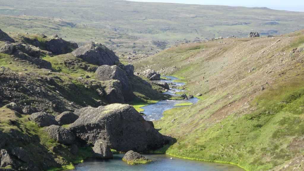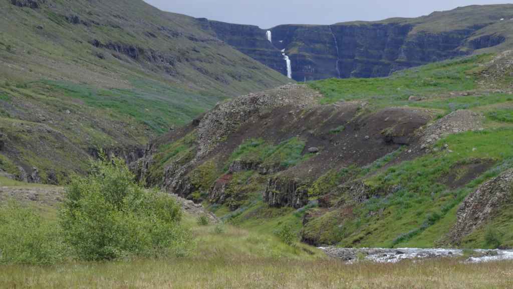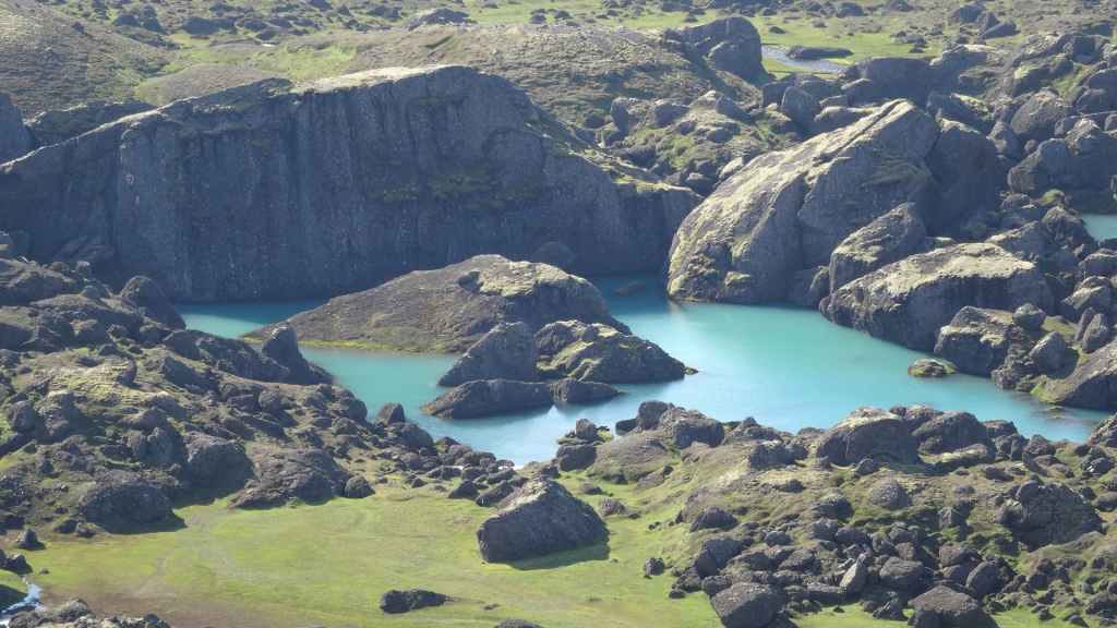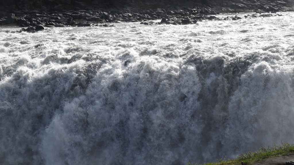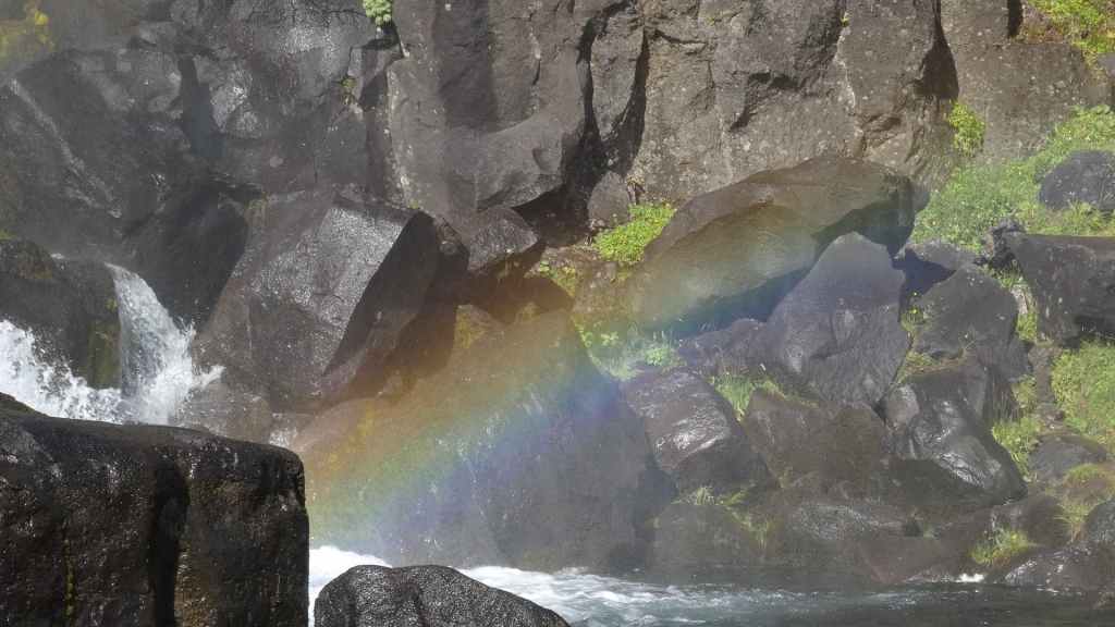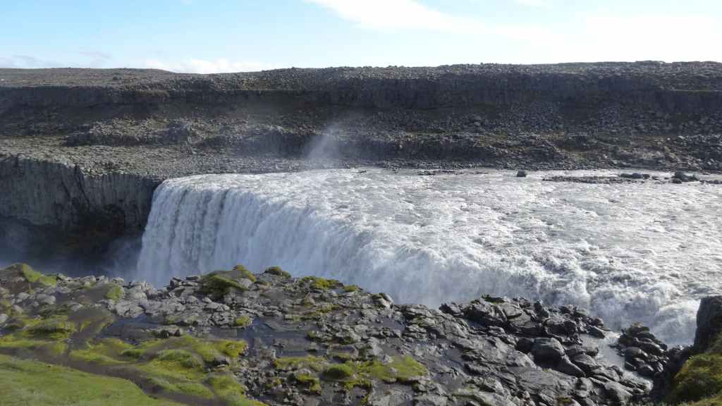 Il fait très beau et la marche commence à la première cascade : Selfoss. C’est la moins spectaculaire et on la voit d’un peu trop loin. On revient sur Detifoss où le torrent gris, puissant et large, tombe dans un canyon assez profond. Mieux vaut commencer tôt le matin avant que les hordes de touristes arrivent ! Ensuite, la randonnée devient plus engagée quand on part sur la cascade d’Hafragilfoss, peut-être la plus belle des trois. En utilisant une corde déjà en place, on descend dans le magnifique canyon rappelant celui du Colorado. On y reste une grosse demi-heure puis on remonte sur un demi-plateau : qui nous permet d’admirer des « baies » d’eau claire crées par des sources adjacentes au torrent. On remonte sur le plateau en longeant un autre canyon sec qui nous ramène à la voiture. Nous aurons mis 3h45 pour faire le tour.