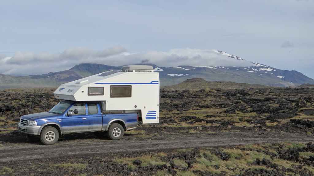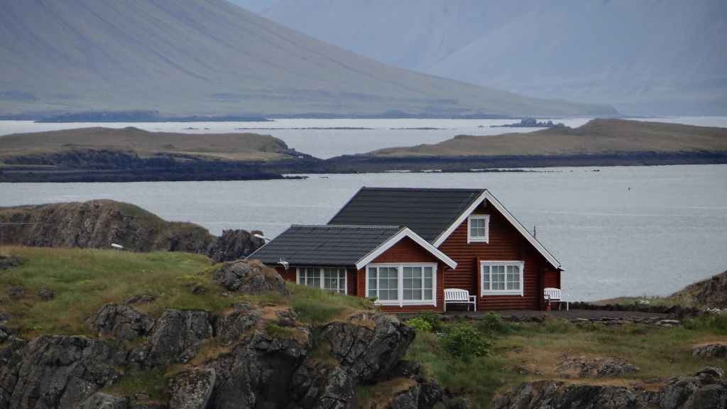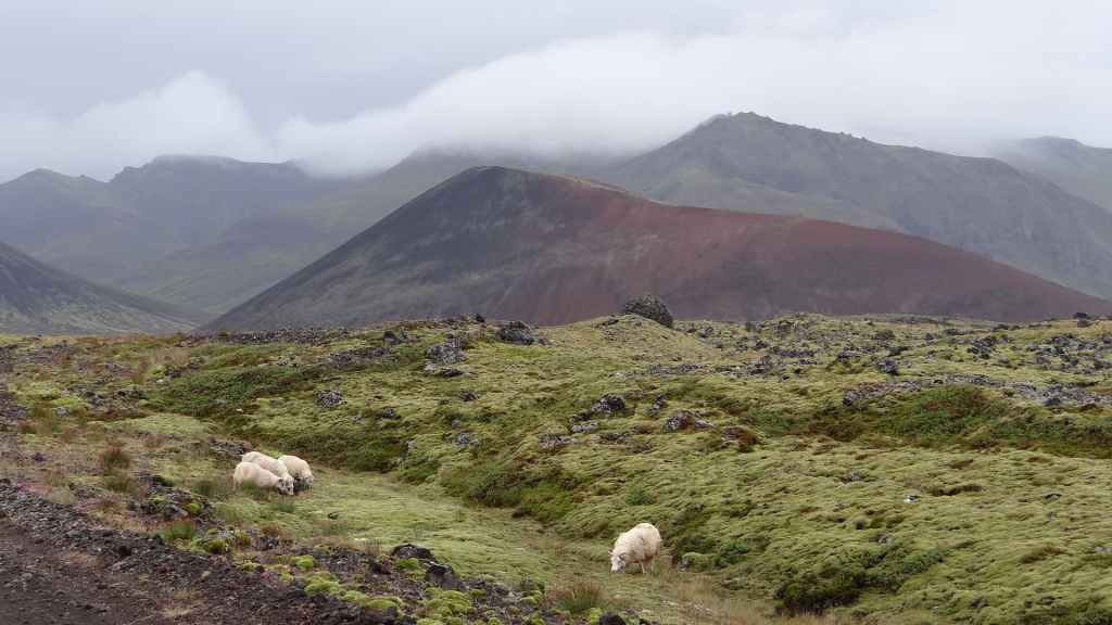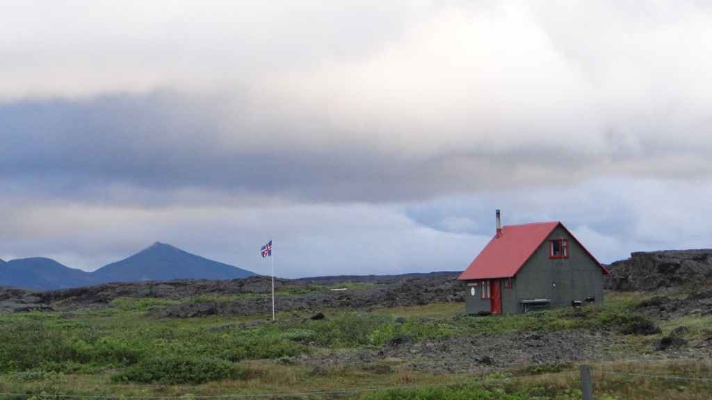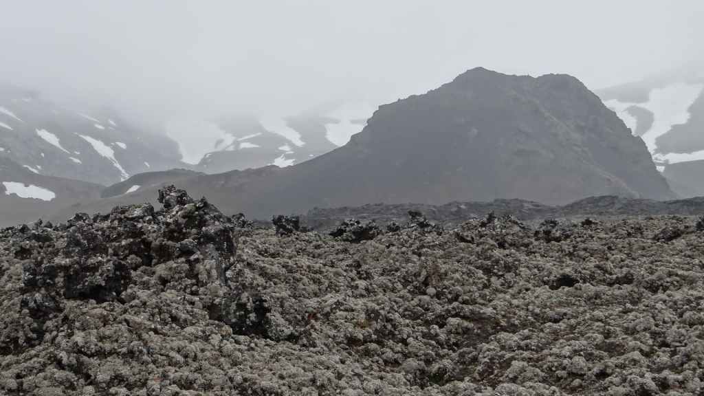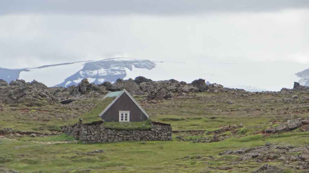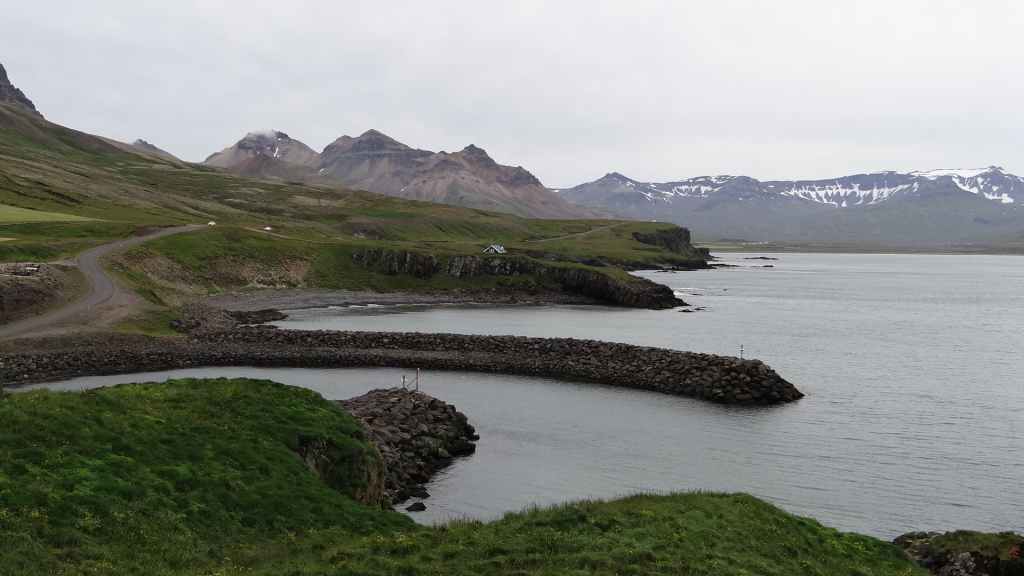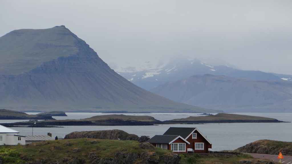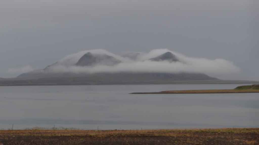 On arrive sur la péninsule de Sfaefnellsnes en début d’après-midi sous le soleil, les nuages s’accrochant aux montagnes de la péninsule. Nous continuons jusqu’à Stykkisholmur, un petit port construit sur presqu’île avec quelques belles maisons anciennes. Nous restons l’après-midi avant de repartir en soirée à la recherche d’un bivouac. Nous nous posons sous la pluie revenue et dans le brouillard au beau milieu d’un champ de lave recouvert d’un tapis de mousse bien verte… (N 64°57.150 / W 22°56.007).