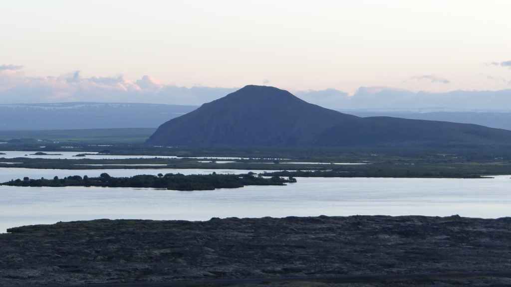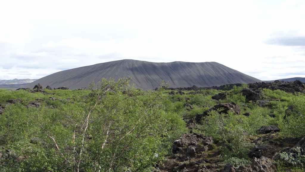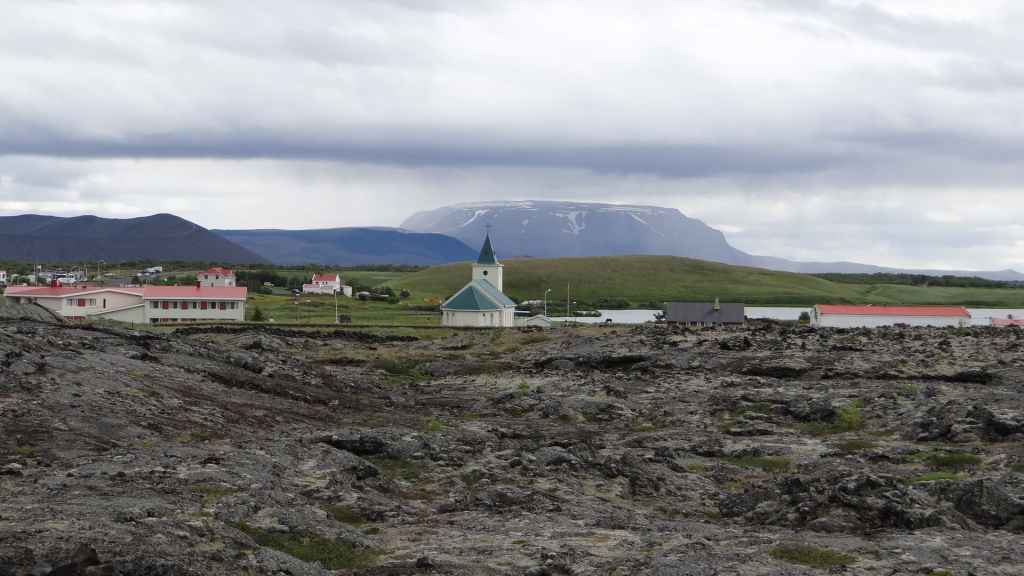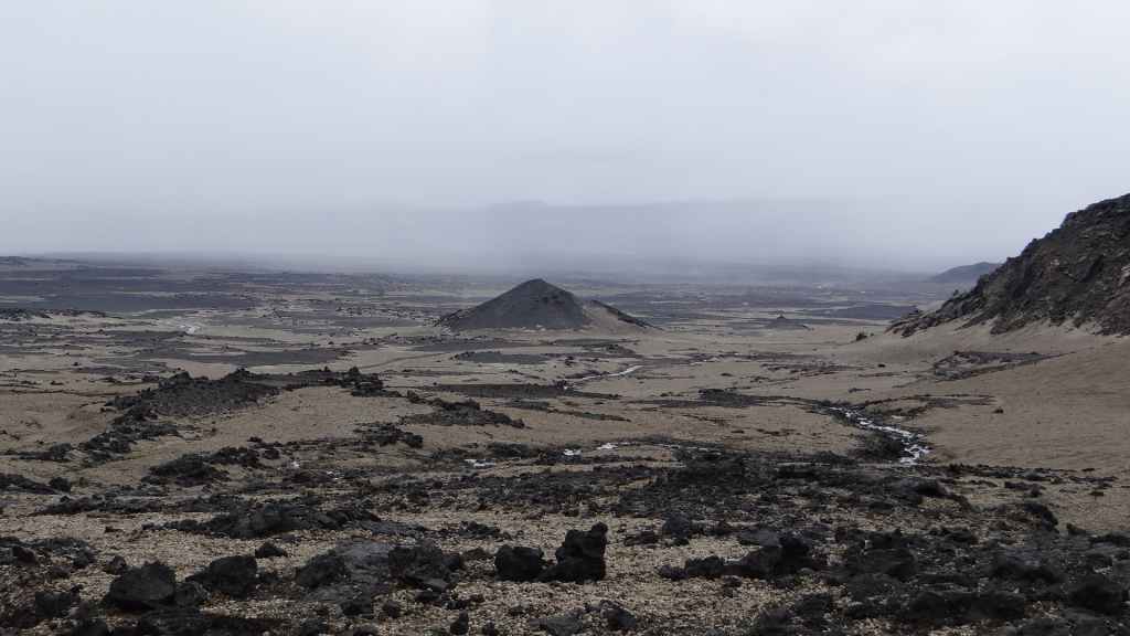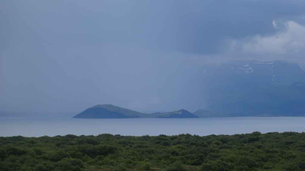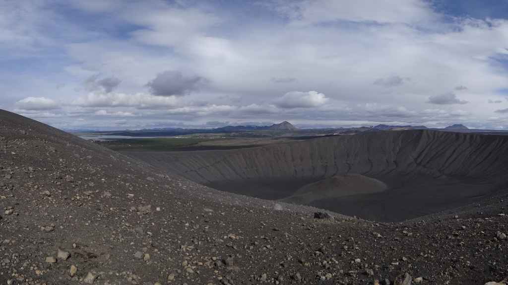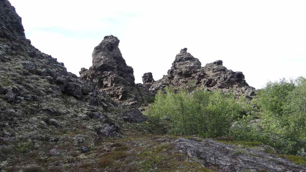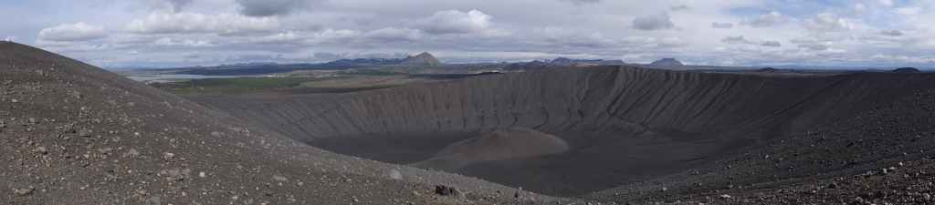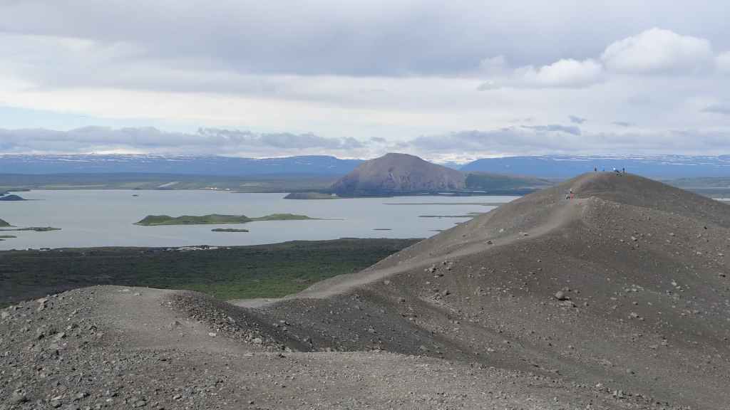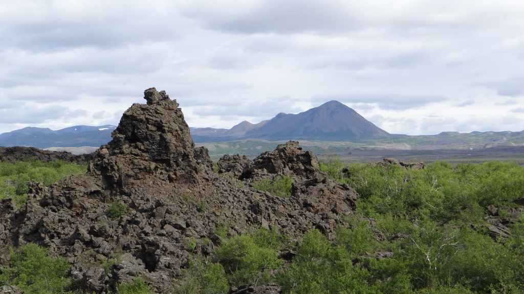 Après la pluie de la nuit, le ciel est resté chargé au réveil. Nous décidons tout de même de partir pour une balade de 3h près du village. Au départ de Dimmuborgir (châteaux noirs), du nom des formes particulières de ce champ de lave, nous rejoignons le pied du volcan Hverfjäll. La montée vers la lèvre du cratère est des plus raides. Mais la vue en vaut la peine, d’autant plus que les éclaircies deviennent assez généreuses.