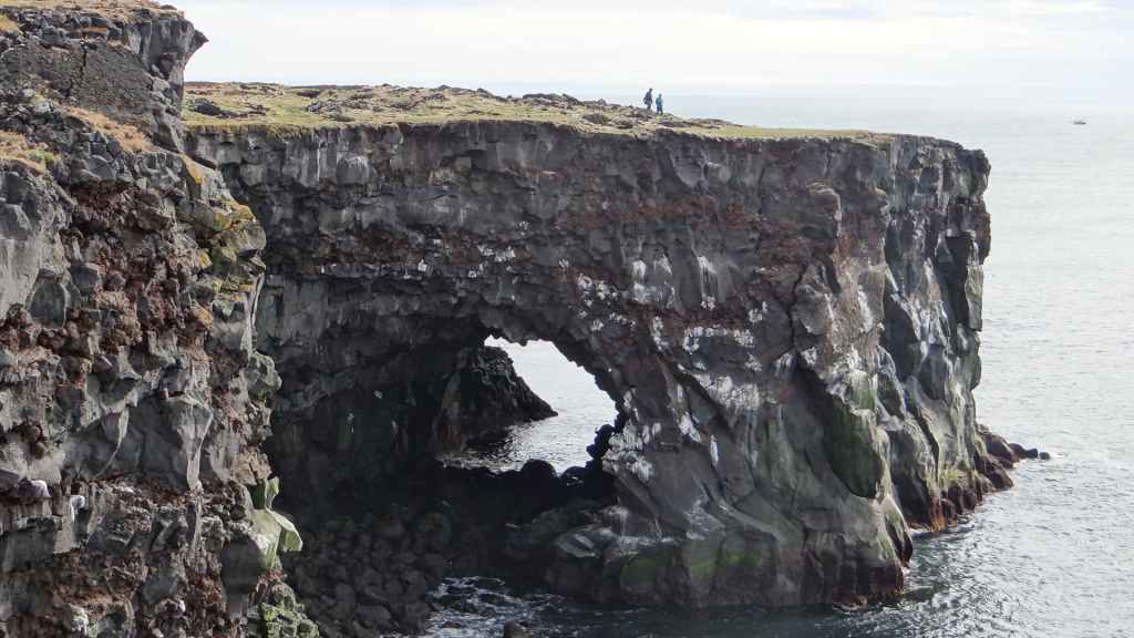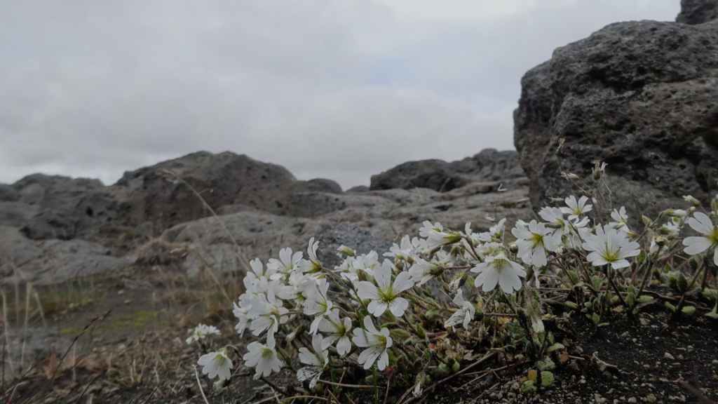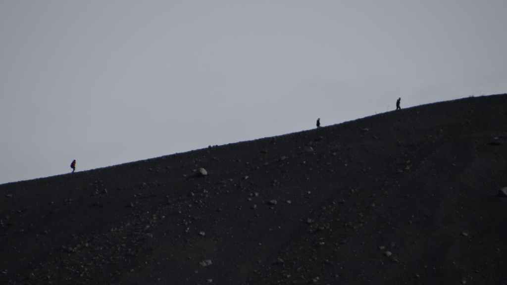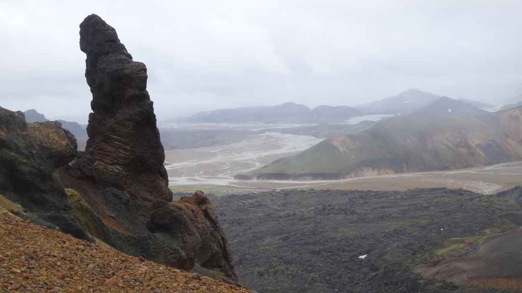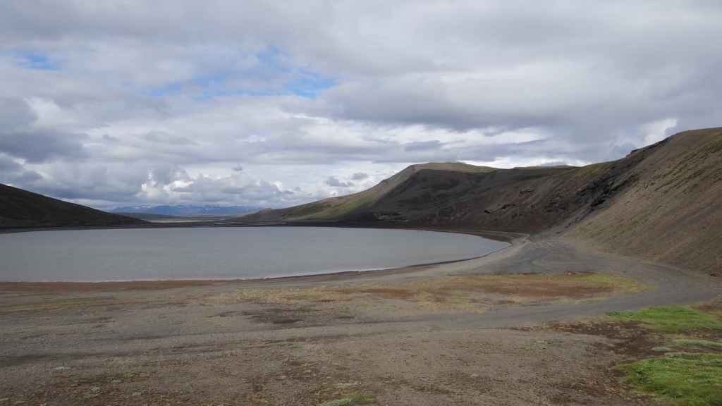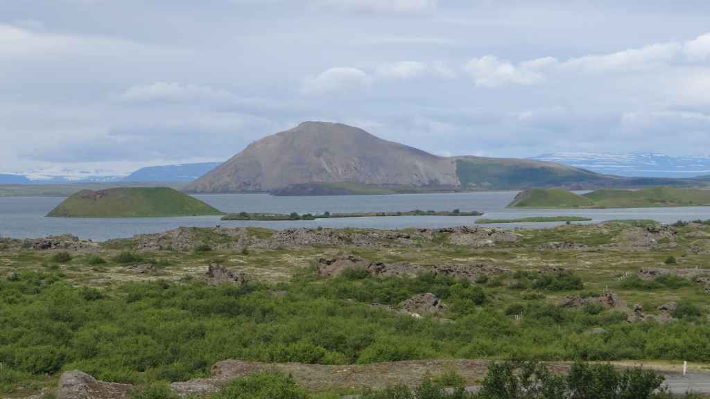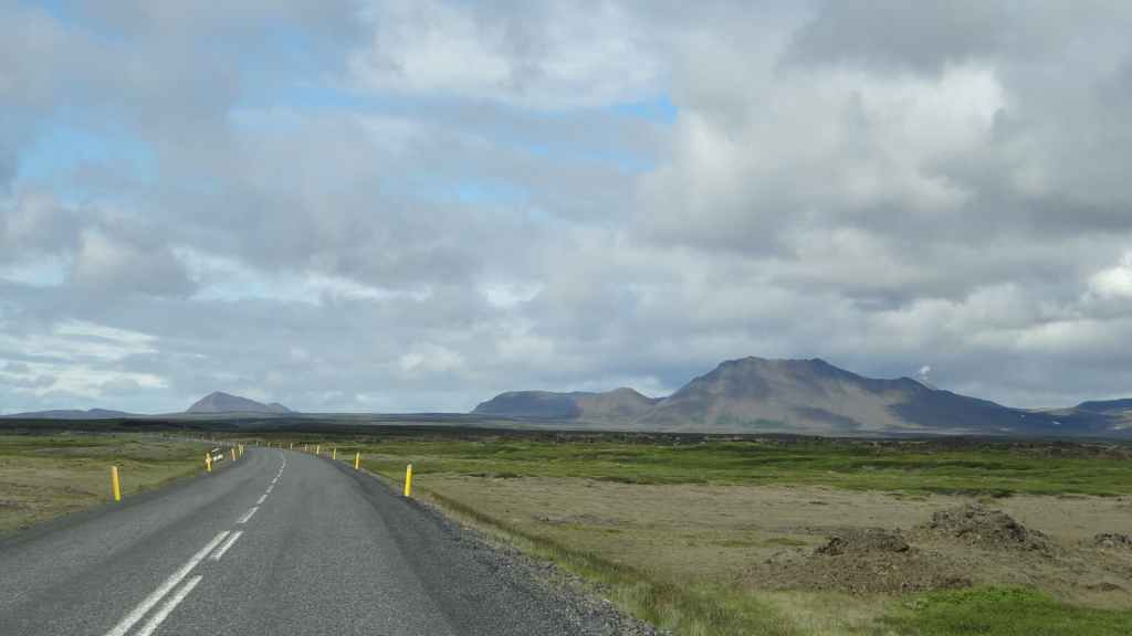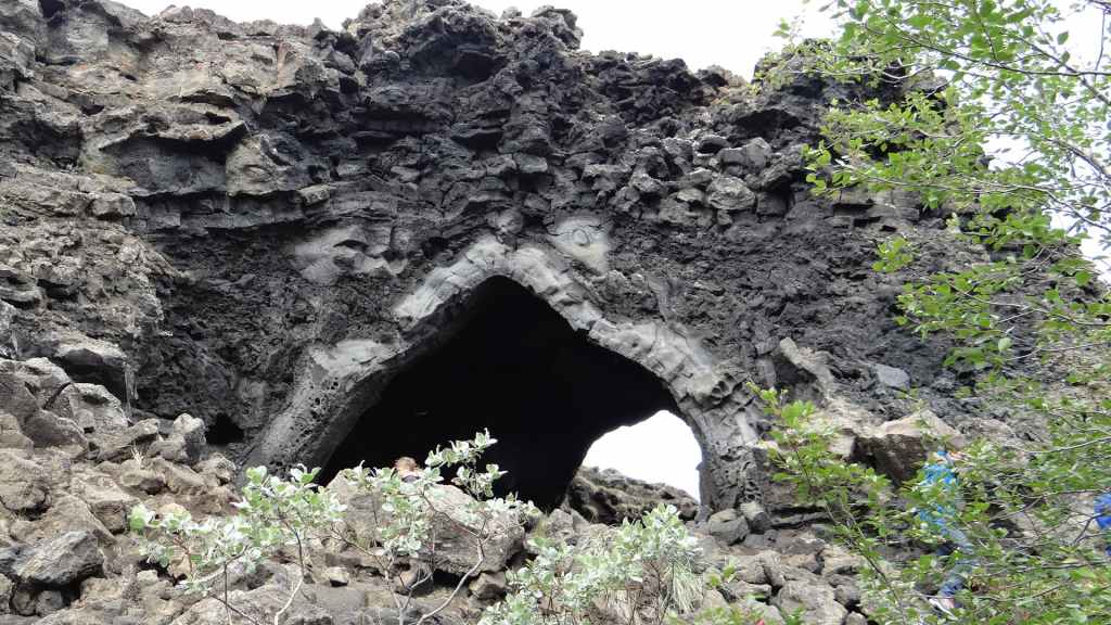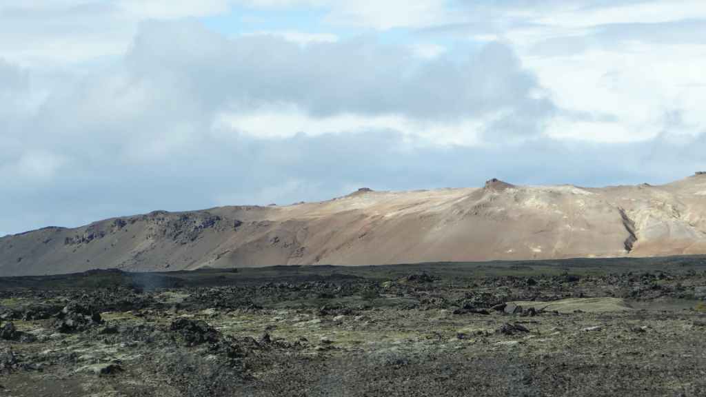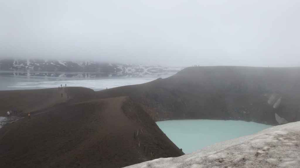 Après la pluie de la nuit, le ciel est resté chargé au réveil. Nous décidons tout de même de partir pour une balade de 3h près du village. Au départ de Dimmuborgir (châteaux noirs), du nom des formes particulières de ce champ de lave, nous rejoignons le pied du volcan Hverfjäll. La montée vers la lèvre du cratère est des plus raides. Mais la vue en vaut la peine, d’autant plus que les éclaircies deviennent assez généreuses.