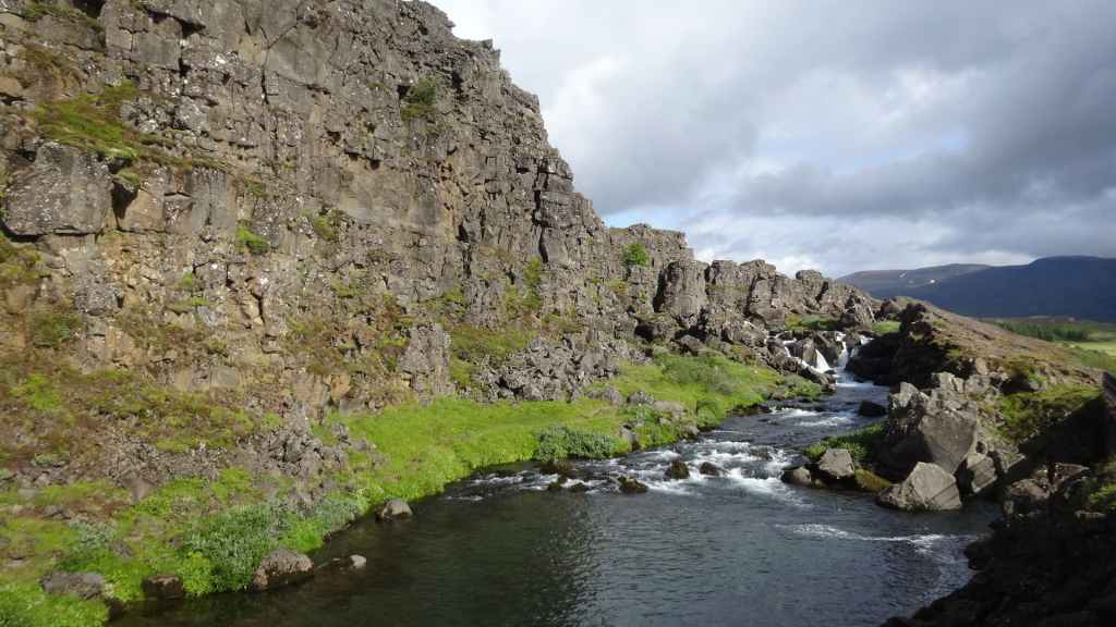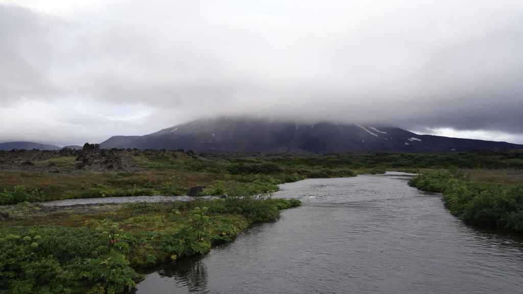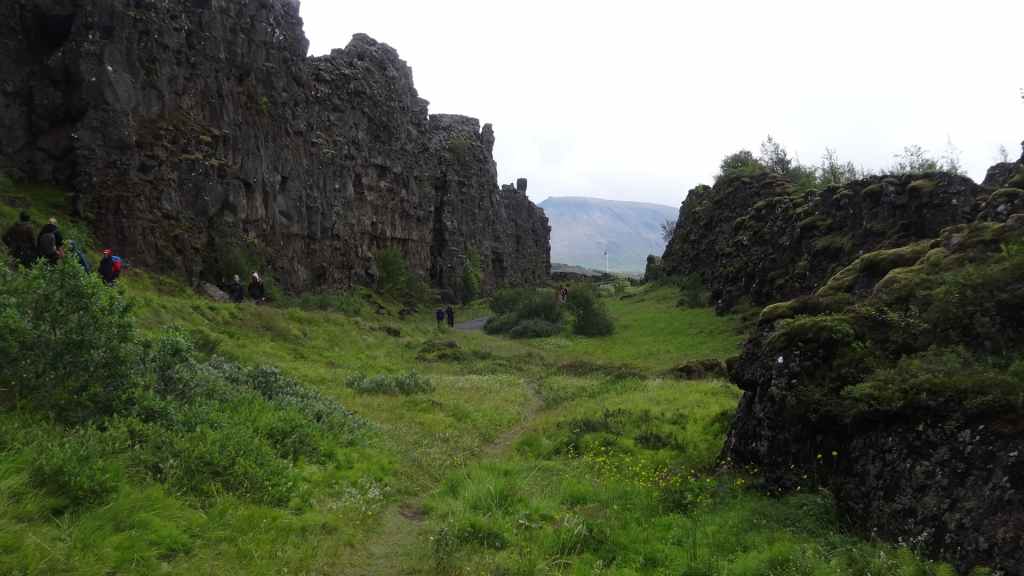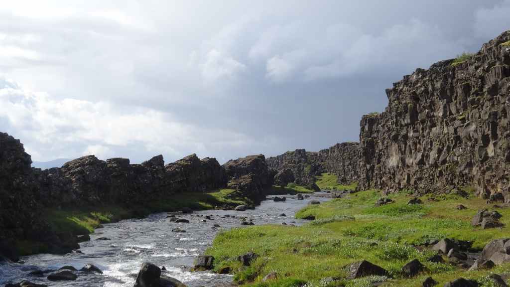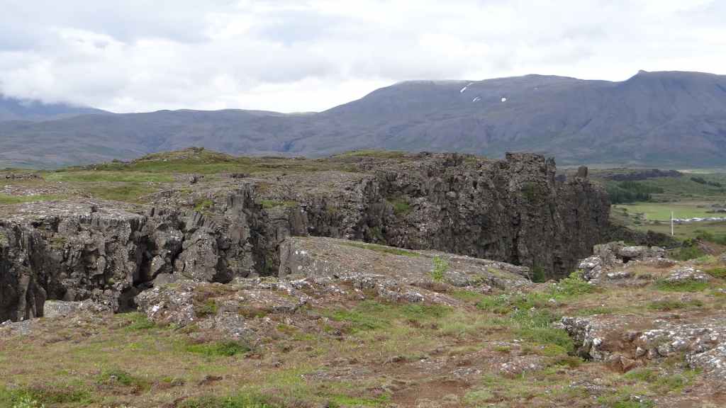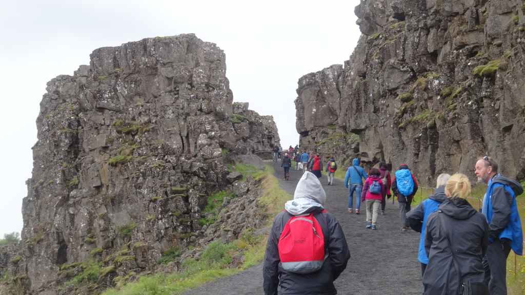 Ce matin, le ciel est toujours bas. Nous avons décidé de partir visiter un site historique et géologiquement important puisqu’il s’agit de la faille qui sépare la plaque tectonique eurasienne de la plaque américaine. Nous en profitons pour faire une balade de 2 heures autour du site. La faille qui s’élargit d’1 à 18 mm par an est très visible et forme une gorge au milieu de roches basaltiques.