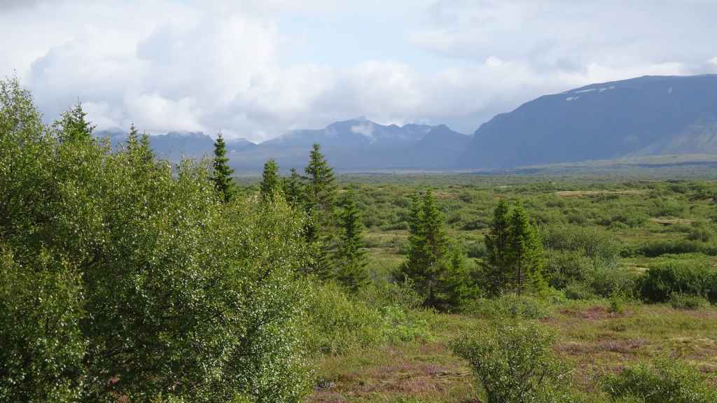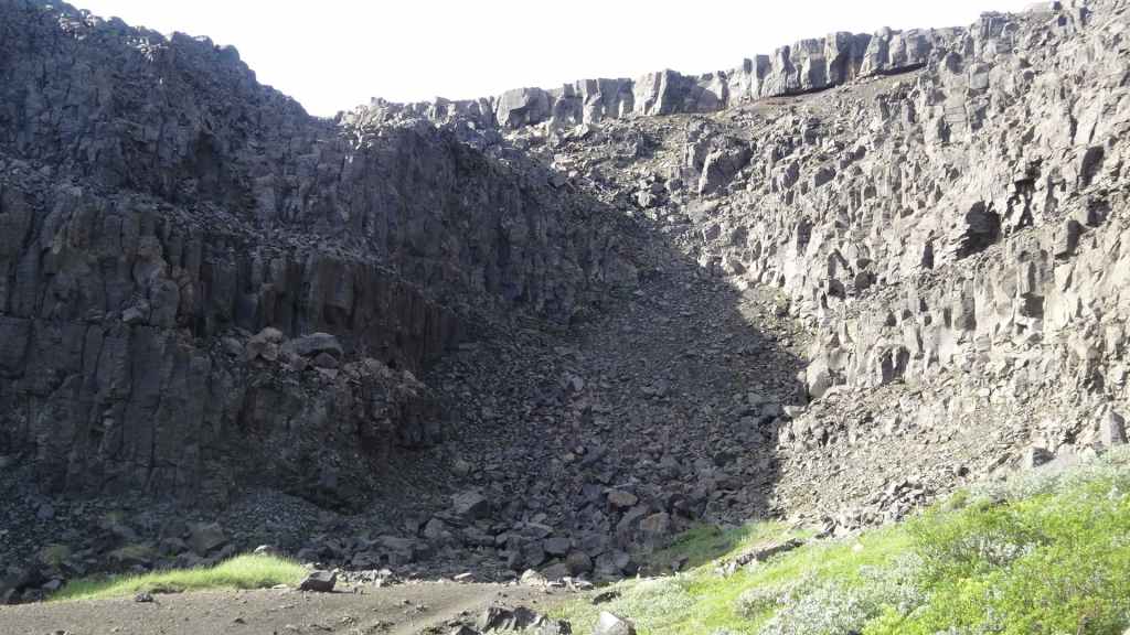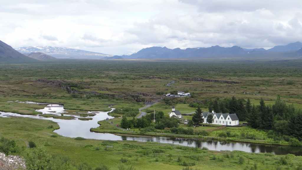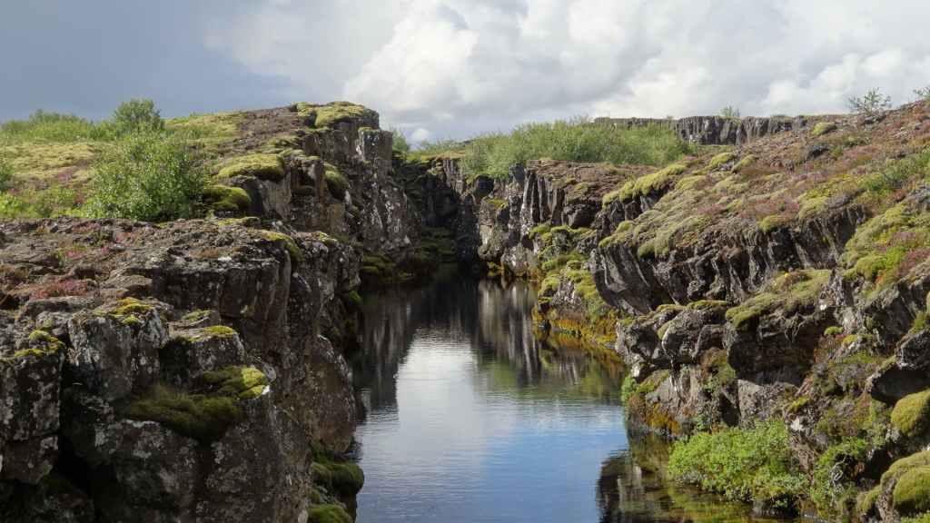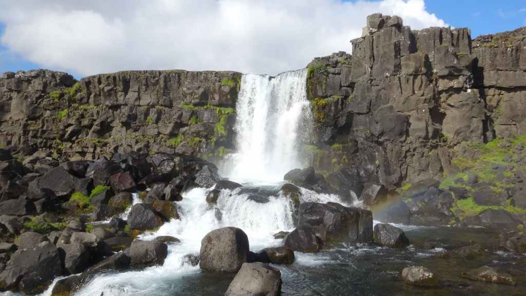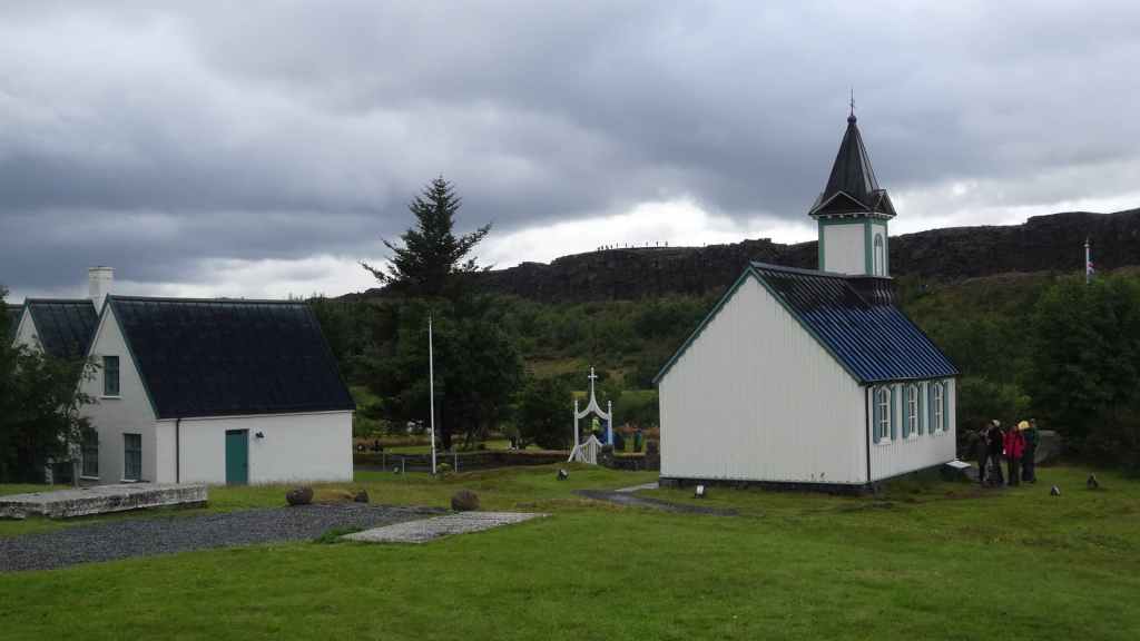 Ce matin, le ciel est toujours bas. Nous avons décidé de partir visiter un site historique et géologiquement important puisqu’il s’agit de la faille qui sépare la plaque tectonique eurasienne de la plaque américaine. Nous en profitons pour faire une balade de 2 heures autour du site. La faille qui s’élargit d’1 à 18 mm par an est très visible et forme une gorge au milieu de roches basaltiques.