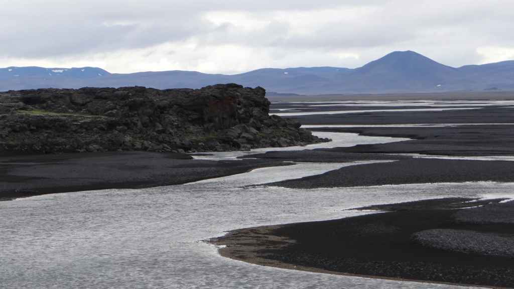 Ce matin, le ciel est encore bien chargé. On reprend la F88 en direction du lac Myvatn. Toujours une alternance de champs de lave et de grandes plaines de cendres, de bosses, de creux et de virages et 3 gués à franchir dont 2 assez larges mais pas de problème ! Par contre, quelques soucis mécaniques : les carters de disques de frein qui frottent sur les disques (j’arrive à réparer ce problème) et un anneau de fixation de la cellule qui s’arrache en partie. Là, c’est plus gênant, car irréparable. Heureusement que j’avais doublé ce système de fixation. Il y a donc encore un anneau qui tient bien mais nous devrons être vigilants pour la suite.