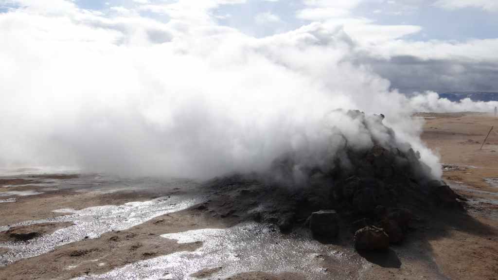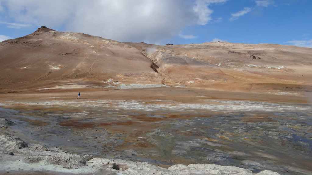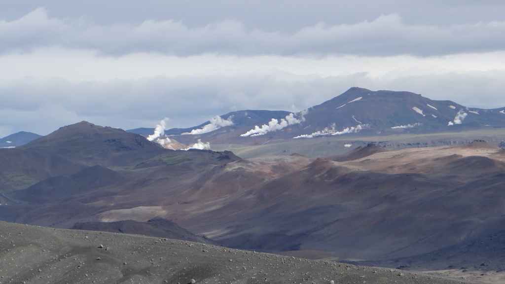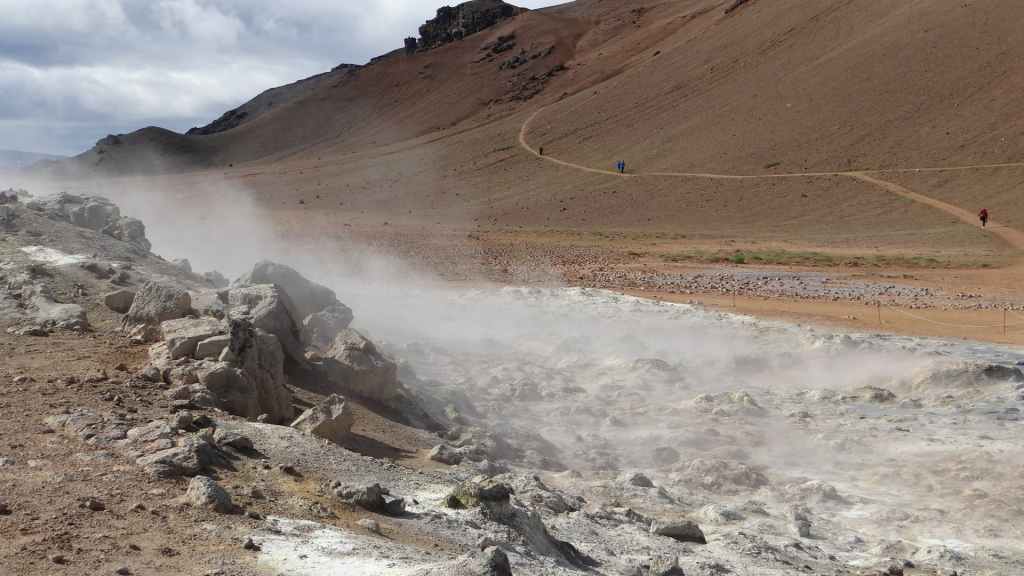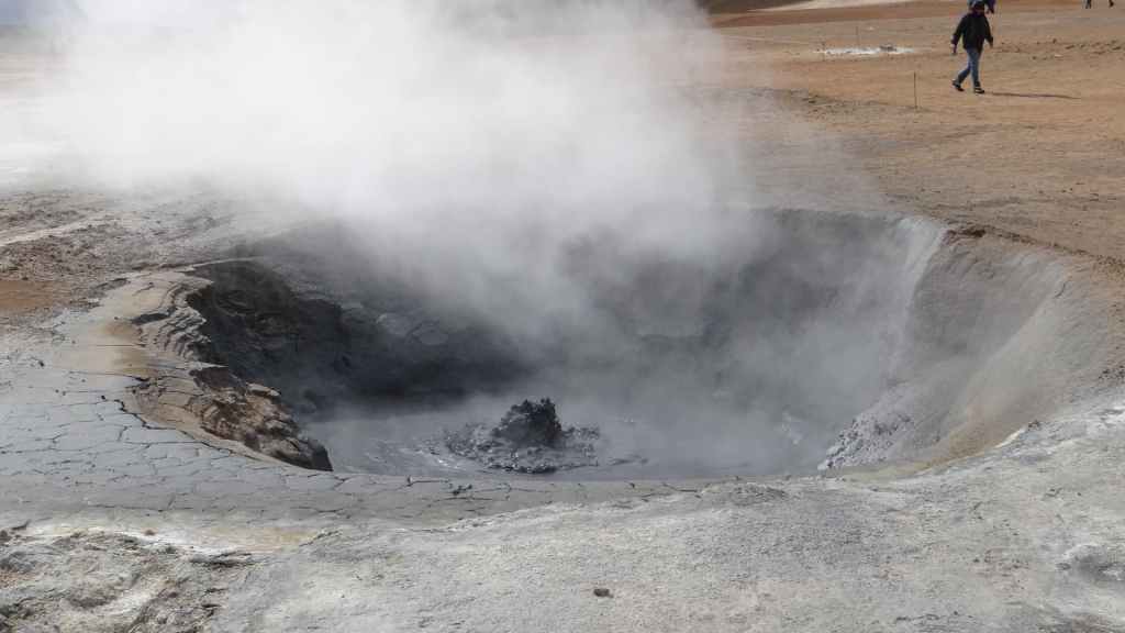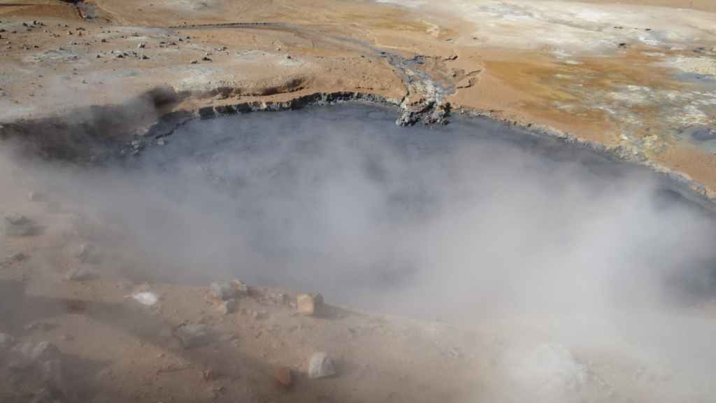 Nous sortons enfin de la piste sur la route circulaire, la N1 en fin de matinée. A l’approche de Mytvan, on aperçoit des fumerolles et un parking. Nous nous arrêtons pour visiter le site des solfatares de Hverir : vapeurs d’hydrogène sulfuré et marmites de boue bouillantes, dans un site au couleurs flamboyantes.