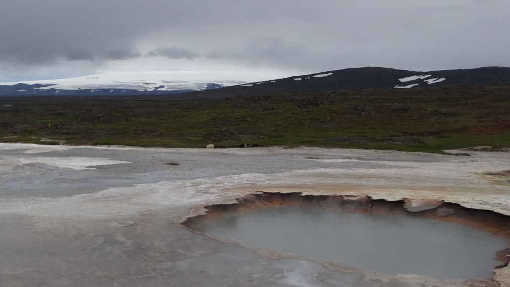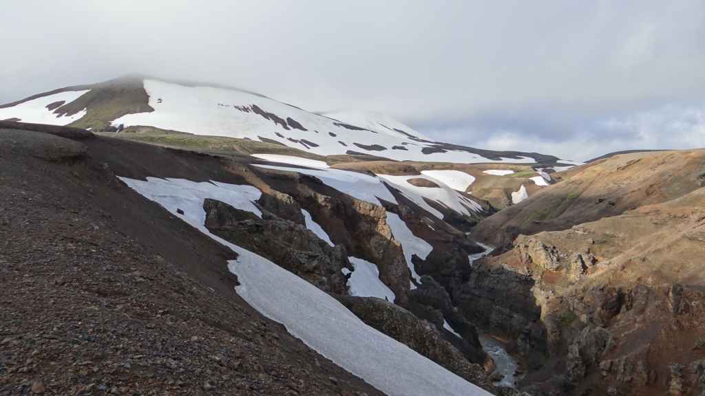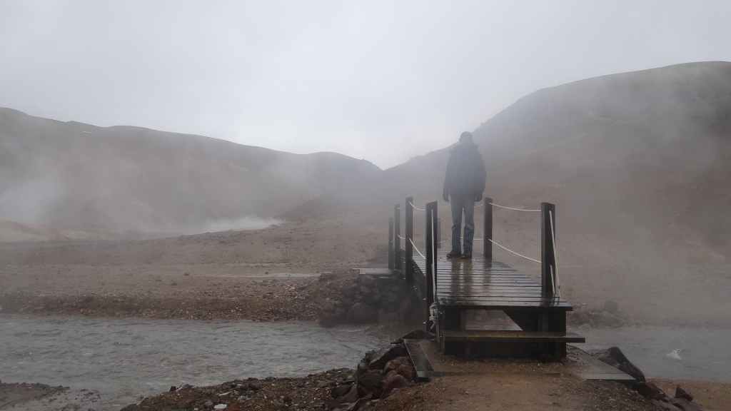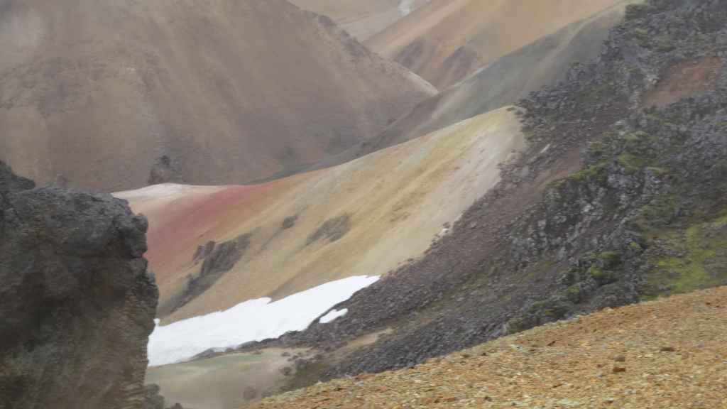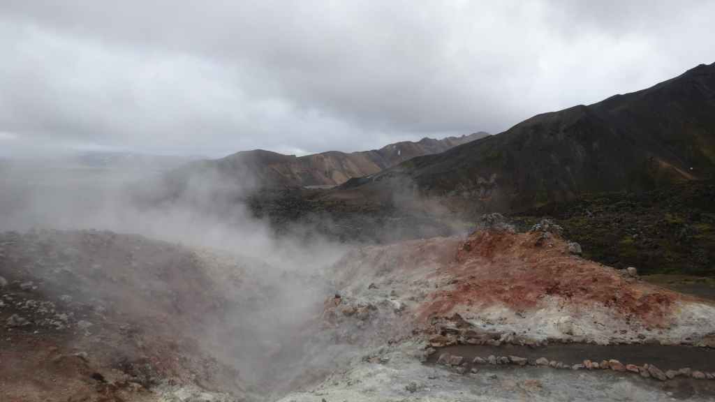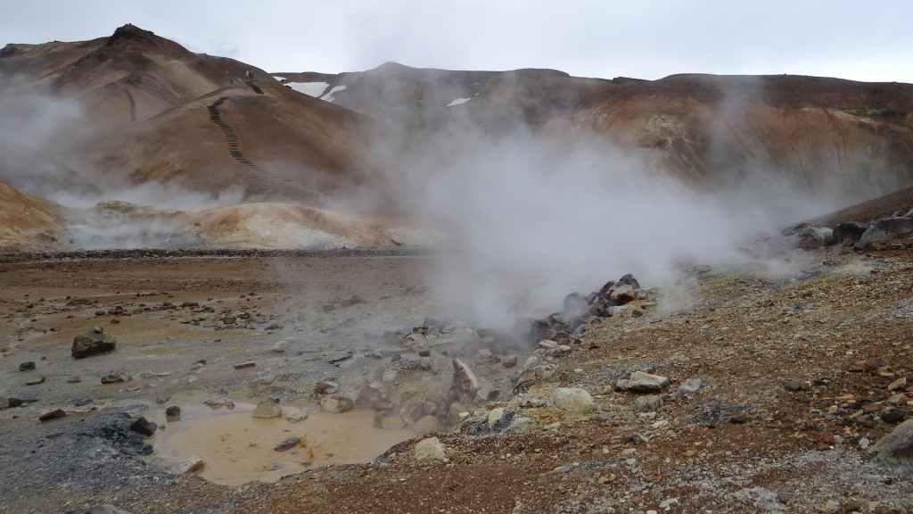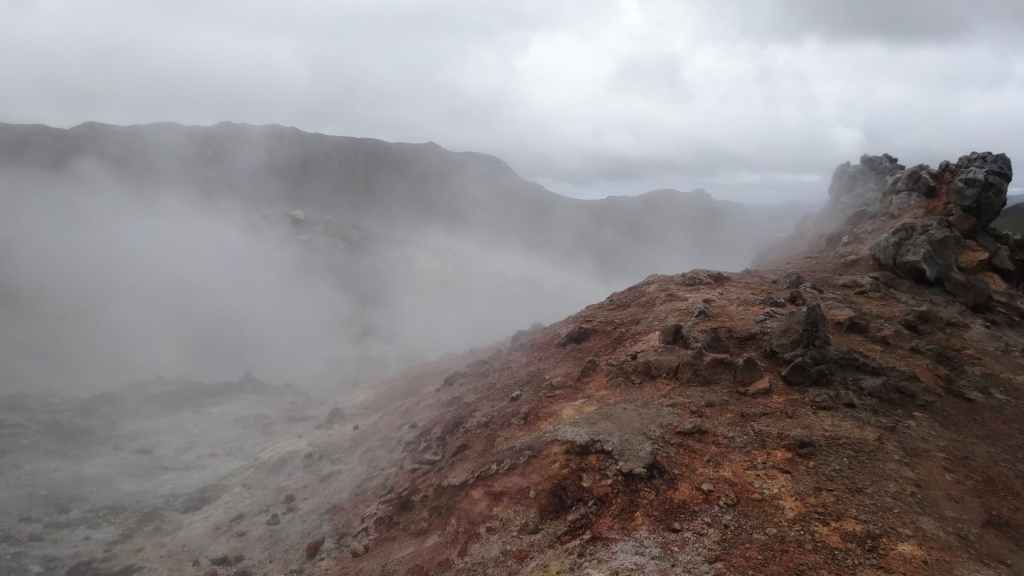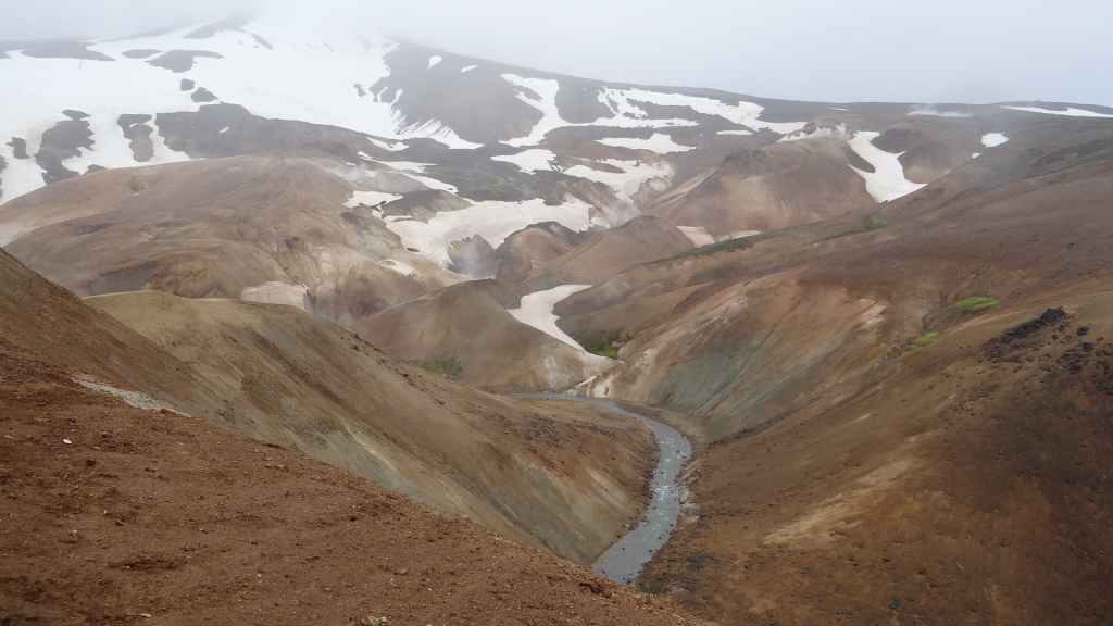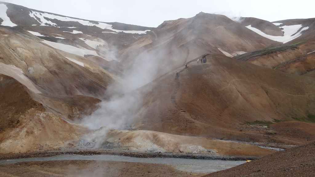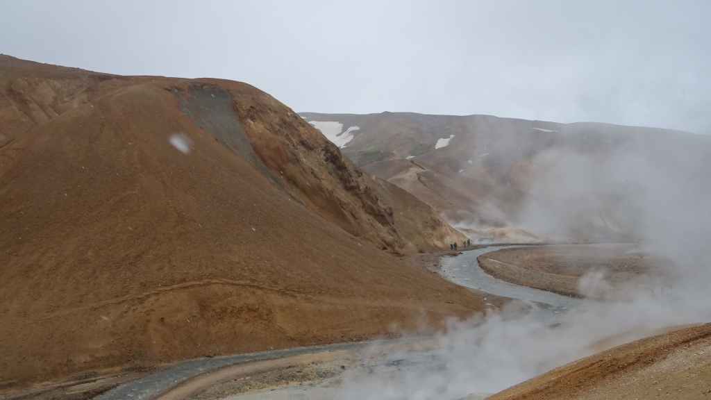 A l’approche du site, la pluie se met à tomber. Les odeurs de soufre se font plus précises. Nous descendons au fond, vers la rivière, au milieu des couleurs allant du jaune à l’ocre et du rouge au vert sans oublier le noir. En reprenant le chemin du retour, 2 averses de neige nous rappellent que l’on peut trouver l’hiver en plein été en Islande.
