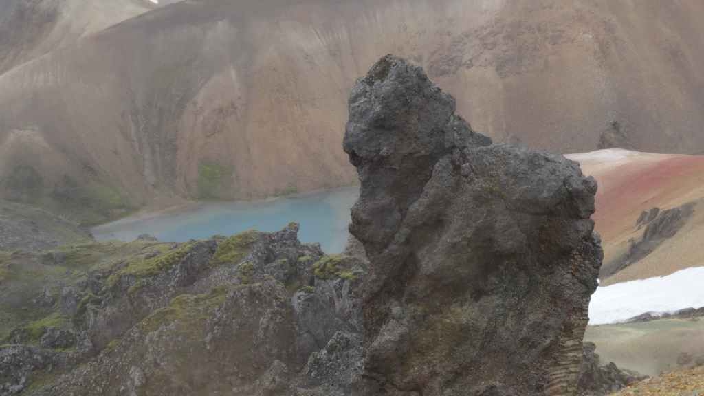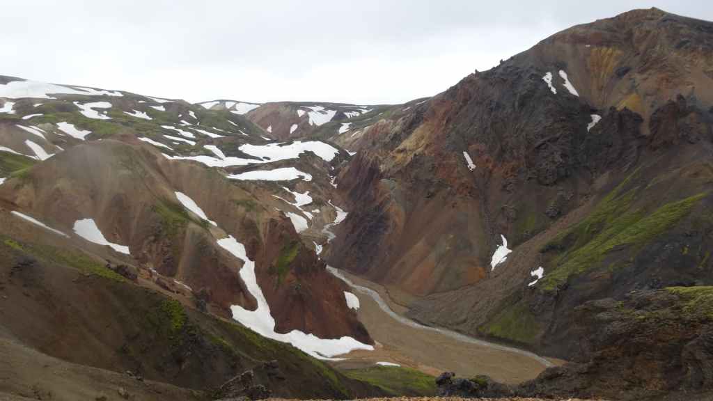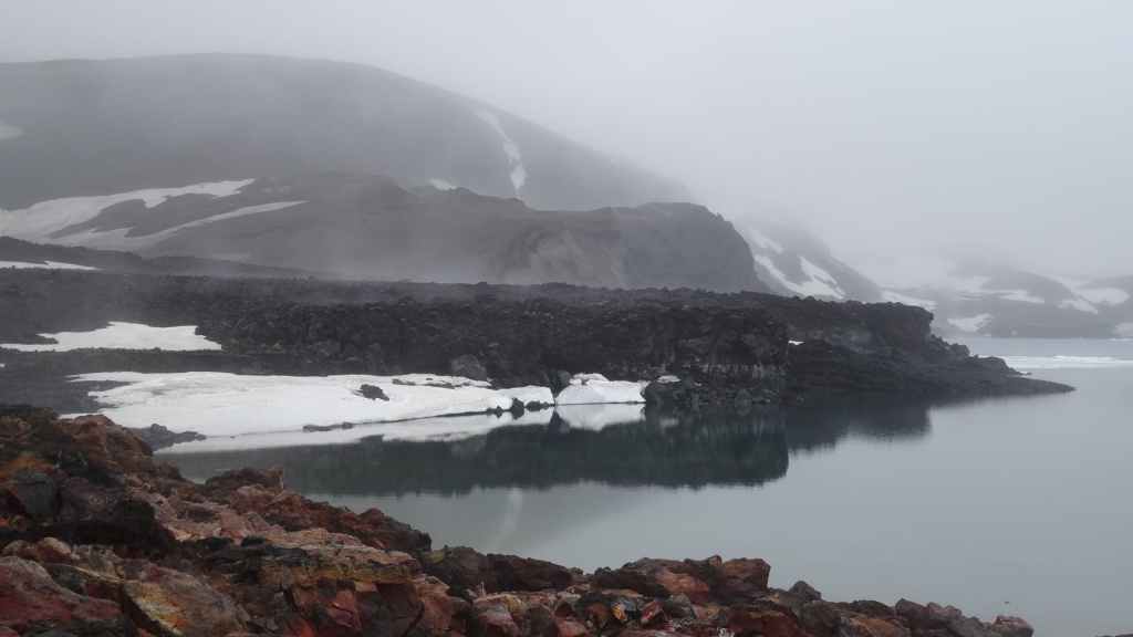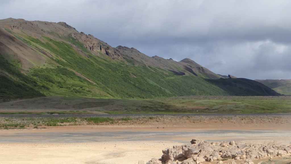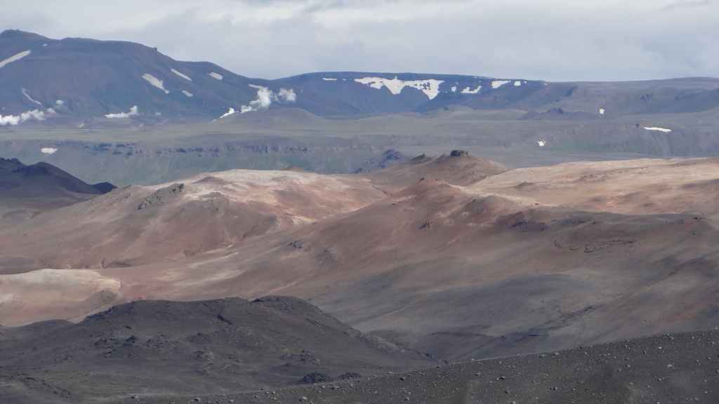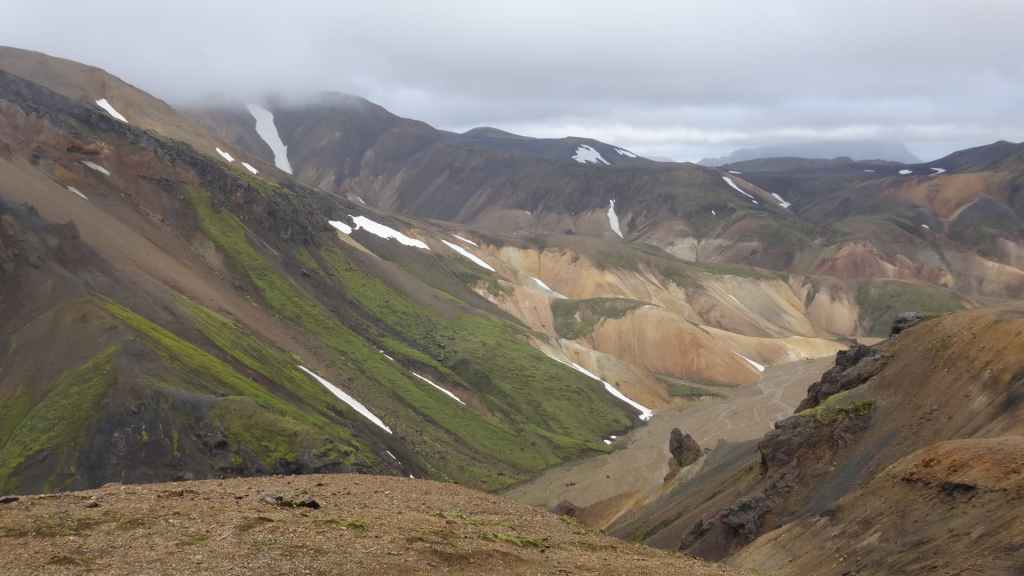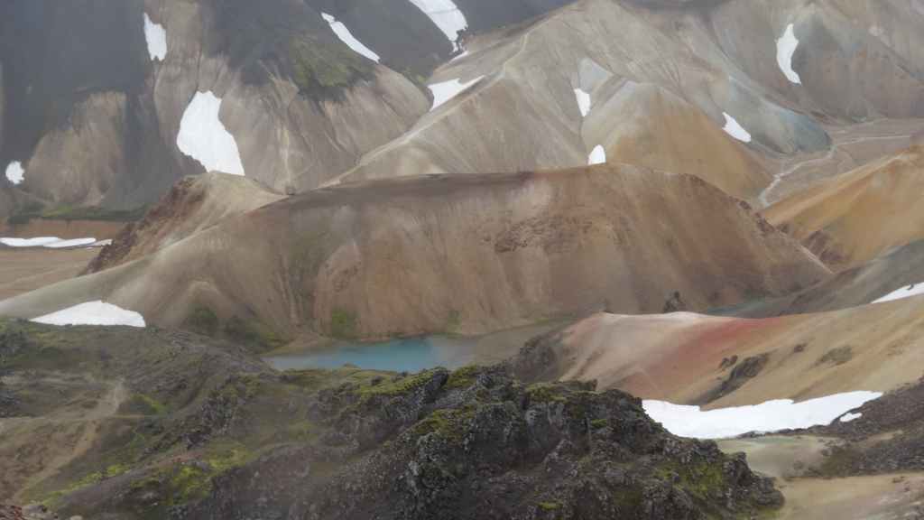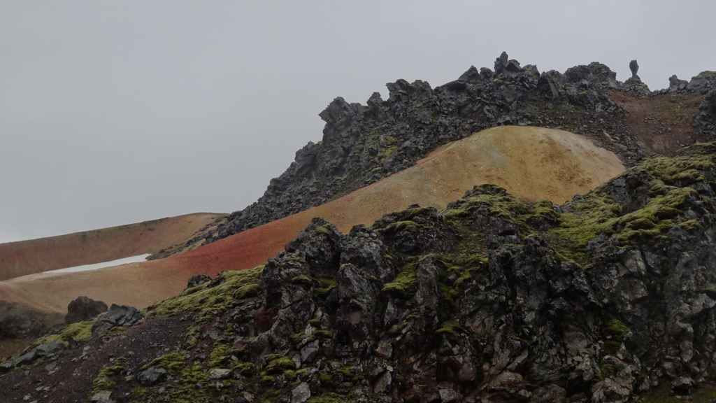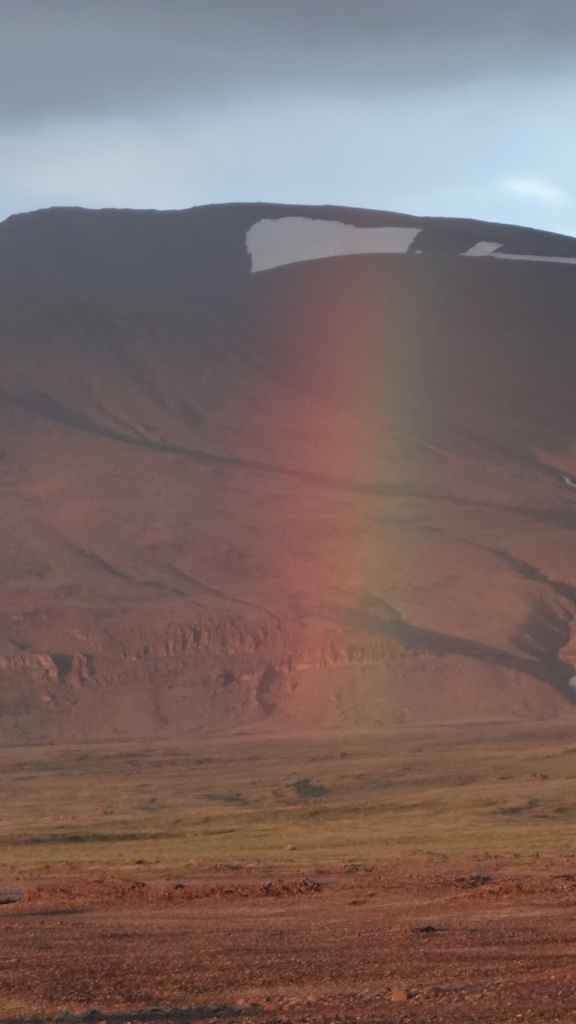 A l’approche du site, la pluie se met à tomber. Les odeurs de soufre se font plus précises. Nous descendons au fond, vers la rivière, au milieu des couleurs allant du jaune à l’ocre et du rouge au vert sans oublier le noir. En reprenant le chemin du retour, 2 averses de neige nous rappellent que l’on peut trouver l’hiver en plein été en Islande.