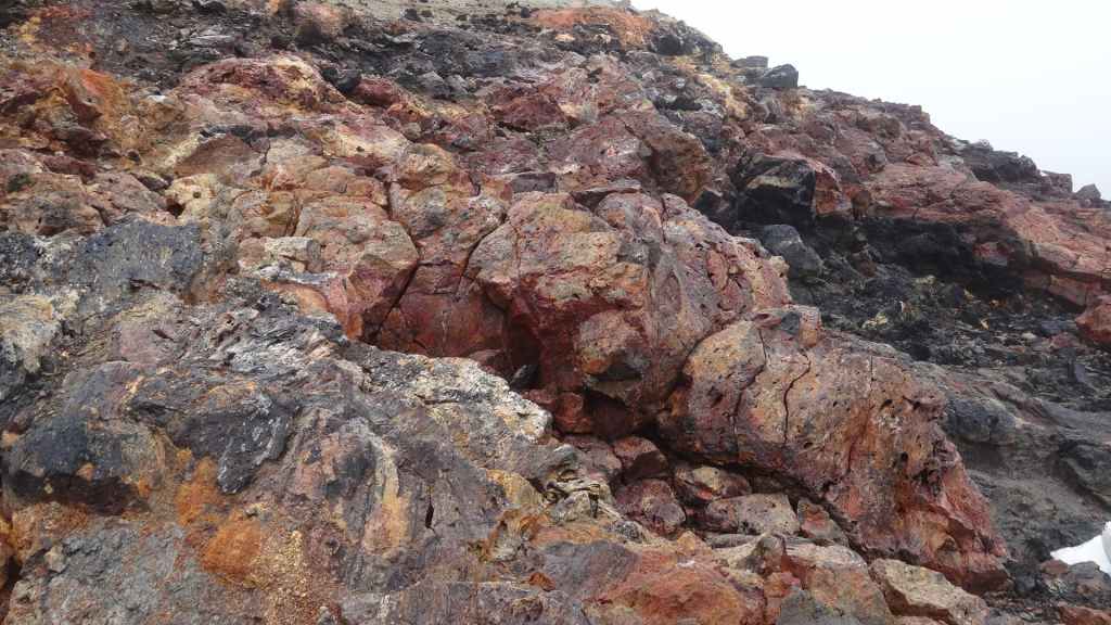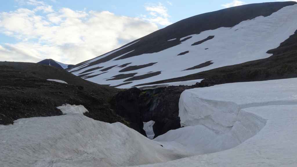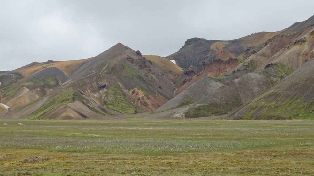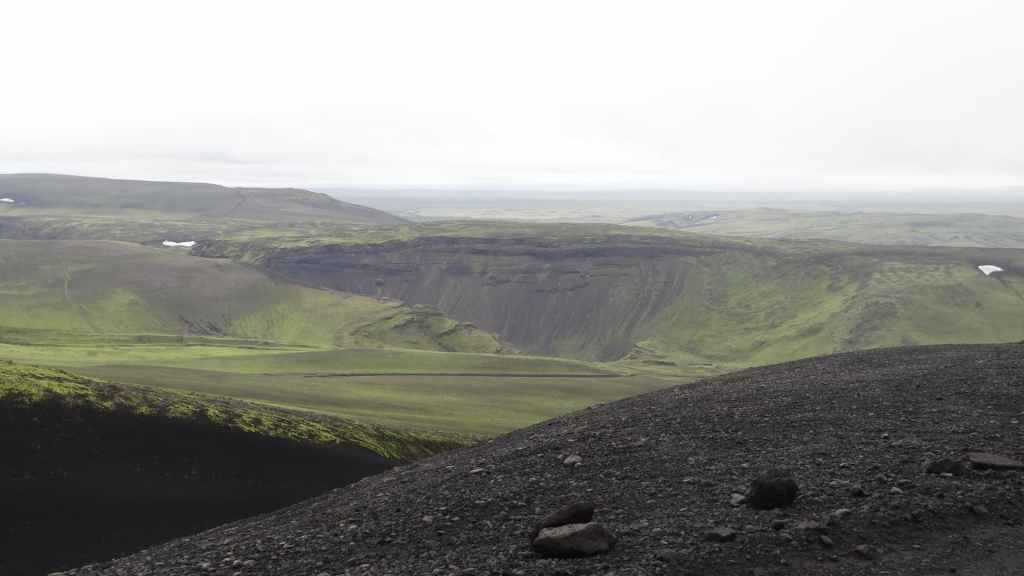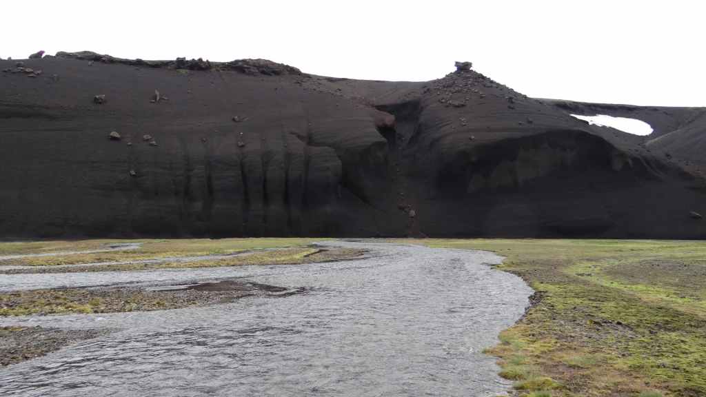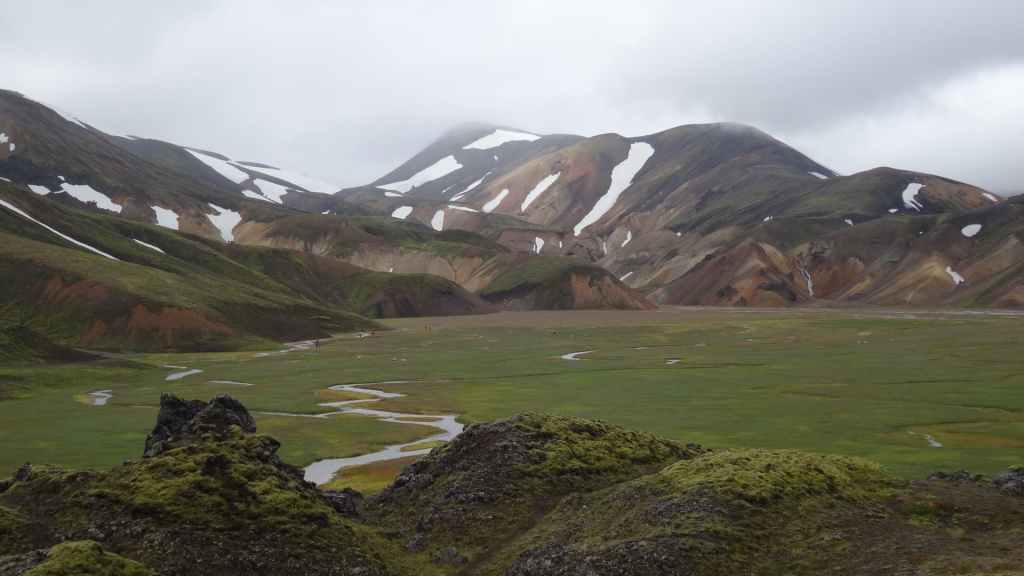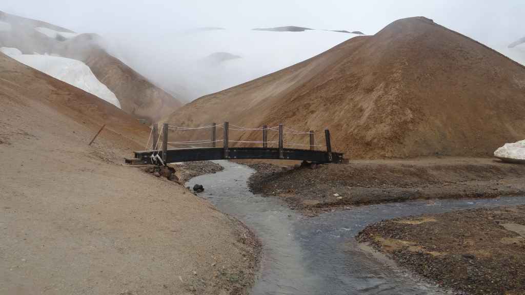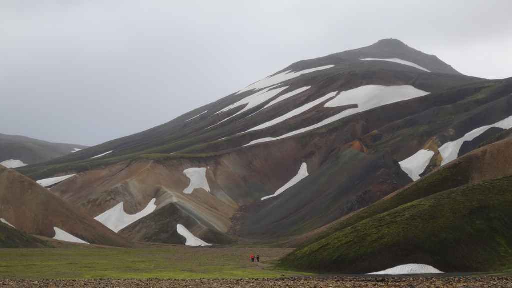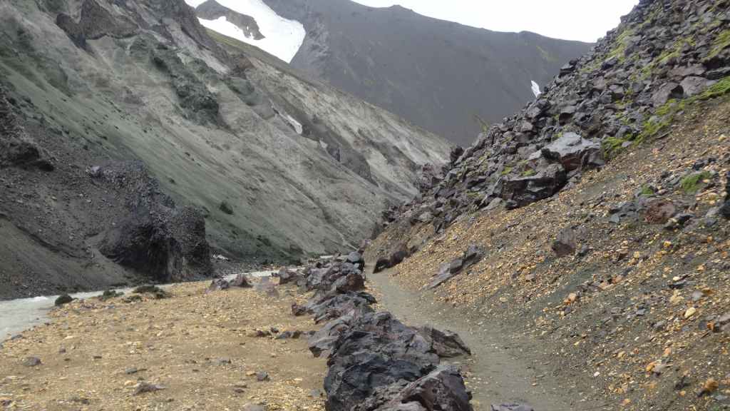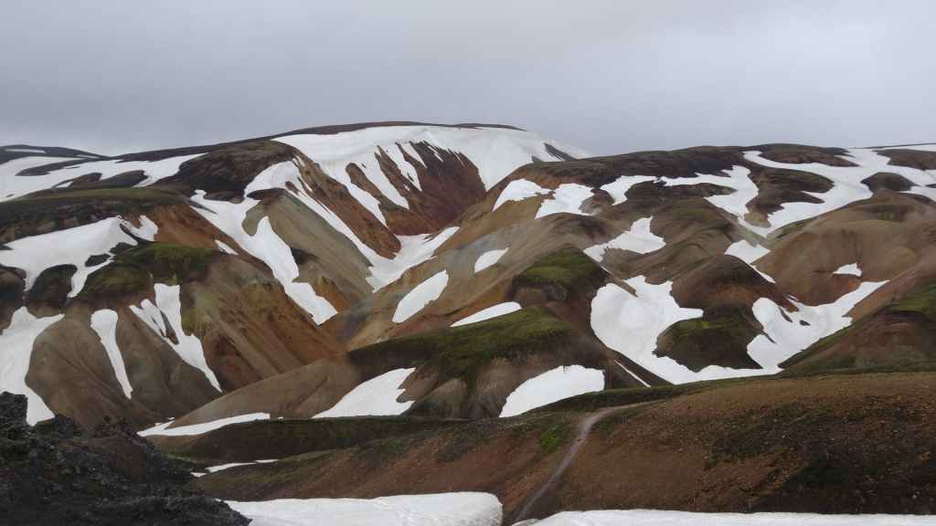 A l’approche du site, la pluie se met à tomber. Les odeurs de soufre se font plus précises. Nous descendons au fond, vers la rivière, au milieu des couleurs allant du jaune à l’ocre et du rouge au vert sans oublier le noir. En reprenant le chemin du retour, 2 averses de neige nous rappellent que l’on peut trouver l’hiver en plein été en Islande.