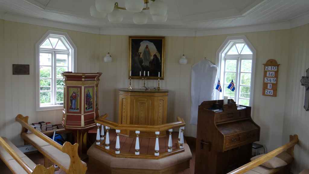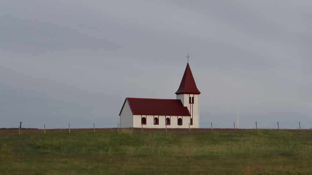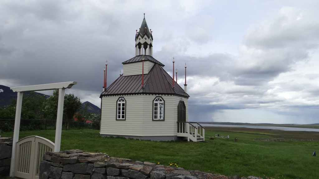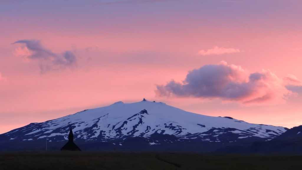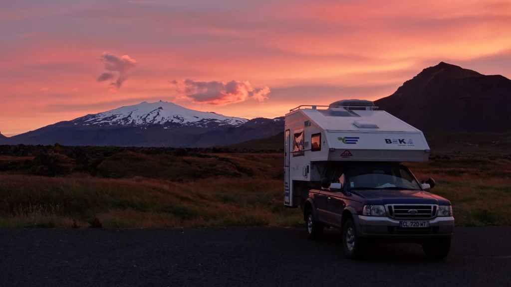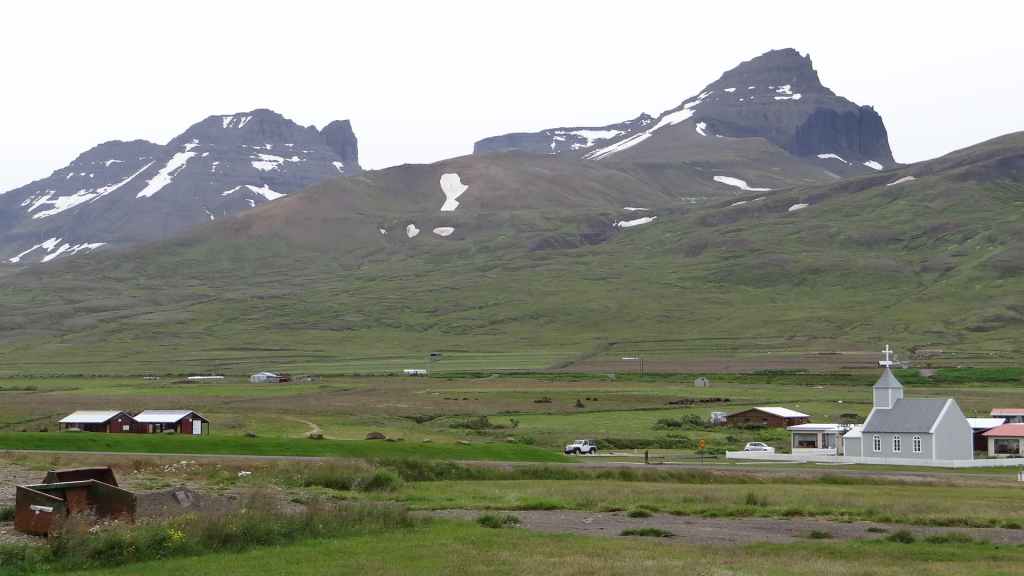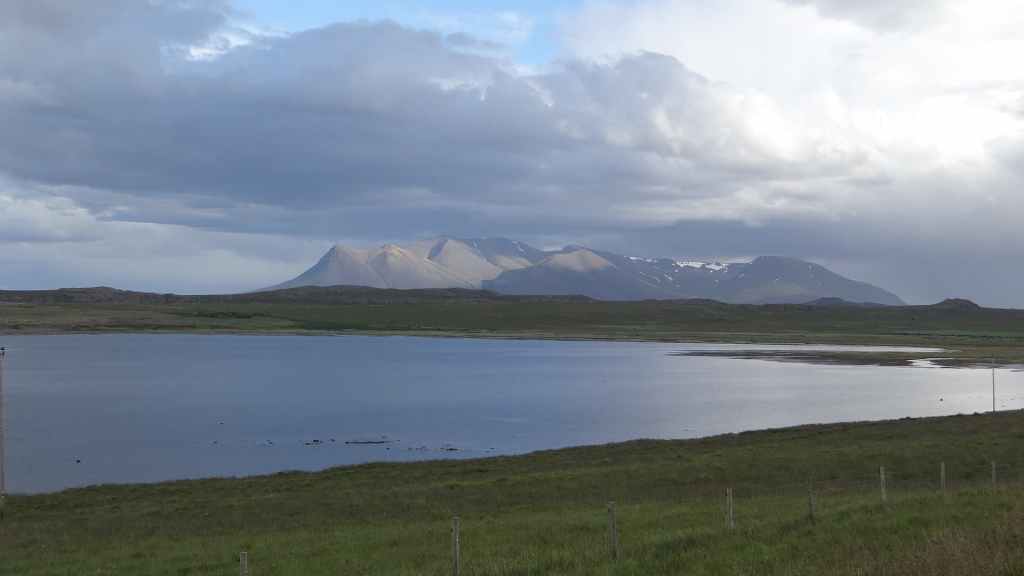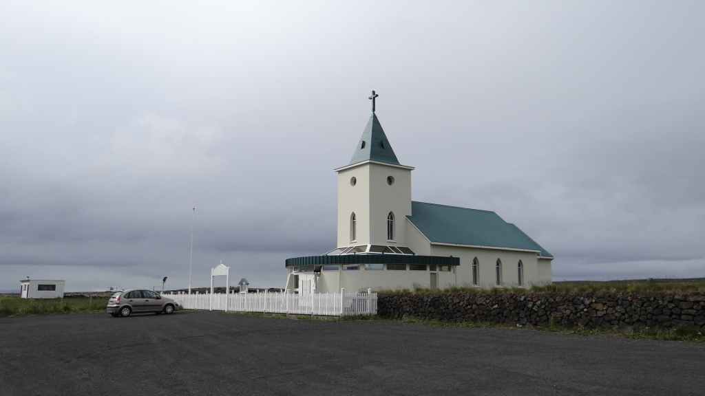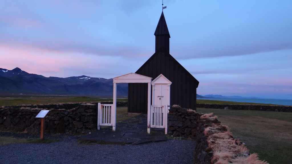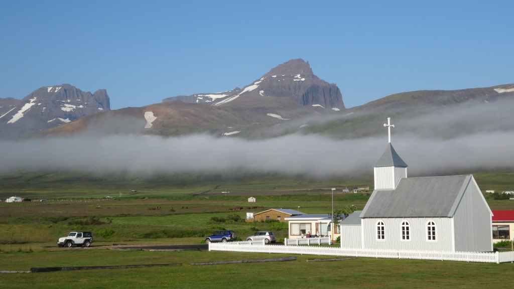 La faim commençant à nous tenailler, nous décidons de nous arrêter à Hellnar, au restaurant de l’hôtel du même nom. Nous avons, avec un peu d’avance, un anniversaire à souhaiter ! Après, nous reprenons la route jusqu’à trouver un joli bivouac à Budir, près d’une petite église de bois. Une cellule y est déjà installée. Les couleurs du soir sont flamboyantes avec une mer d’un bleu-vert inconnu et le volcan complètement dégagé. Après une petite balade, nous faisons connaissance de nos voisins, qui habitent la région parisienne et qui sont en Islande pour la troisième fois : mais c’est la première fois qu’ils ont quelques demi-journées de soleil, étonnant !!!
