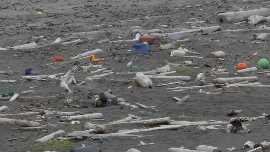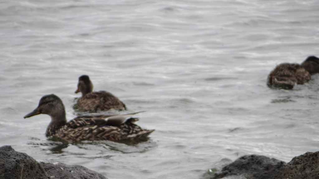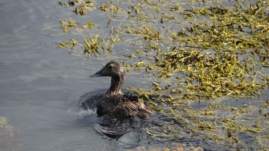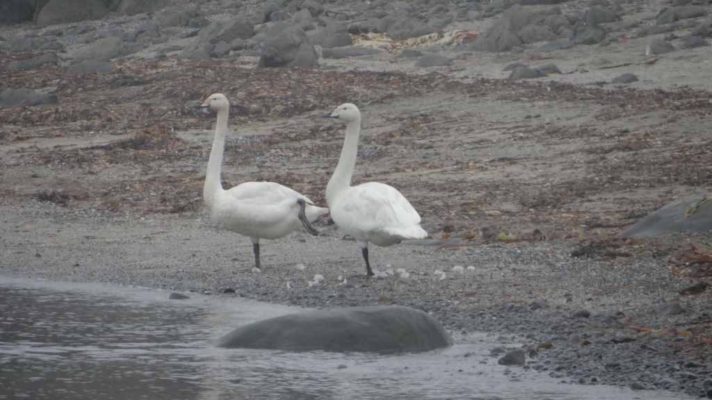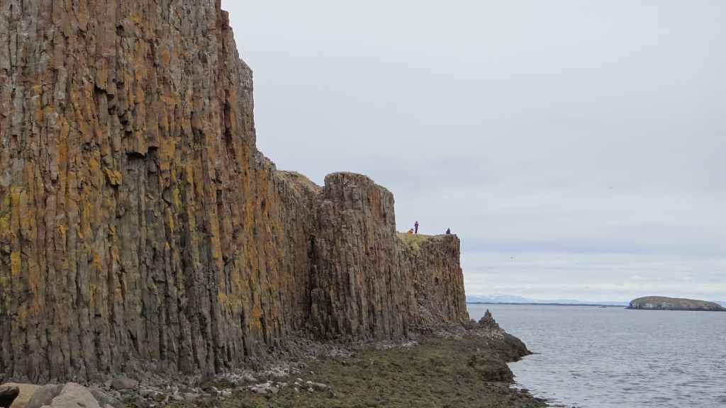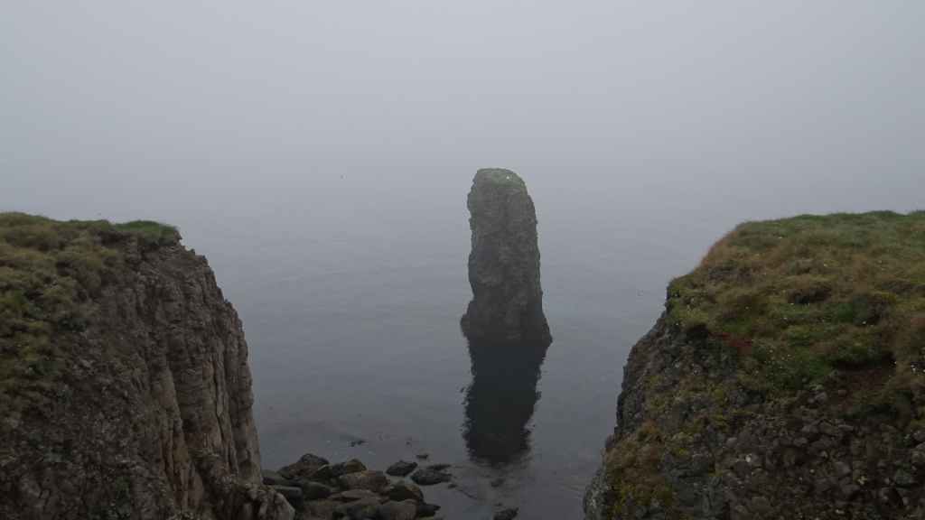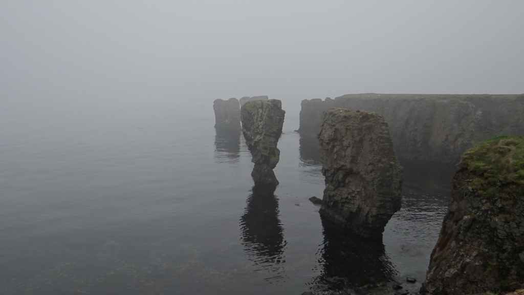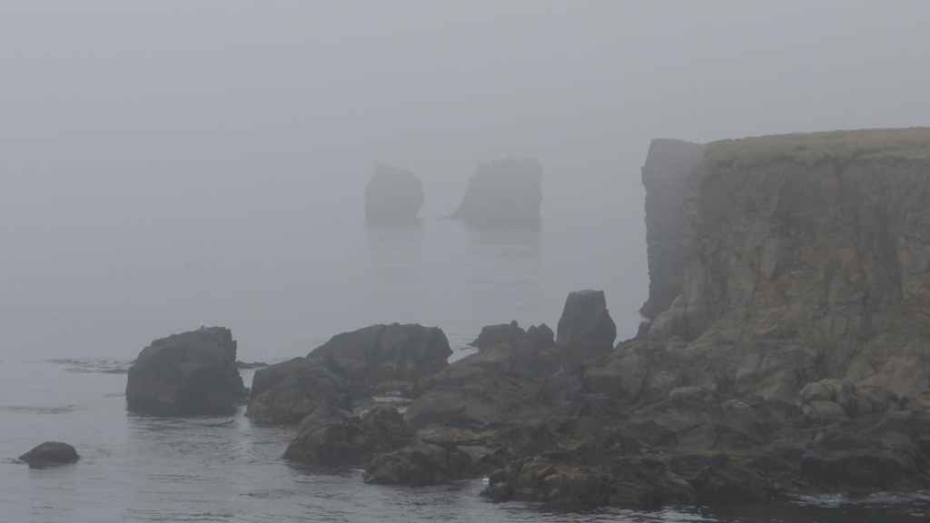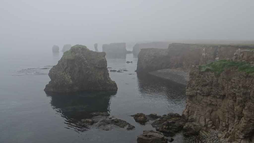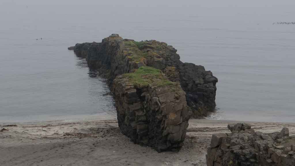 Nous avons bien fait d’en profiter car aujourd’hui, nous nous réveillons dans une purée de pois encore jamais vue ici ! Nous partons un peu au nord de Vopnafjördur pour une balade de 2 heures au bord de la mer. Même si la visibilité est à peine meilleure, le brouillard gâche un peu le lieu… quoique s’il était un peu plus épais, on ne verrait pas tous les déchets déposés par la mer sur la plage : objets divers en plastique et en fer, et moins gênant, beaucoup de bois flotté. On aperçoit tout de même des cygnes, de très nombreux canards, des goélands et des cormorans… et même devinez quoi ?… Un phoque qui barbote au milieu des canards. Mais le but de la balade est de voir des colonnes de basalte détachées des falaises. Elles donnent, entourées de brume, une ambiance mystérieuse, presque secrète.