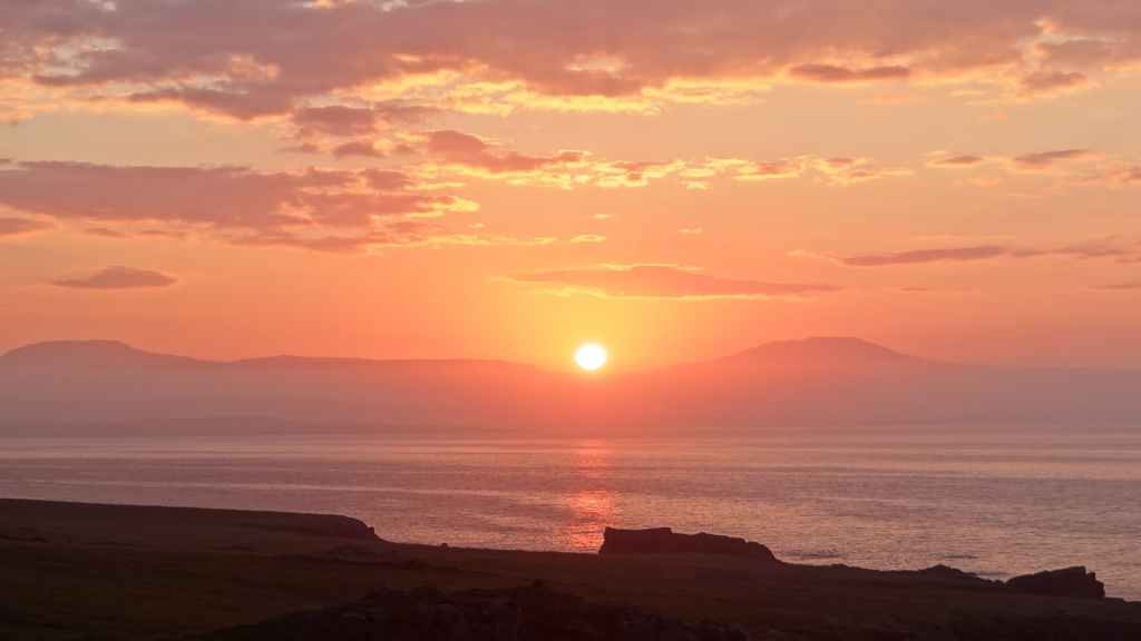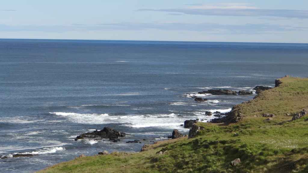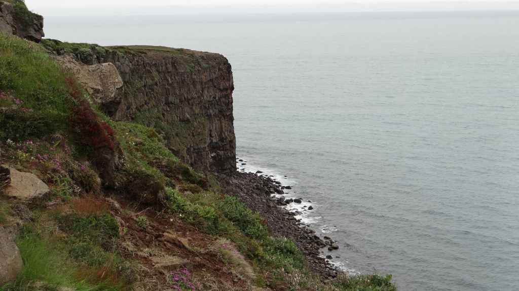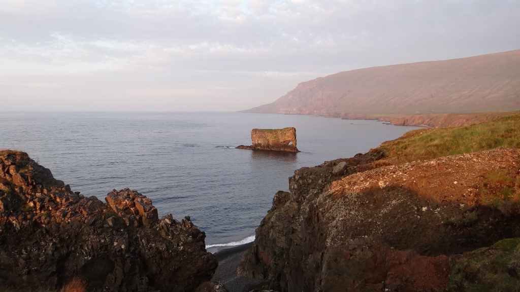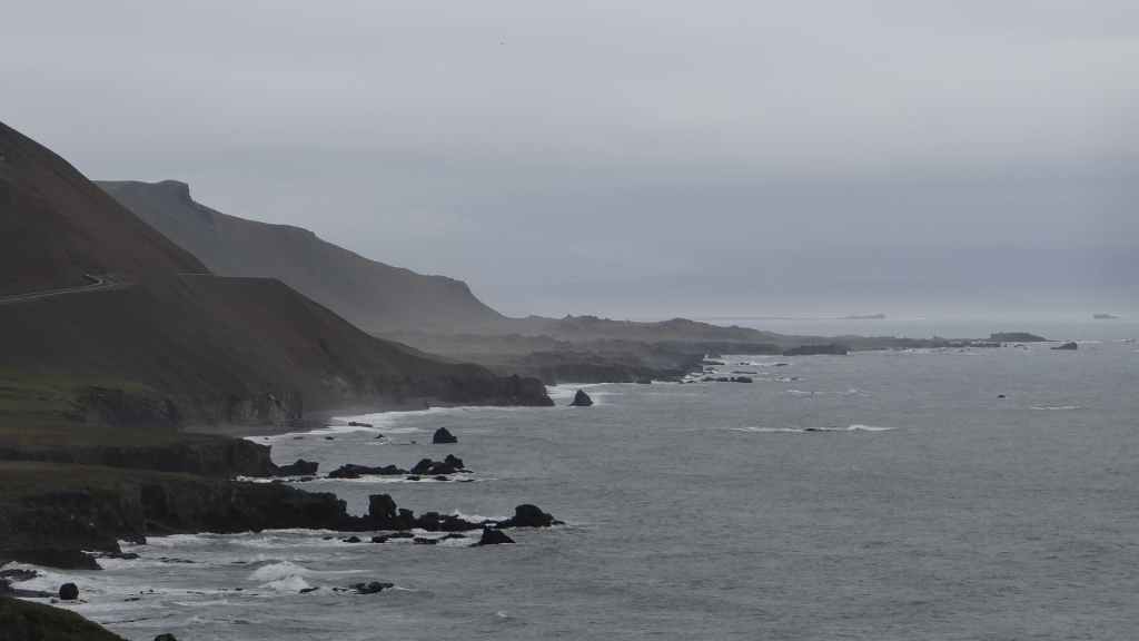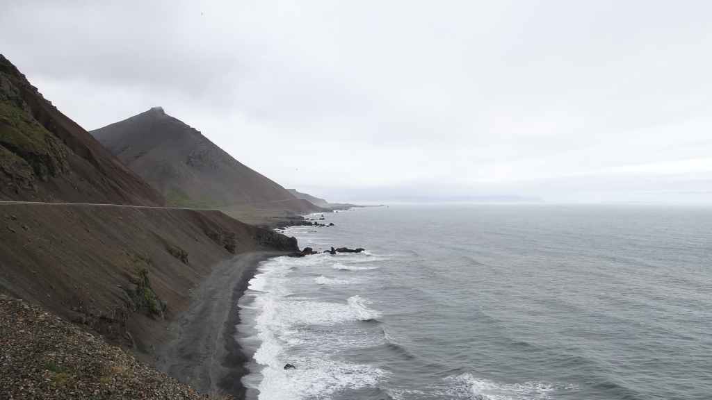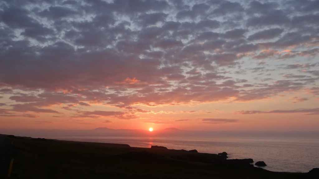 Après une petite bière bien fraîche, nous reprenons la piste vers le sud, puis vers le nord pour nous rendre près de Vopnafjördur. Nous posons notre cellule au bord de la piste, à deux pas d’une falaise surplombant la mer (65°45.202 / W 14°34.468). Malgré l’arrivée de nuages, nous assistons à un beau coucher de soleil. C’était aujourd’hui la plus belle journée du séjour…