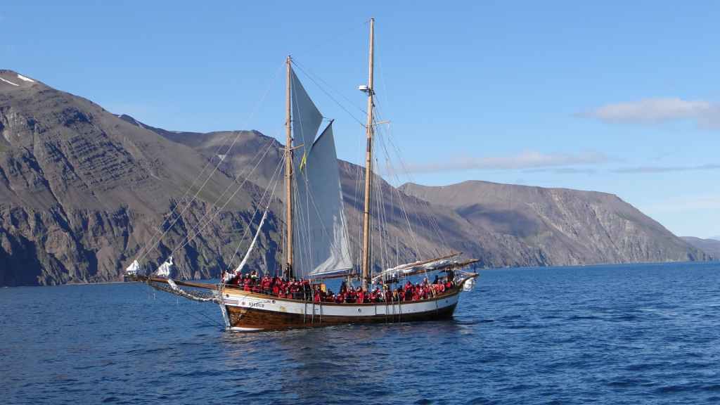 On se lève avec un magnifique ciel bleu, idéal pour notre promenade en mer. A 9h30, on embarque sur le Sylvia, un ancien bateau de pêche en bois de Gentle Giant. On enfile nos combinaisons antifroid et anti-embruns et nous nous éloignons du port. Les montagnes encore enneigées nous font face et il nous faut 1 heure pour rejoindre le lieu où croisent d’autres navires. Assez rapidement, on commence à apercevoir le jet d’eau typique de la respiration d’une baleine.