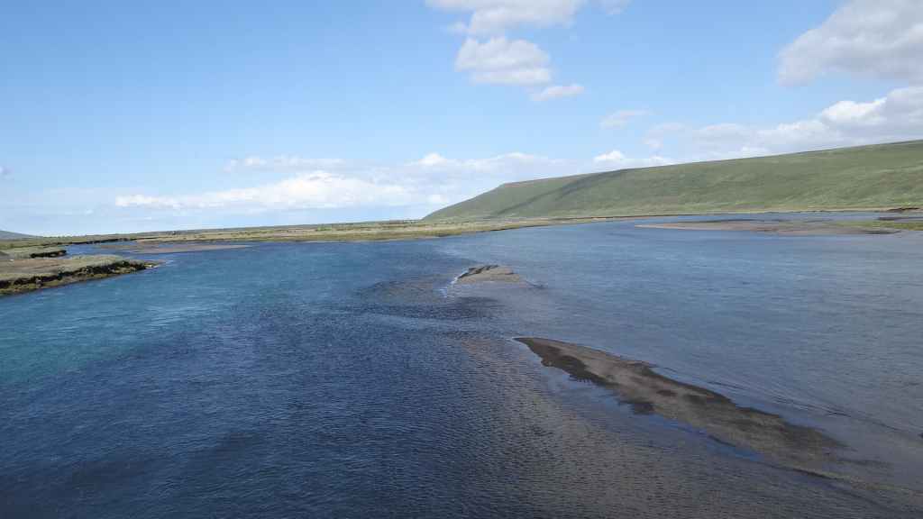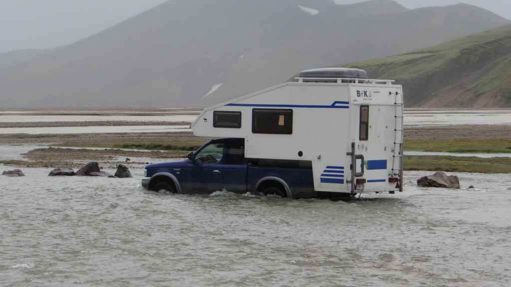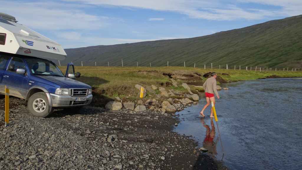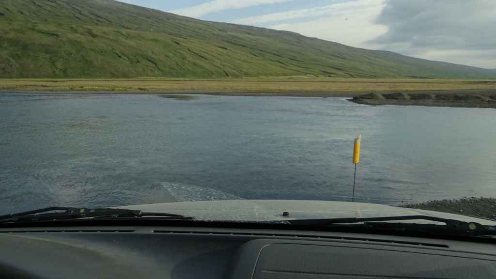 Après le repas, le brouillard est toujours présent, alors nous décidons de revenir vers le sud, ne sachant plus très bien où aller pour revoir le soleil, du moins pour revoir des paysages. Nous avons la désagréable impression d’errer en attendant le bateau. Nous empruntons la piste 907 où le soleil refait son apparition après une cinquantaine de kilomètres. Nous faisons un petit arrêt qui nous permet d’essayer de refaire l’étanchéité, près du lanterneau qui fuit toujours, puis repartons, toujours vers le sud sur la piste F923, où 4 gués sont à franchir. Les paysages sont sympas mais désertiques, puis nous empruntons une vallée plus verte. C’est là que le premier gué, d’une trentaine de mètres de largeur, nous stoppe net. Ne connaissant pas sa profondeur, je dois aller le sonder. Alors, j’enlève le pantalon, enfile mes sandales plastiques vieilles de 20 ans, et entame la traversée dans une eau bien froide ma foi… l’eau ne dépasse pas les genoux, donc aucun souci pour faire passer notre véhicule, ce qui est fait en moins de deux.