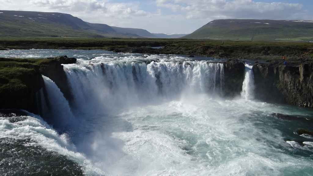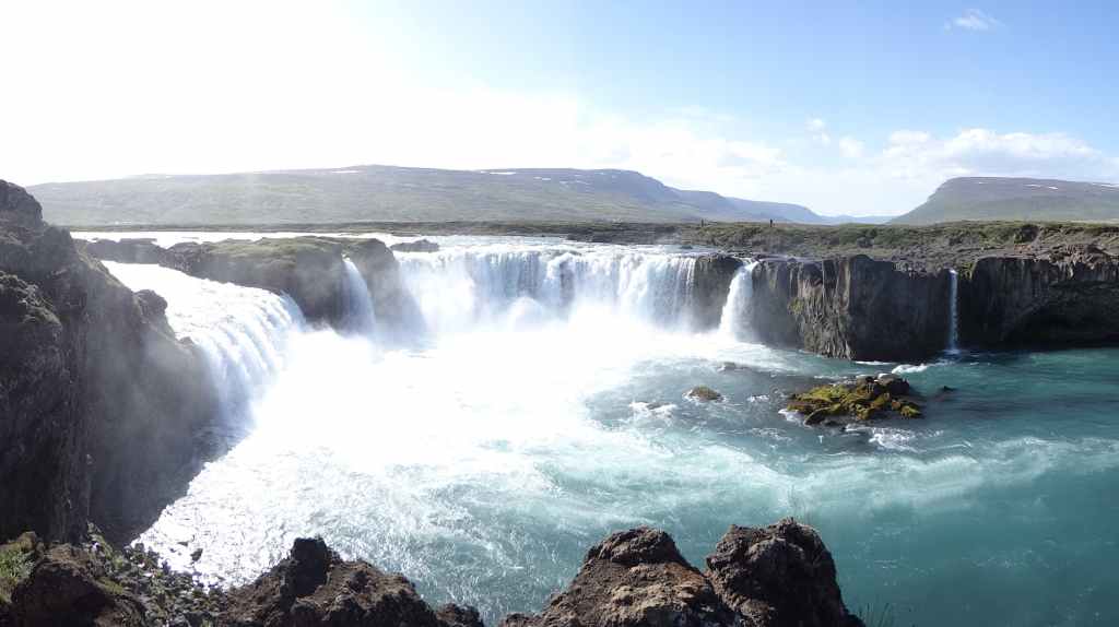 Au retour, nous prenons la direction de la cascade Godafoss. Même si les nuages ont refait leur apparition, la cascade aux eaux bleues est superbe.