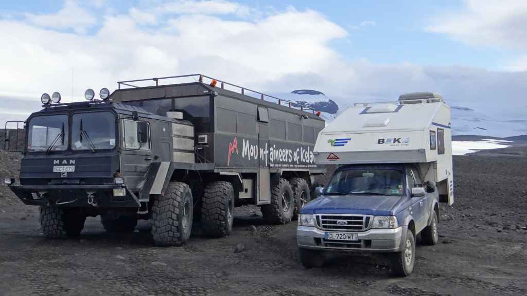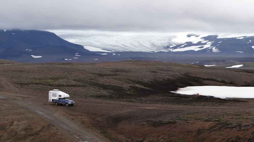 On peut même se tremper dans un « trou » d’eau chaude mais la météo ne nous y incite pas, alors on poursuit la piste qui serpente, ou pas, entre 2 grands glaciers. Vers 18h, on pose notre tortue sur une placette en bord de piste : on a la vue sur les géants de glace ! (N 64°44.560 / W 19°23.518). Le temps est très couvert et de petites pluies crépitent sur le toit : apparemment plus de fuite… à vérifier !