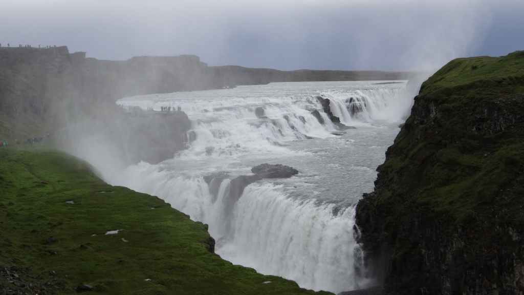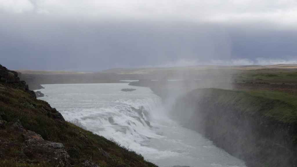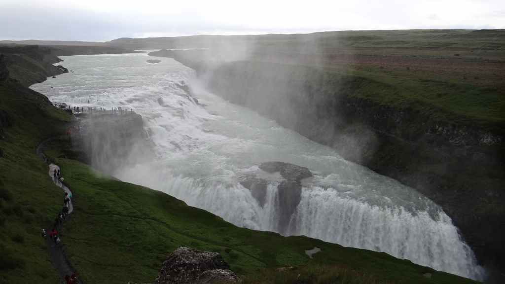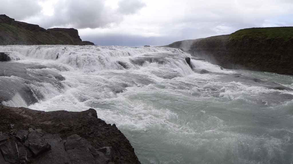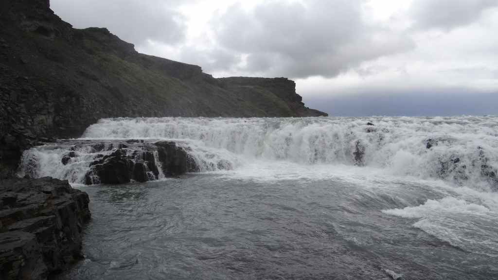 Après nos 2 heures de balade, nous reprenons la F35, direction les chutes de Gullfoss. Nous retrouvons la civilisation et ses hordes de touristes. Malgré la pluie, les cascades sont belles et impressionnantes.