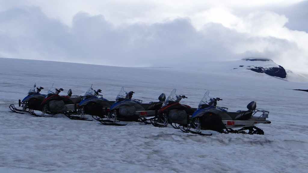 Après de longues minutes d’admiration, nous repartons et tentons une piste, la 551, qui monte vers le glacier le plus accessible. En arrivant vers le bout du chemin, des véhicules hors normes sont parqués près du géant blanc. Ce sont des camions-bus 8 roues motrices aux pneus démesurés qui emmènent les touristes en balade sur le glacier ! Nous nous garons à côté de l’un d’eux et continuons à pied sur 300 m avant de mettre nos baskets sur la glace recouverte de neige. Une chenillette et des motoneiges attendent les touristes de demain. Il est en effet 18h15 et il n’y a plus âme qui vive à cet endroit. De nombreuses traces d’engins sillonnent le glacier et me donne l’envie de mettre les crampons pour gravir les sommets voisins, certes pas très impressionnants mais attirants ; ce sera pour une autre fois…
