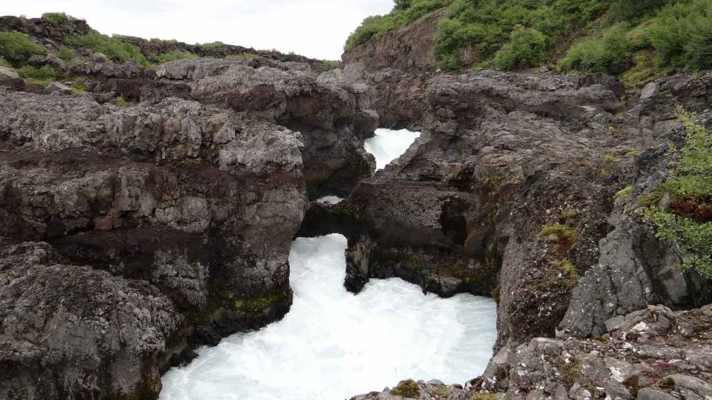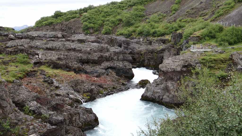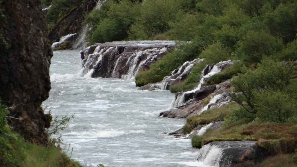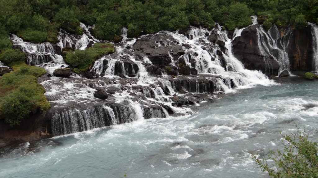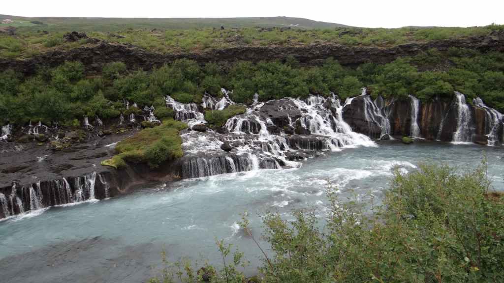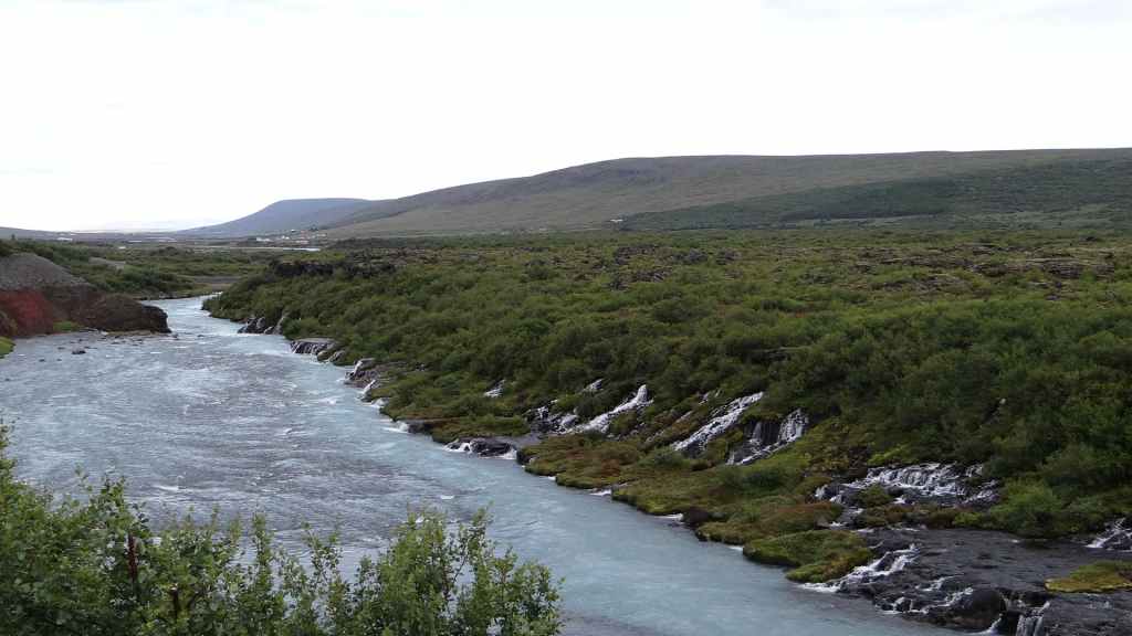 Lever matinal avec le soleil au travers des stores occultants ! Grand bleu au travers des fenêtres !!! Mais le temps de partir, les nuages accourent de toute part et nous précèdent au fur et à mesure de notre progression sur la piste. On souhaite le soleil sur les cascades que nous allons visiter, mais c’est peine perdue… On arrive sur le site de Hraunfossar où les petites cascades, qui s’étirent sur environ 500 m, tombent dans une rivière d’un bleu éclatant. Nous reprenons la route vers le nord-ouest.