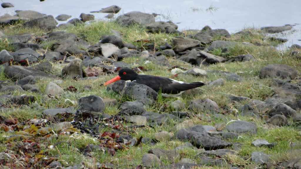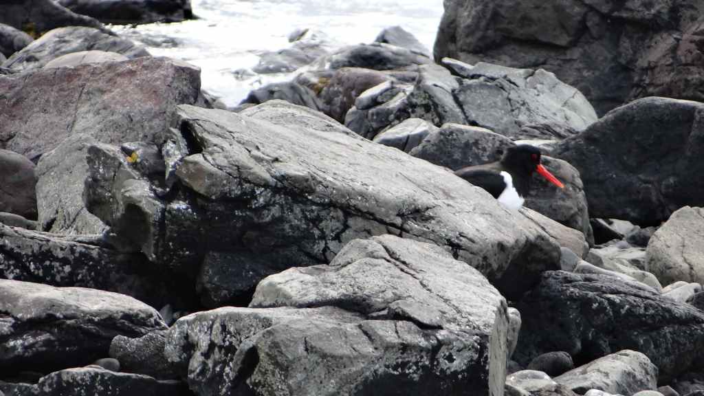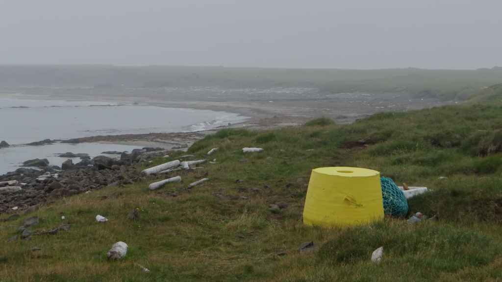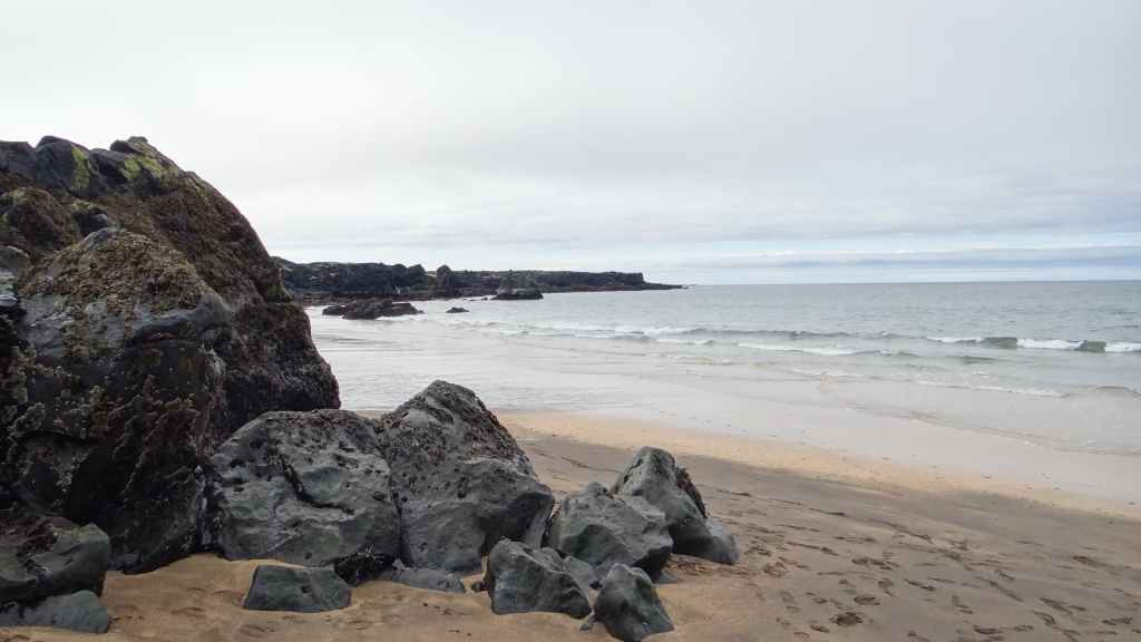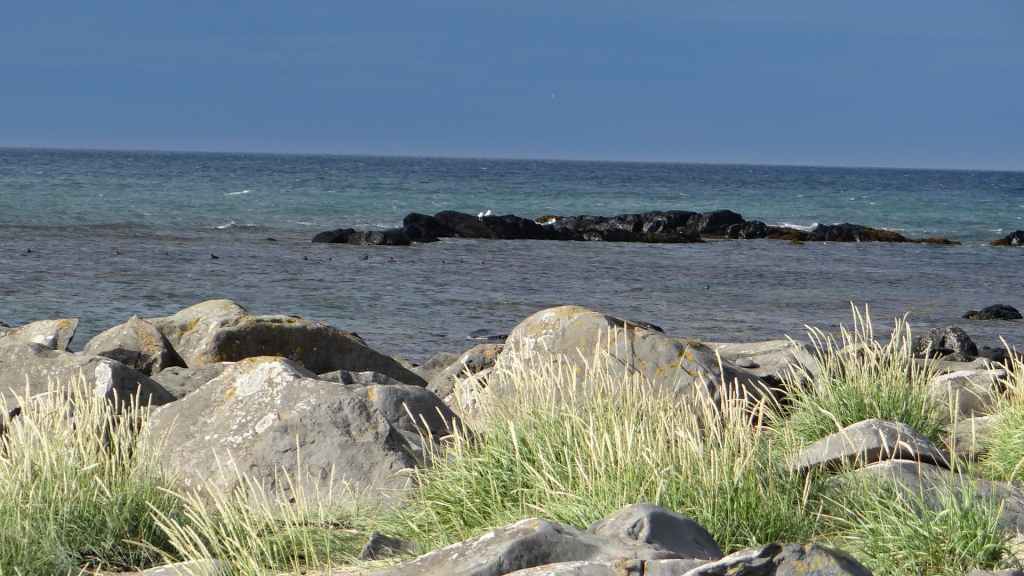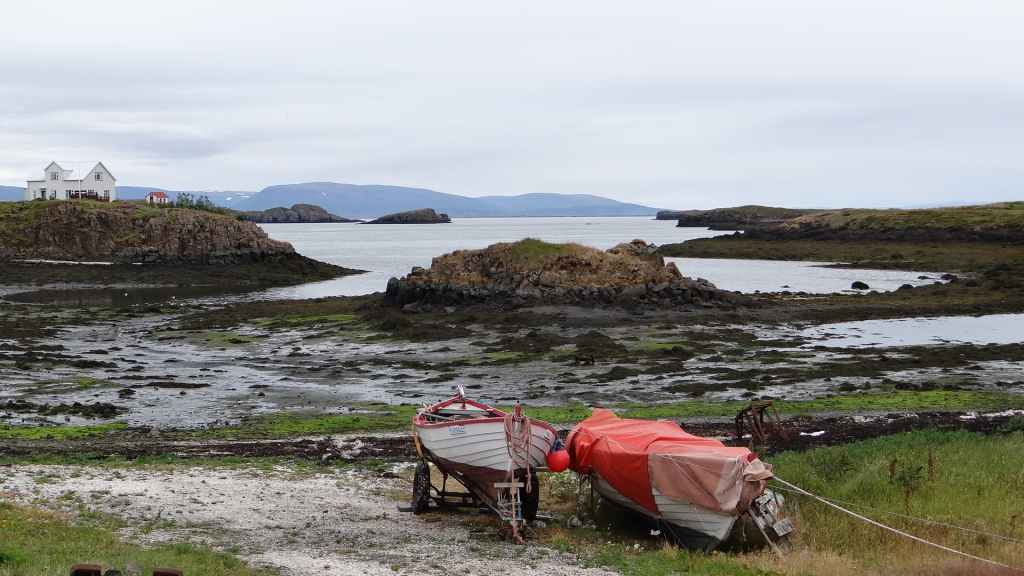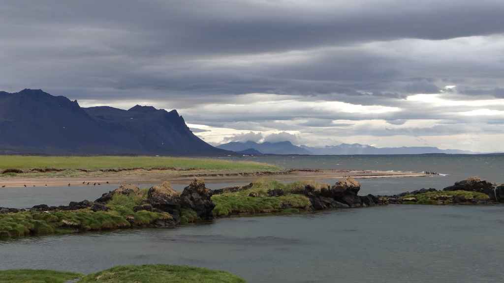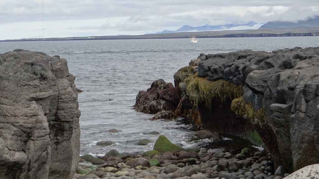Après un dernier point météo internet, pris sur le wifi non codé d’un café du village et qui nous annonce un après-midi exceptionnel pour demain, nous nous rendons dans le petit port où nous avions vu les macareux. Mais, comme à leur habitude, ils ont quitté les lieux il y a quelques jours pour migrer vers des cieux plus cléments. En cette toute fin d’après-midi, nous venons poser notre tortue à quelques encablures du village, au bord de la mer (N 65°31.114 / W 13°47.541). Nous en profitons pour errer sur la plage pour récolter quelques galets. Le ciel s’est de nouveau couvert et la pluie refait son apparition en soirée… Ça manquait !