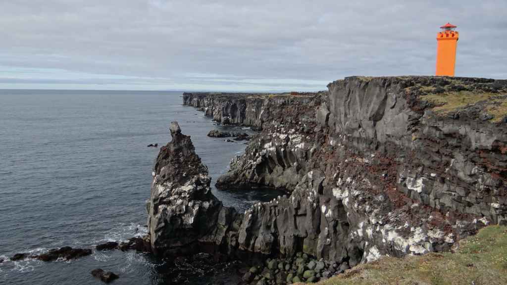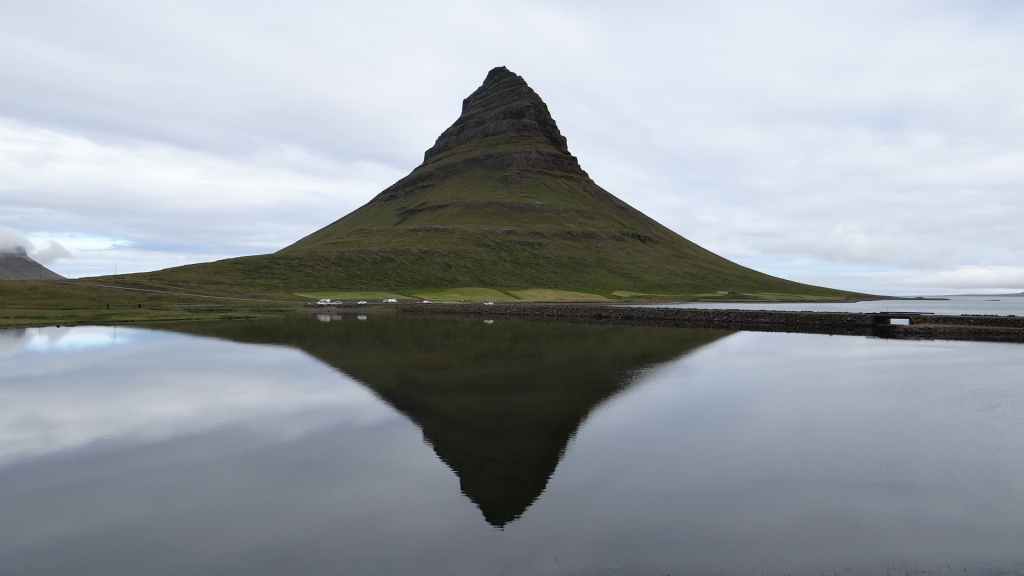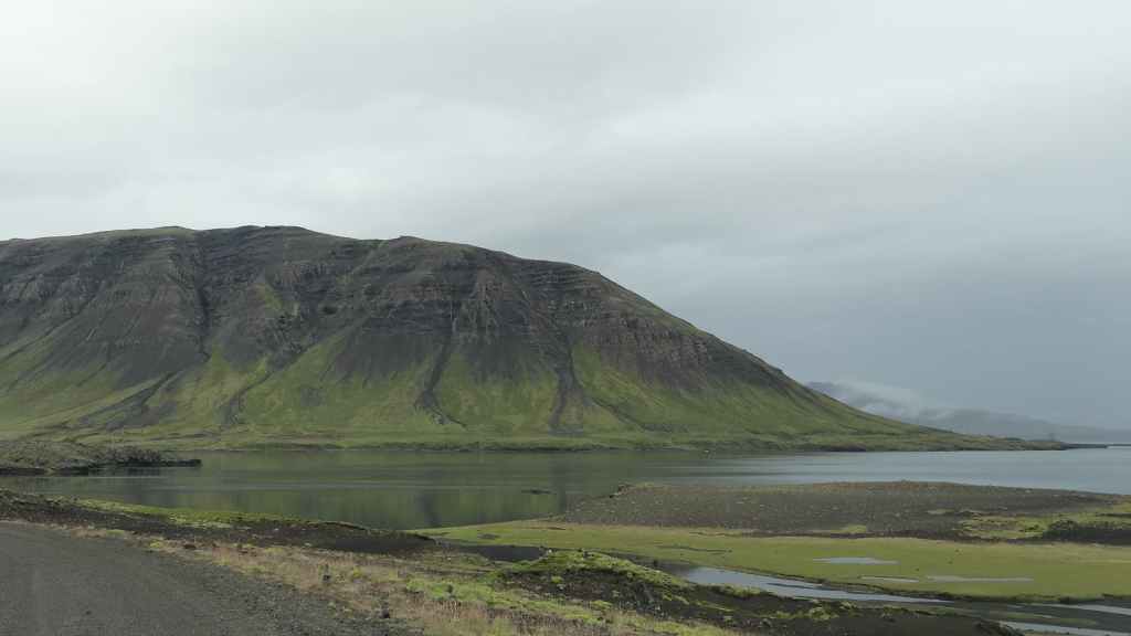 Au matin, la pluie a cessé mais le ciel est toujours gris. Nous continuons la piste au milieu de la lave jusqu’à la route qui conduit au village de Grundarfjordur, où nous trouvons une laverie automatique au 61 de la rue principale, et en Islande, c’est plutôt rare. Nous profitons du temps d’attente et des éclaircies pour aller voir le rocher souvent photographié, à la sortie du village, le Kirkjufell.
