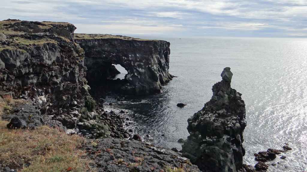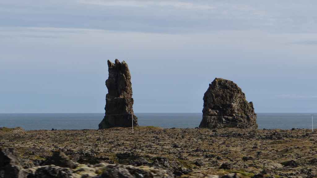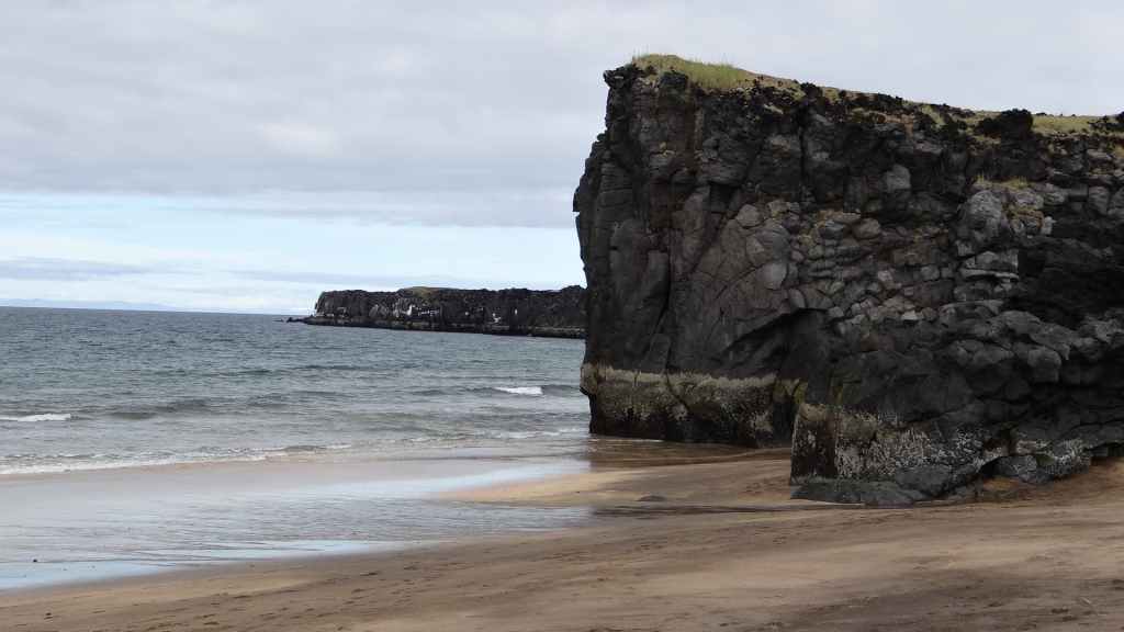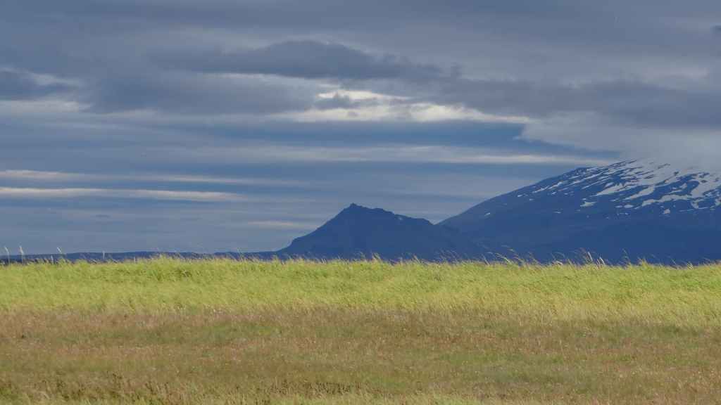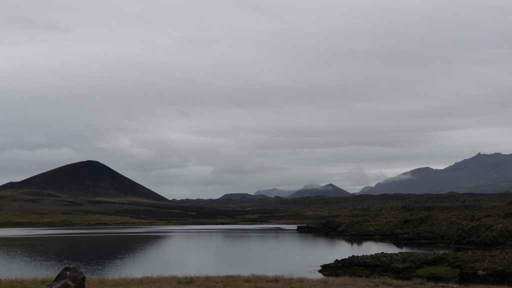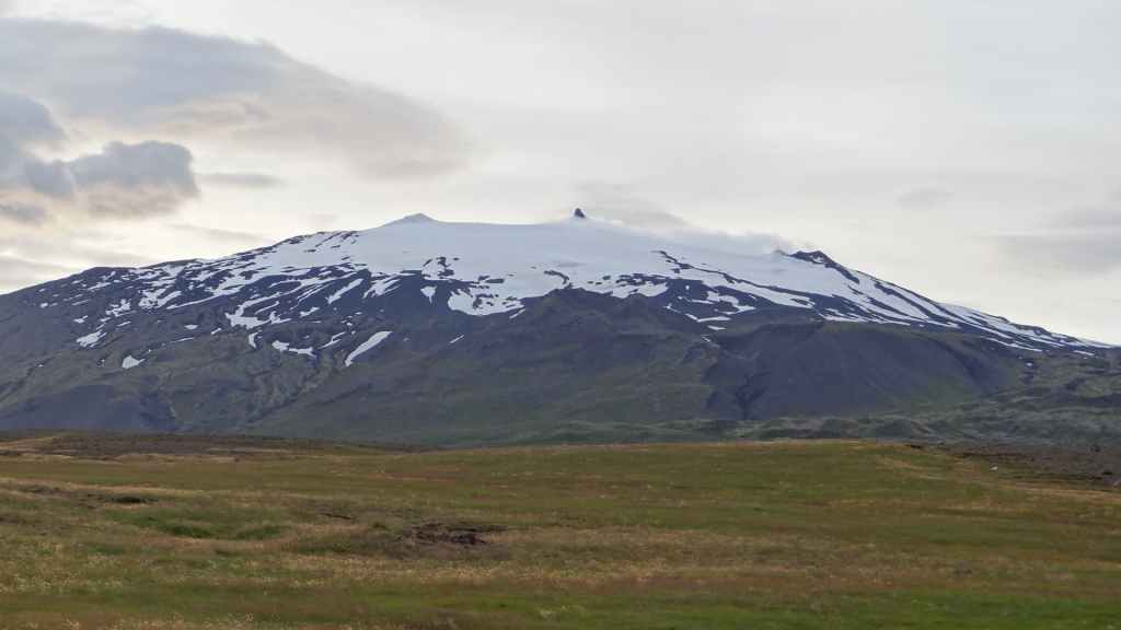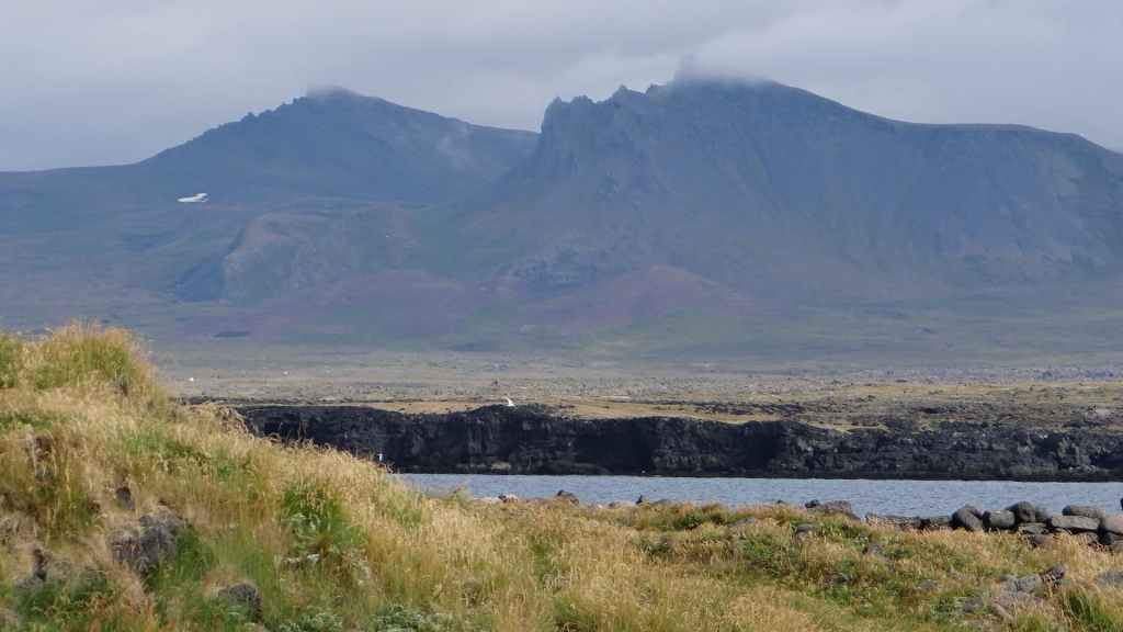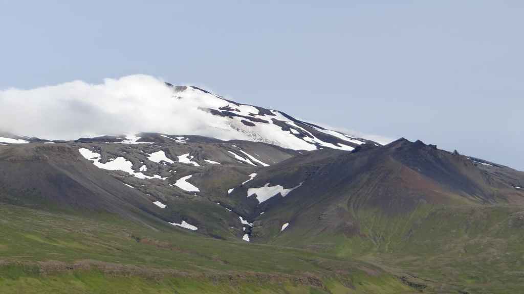Nous reprenons la route du sud de la péninsule en contournant le volcan couvert d’un glacier, le Snaefeljokull. Celui-ci commence à se découvrir de sa chape de nuages.