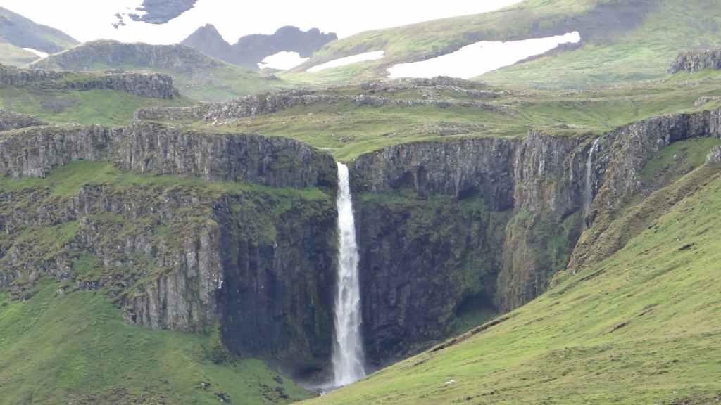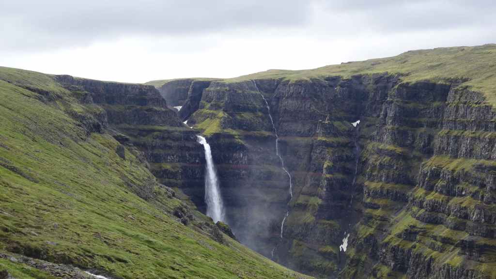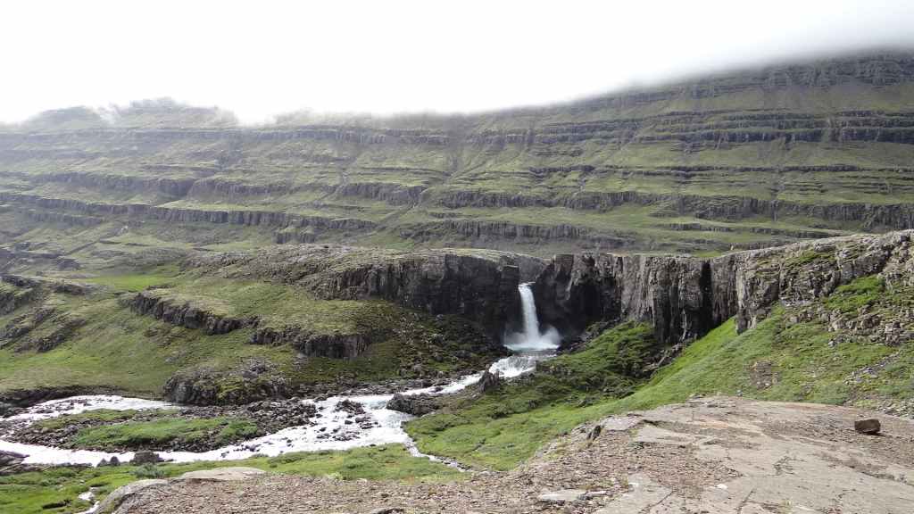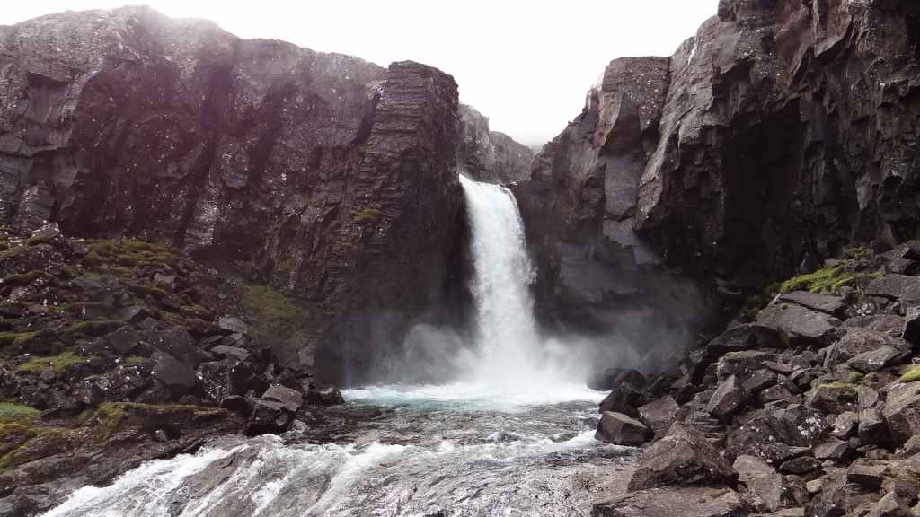Dès 7h50, nous démarrons la rando. Elle est facile et arrivons en vue de la Strutsfoss : nous sommes au dernier belvédère 1h30 après, alors comme nous avons encore de l’énergie à revendre, nous grimpons dans les herbages à moutons pour avoir une vue de haut sur la chute. On aperçoit même des petits coins de ciel bleu ! Après avoir admirer la chute principale, quelques autres et les paysages qui nous entourent, nous redescendons au parking. Du coup, nous avons fait 4 heures de marche avec environ 500 m de dénivelé.