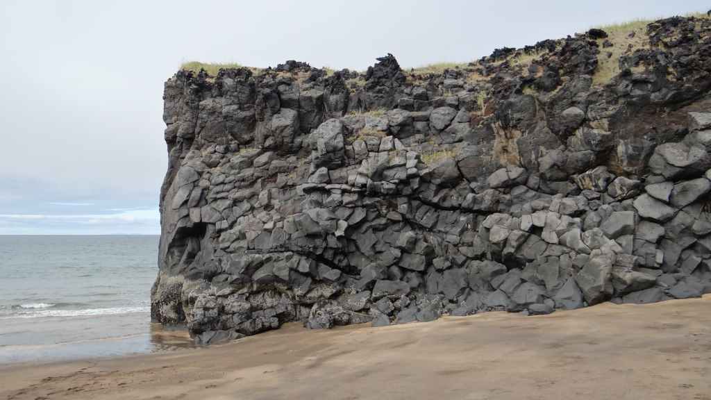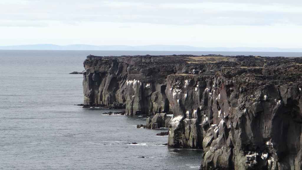 Je tente, également, de refaire l’étanchéité de l’un des lanterneaux qui fuit toujours. Puis, après nous être posés pour le repas sur un magnifique belvédère au-dessus des falaises, nous nous rendons à l’extrémité de la péninsule. Nous nous arrêtons sur une petite plage de sable blond coincée entre des falaises d’un noir charbon : Skardskik, où nous trempons nos pieds dans la mer du Groënland. La froidure de l’eau ne nous permet pas de rester bien longtemps. Nous continuons jusqu’à la « falaise aux oiseaux », qui est en fait une falaise noire et blanche, de roches basaltiques et de fientes de goélands et d’autres oiseaux tels que guillemots, manchots et pingouins, mais ceux-ci sont déjà partis vers d’autres contrées…