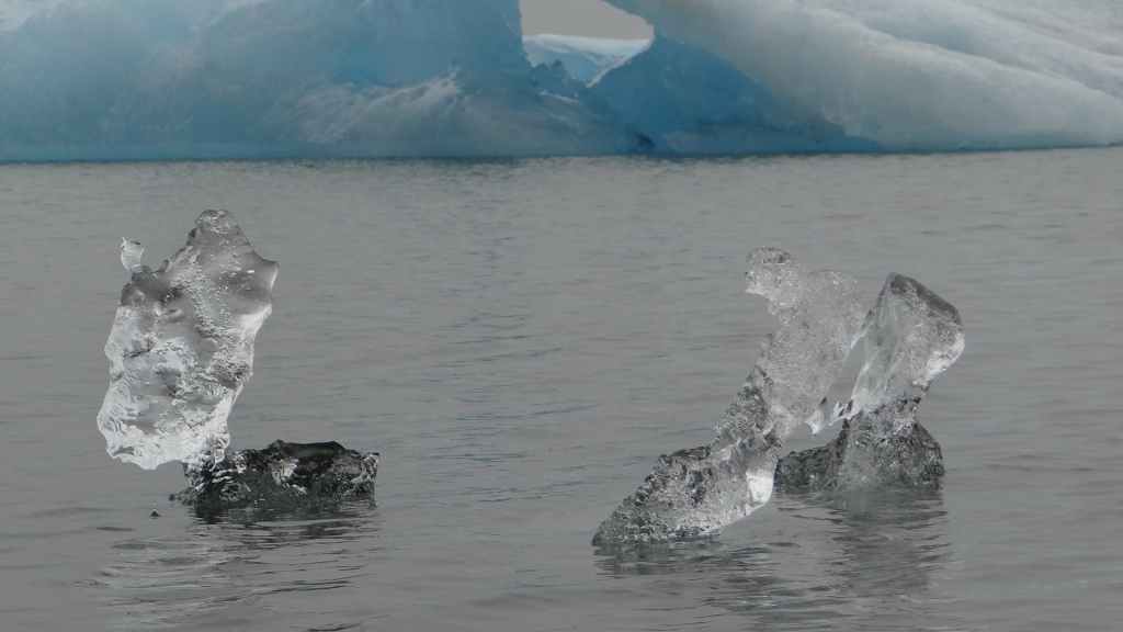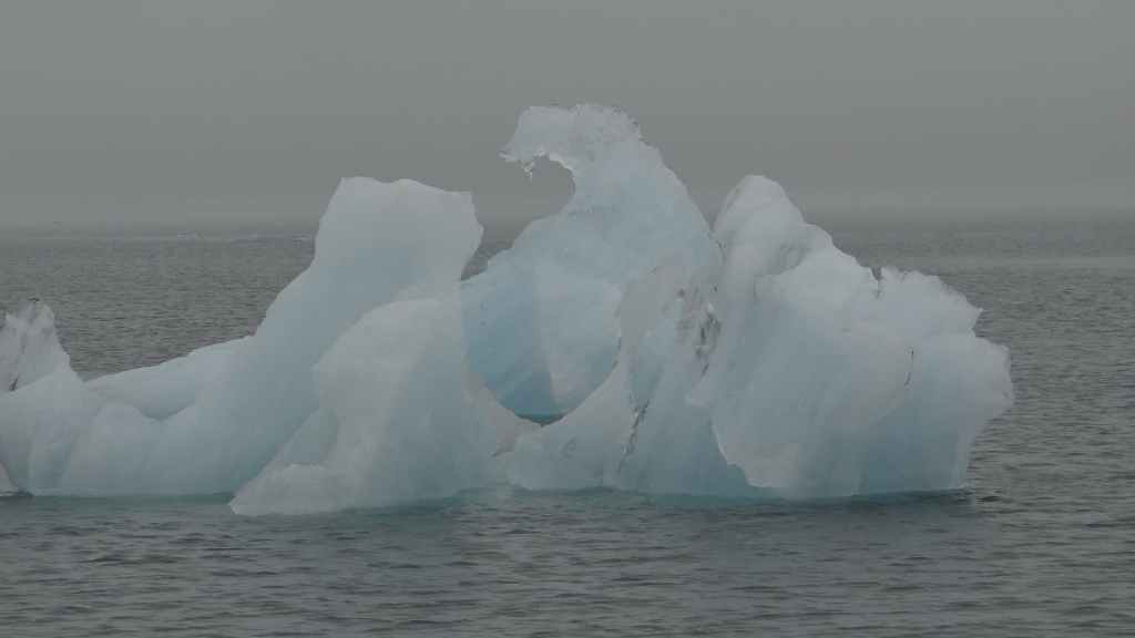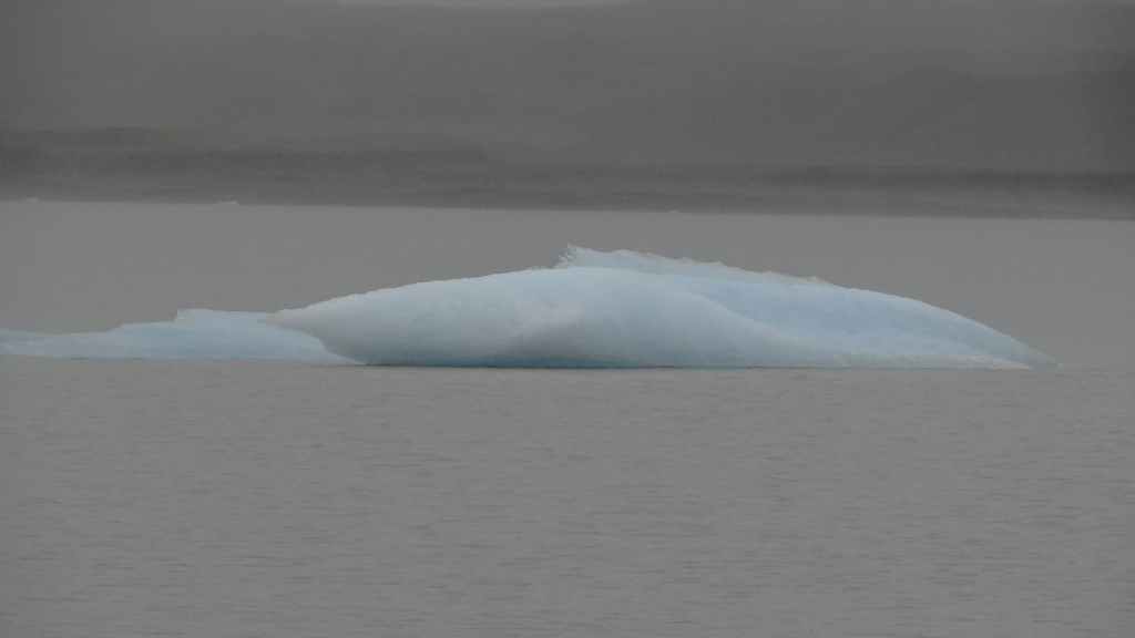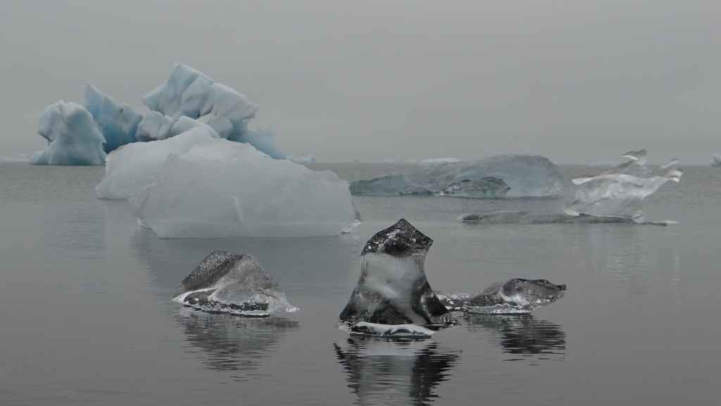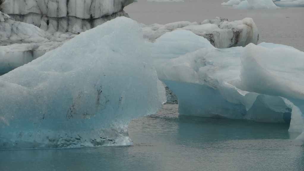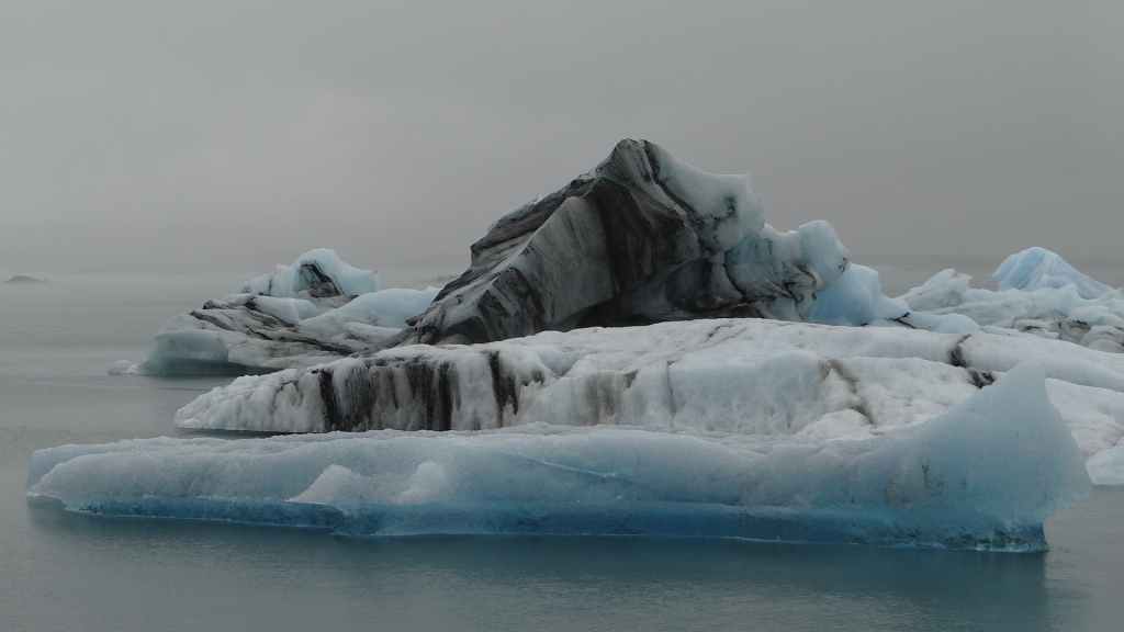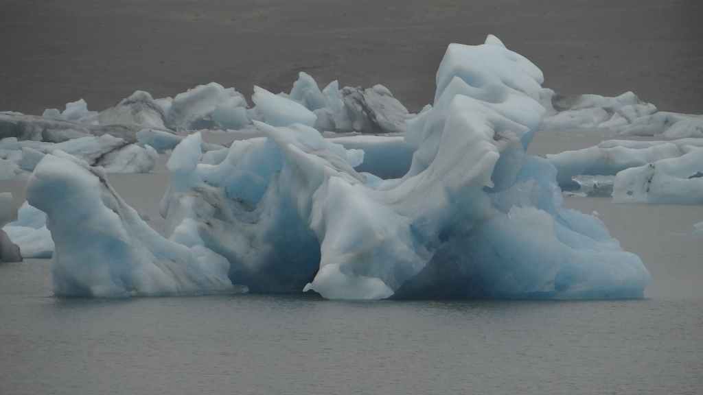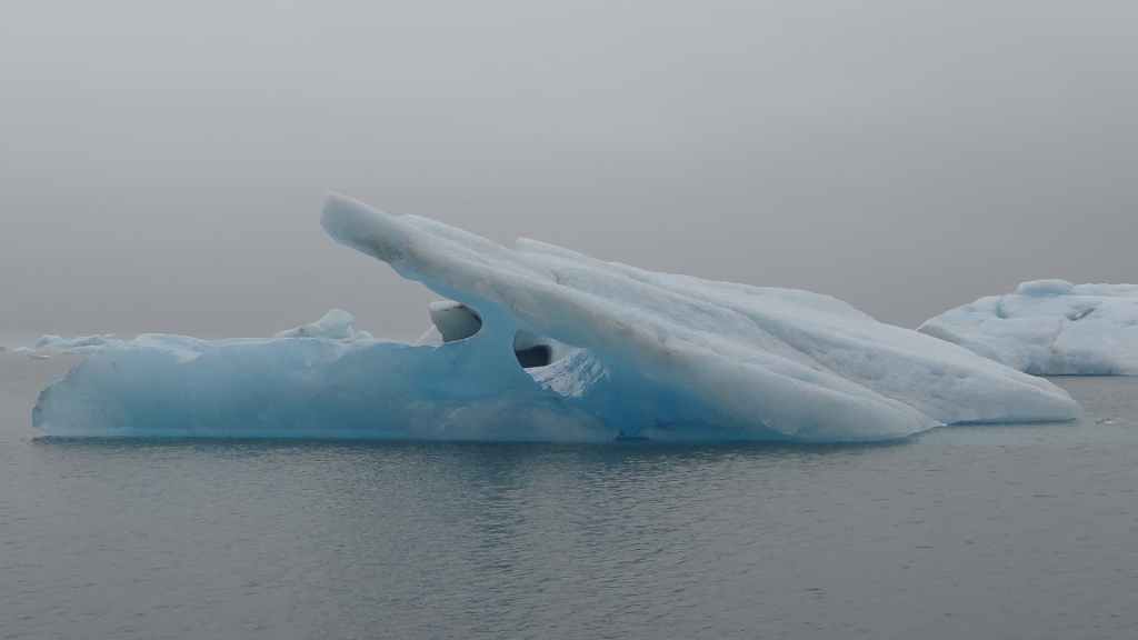 Contrairement au premier lac où nous apercevons la base du glacier, le second et le plus réputé, le Jokulsarlon est entouré de brume et de brouillard et donne une ambiance surréaliste au paysage… D’autant plus que quelques bateaux de touristes sillonnent et zig-zaguent autour des icebergs d’un bleu extraordinairement beau : on pourrait croire à une expédition Cousteau ! D’autres icebergs ressemblent à des morceaux de glace Vienetta, et d’autres encore sont d’une transparence cristalline. Nous restons longtemps, sous la bruine, à admirer ces sculptures somptueuses que nous offre la nature.
